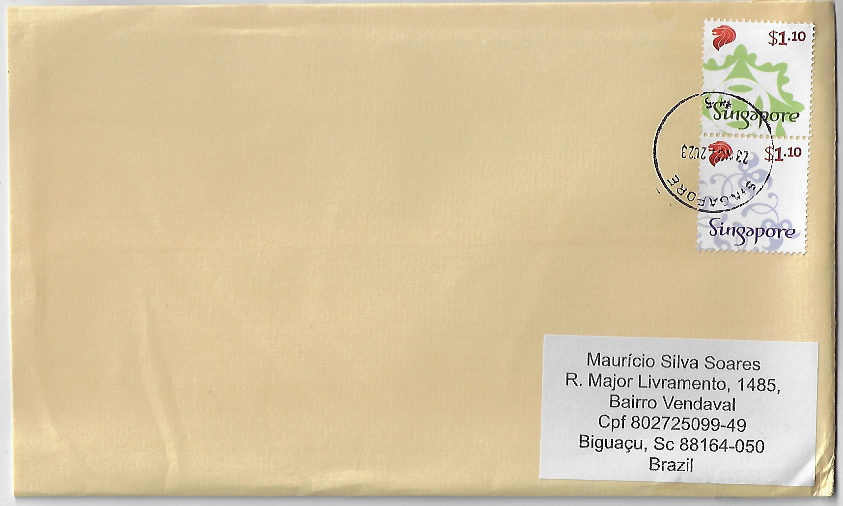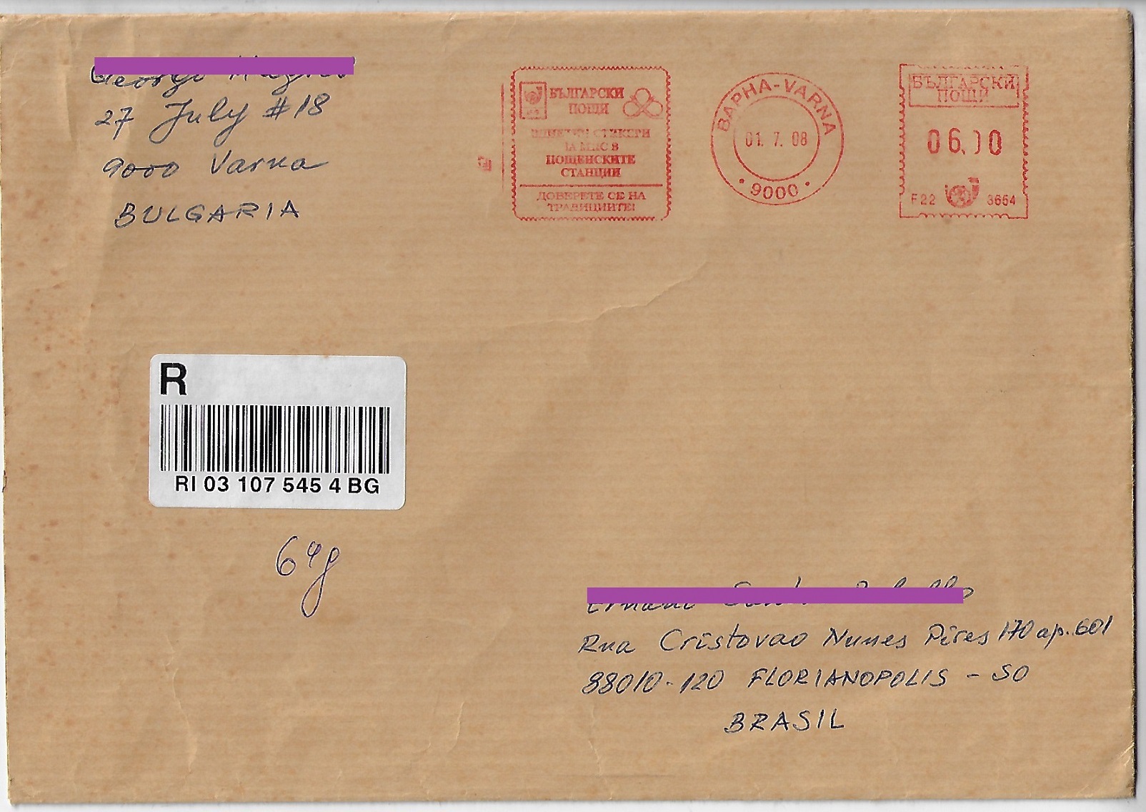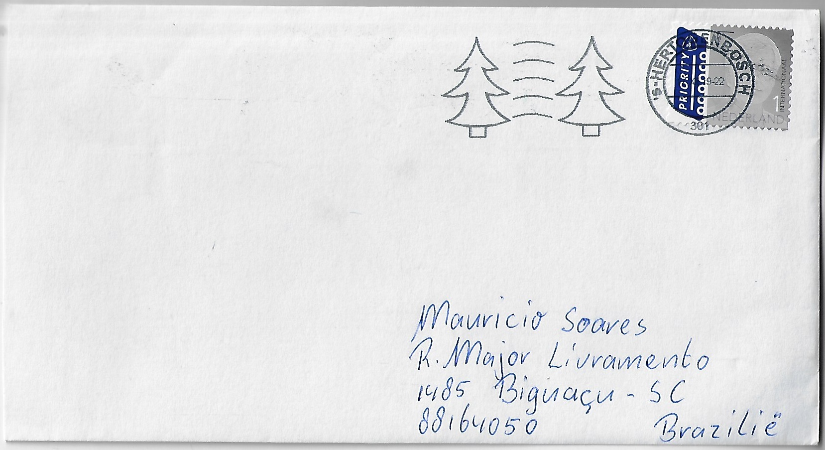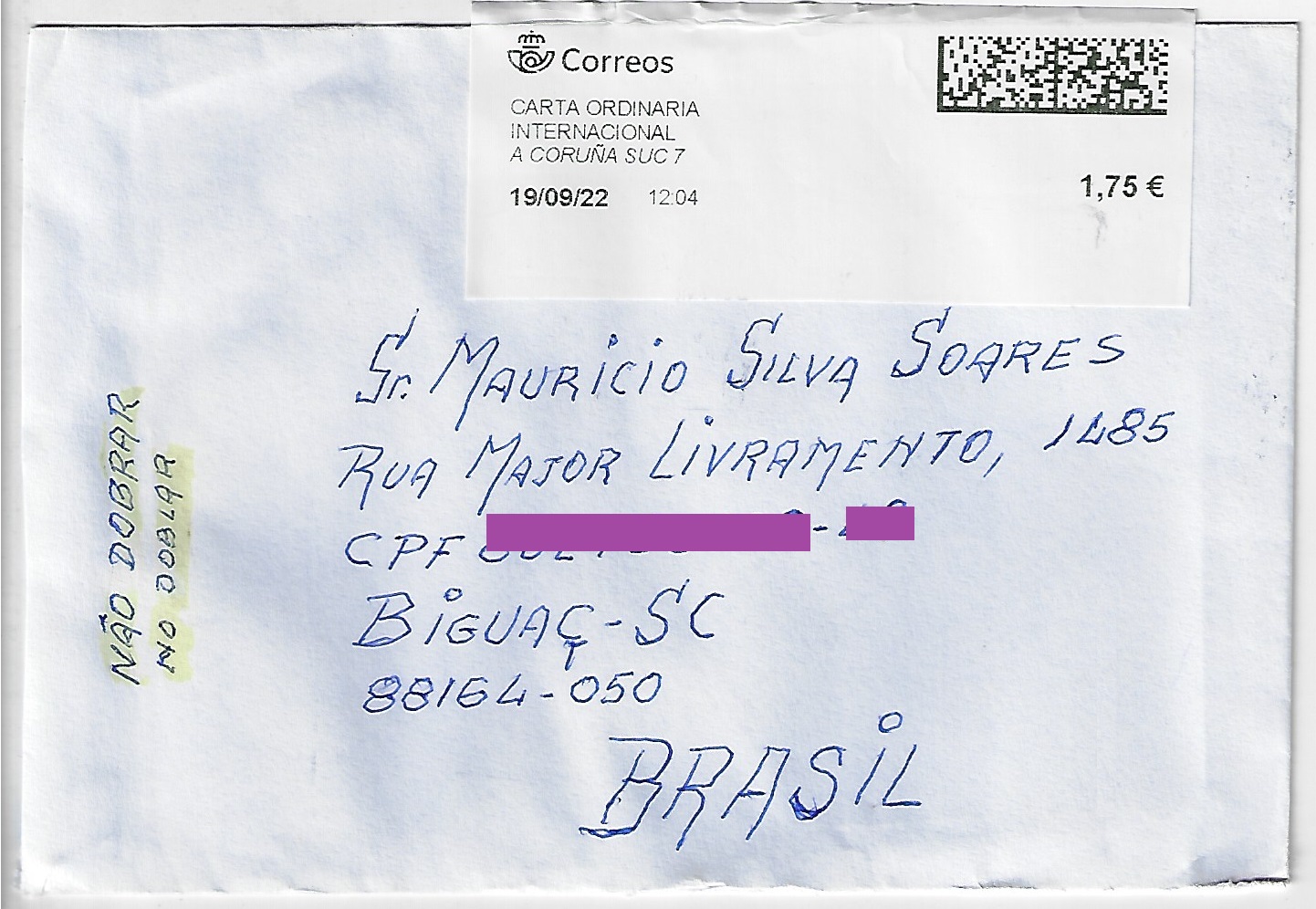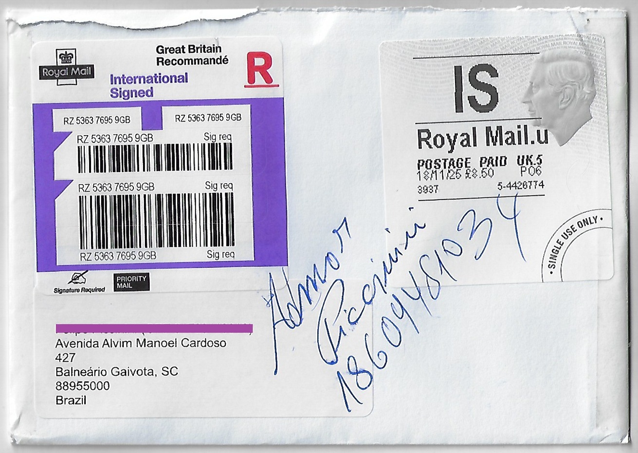 | 84865 | África do Sul, 2022, envelope prioritário registrado enviado de Vredenburg (21/12) para Biguaçu, porteado com franquia mecânica Web RePost (aka "PAT Label") | 10,00 | Foto |