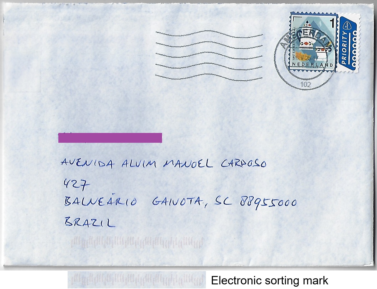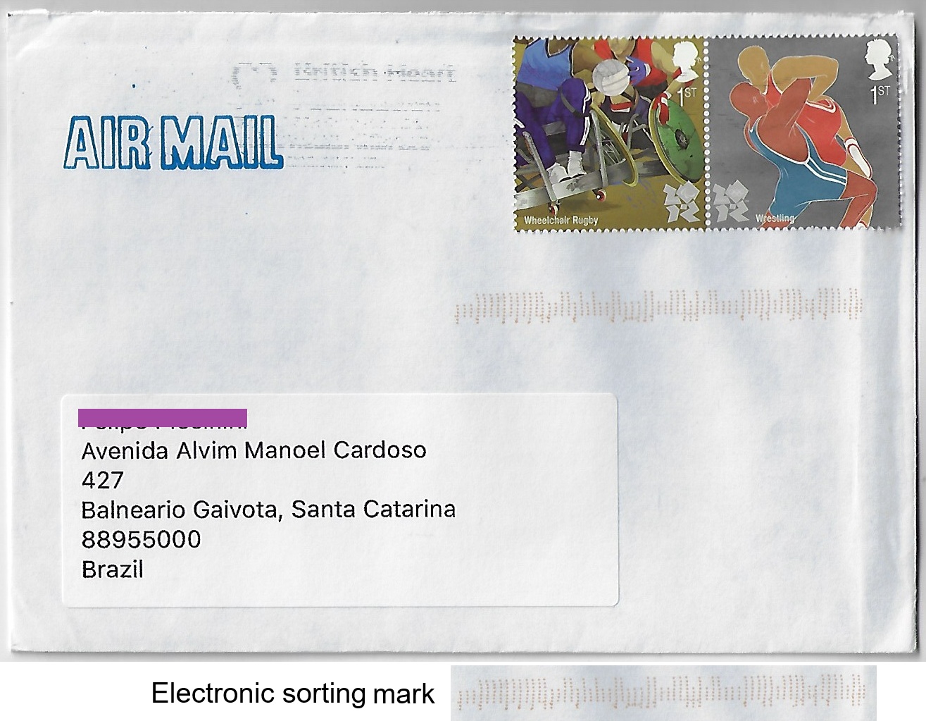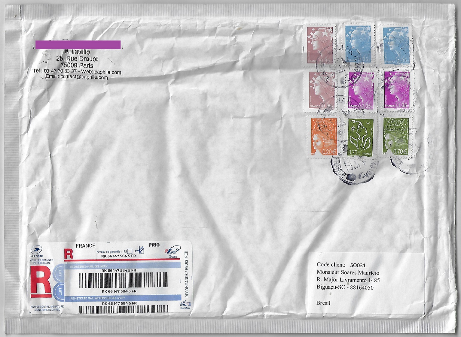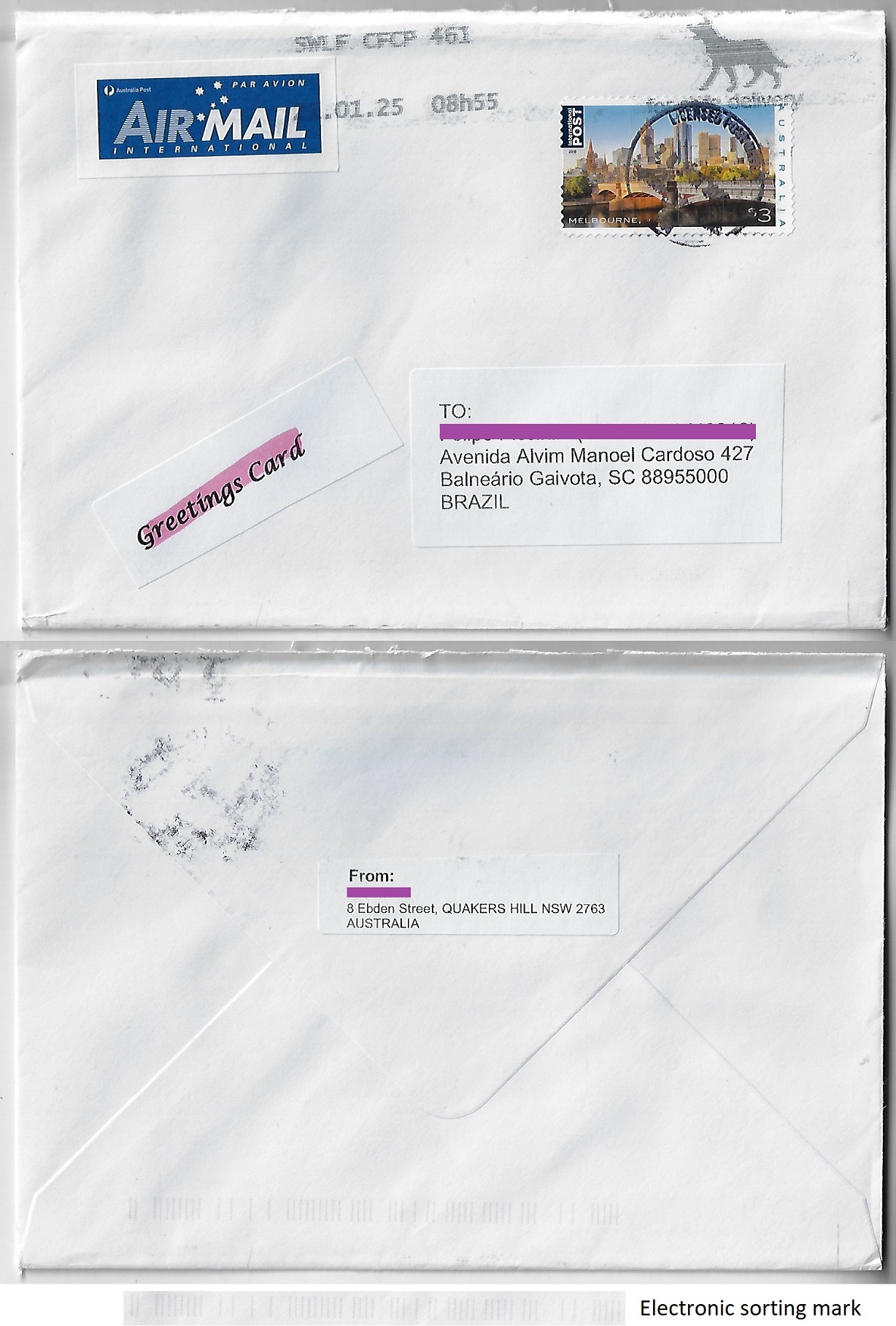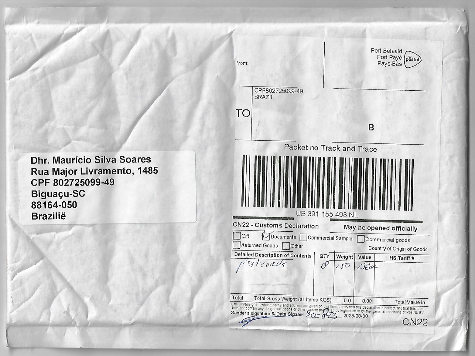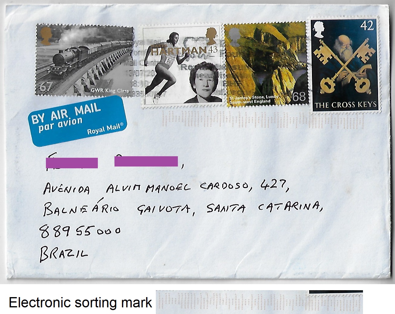 | 84865 | África do Sul, 2022, envelope prioritário registrado enviado de Vredenburg (21/12) para Biguaçu, porteado com franquia mecânica Web RePost (aka "PAT Label") | 10,00 | Foto |