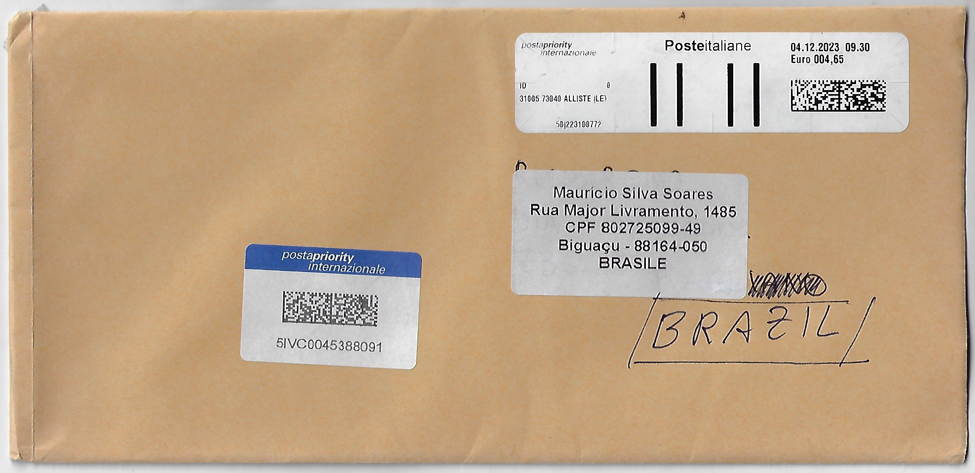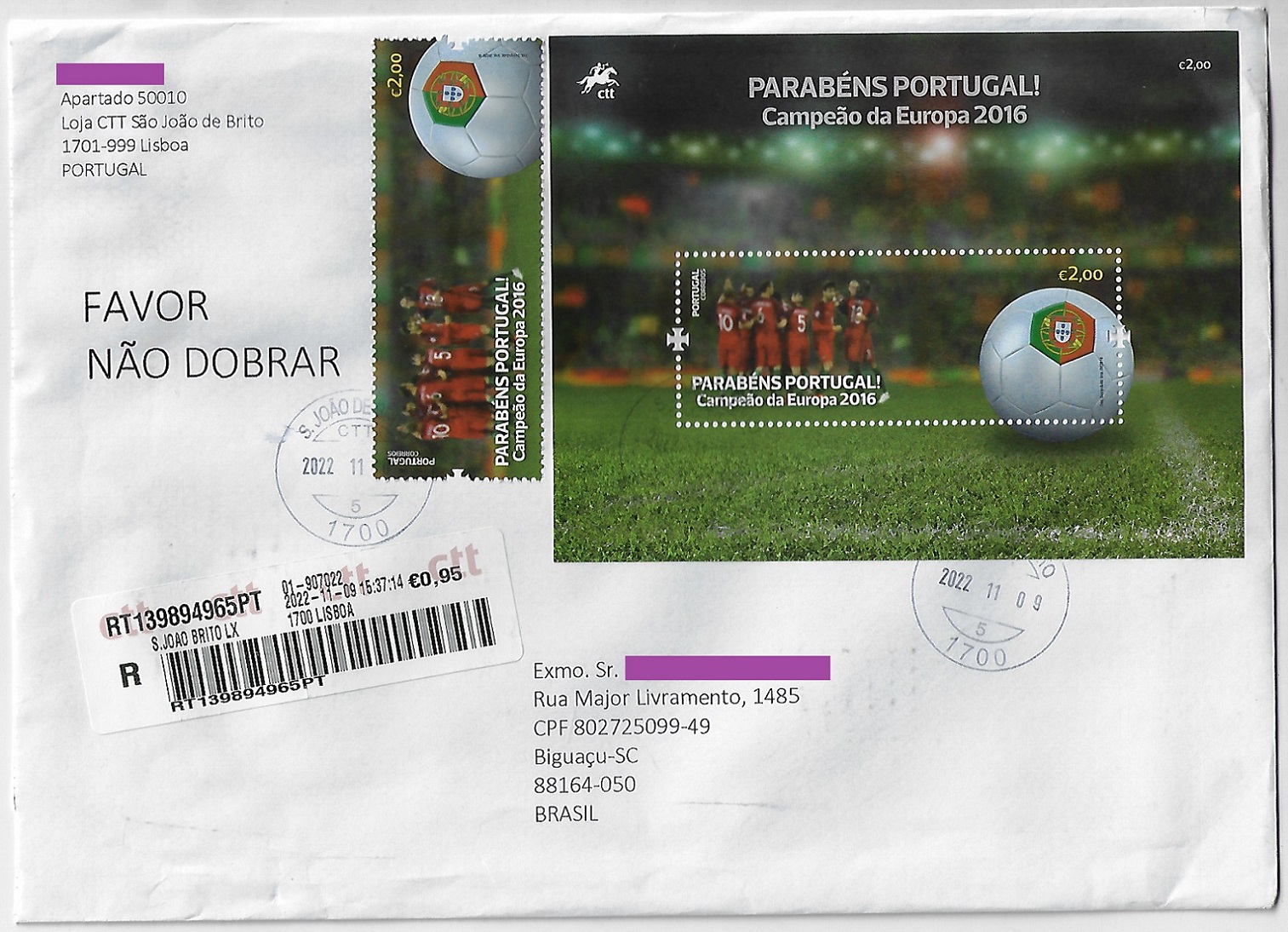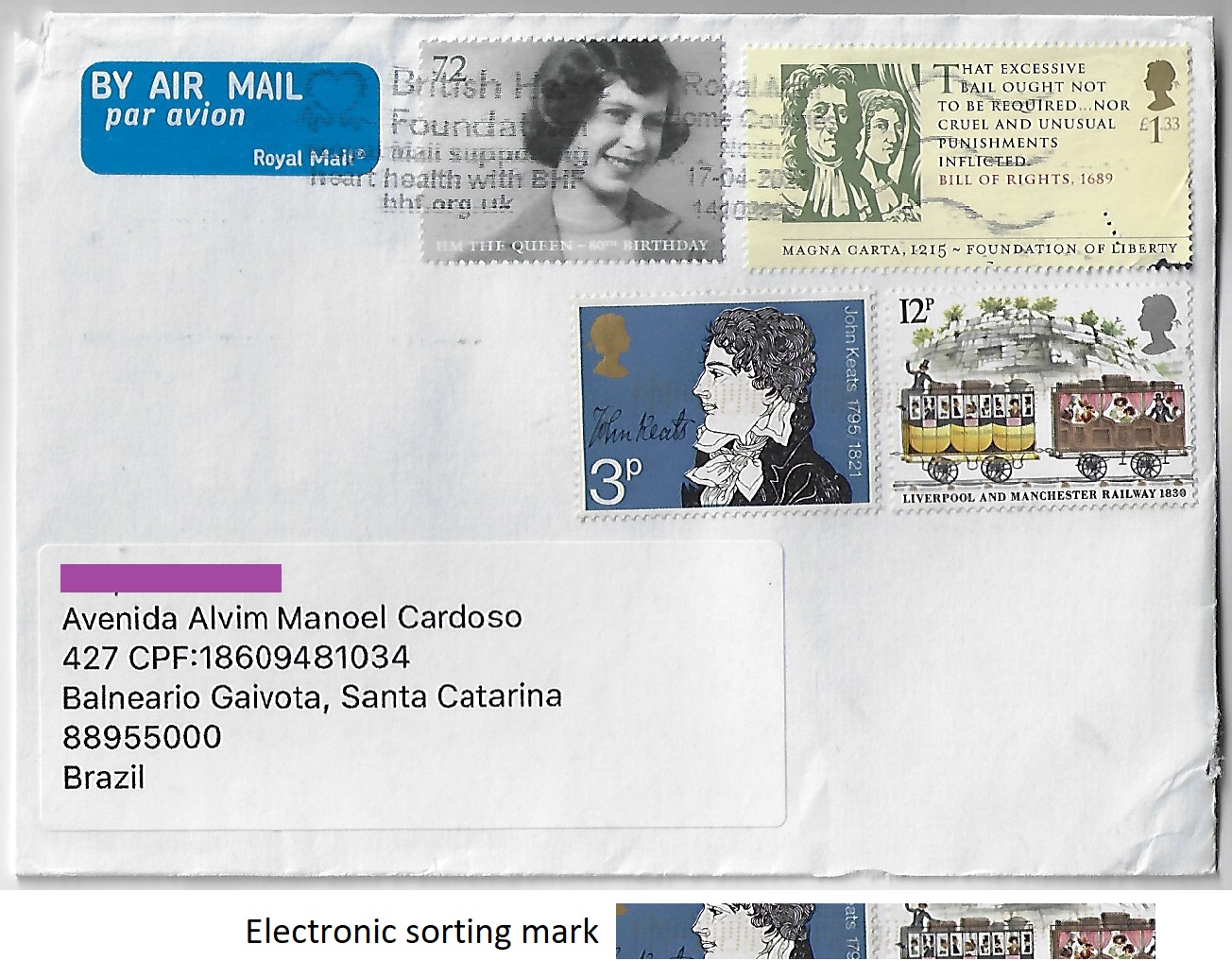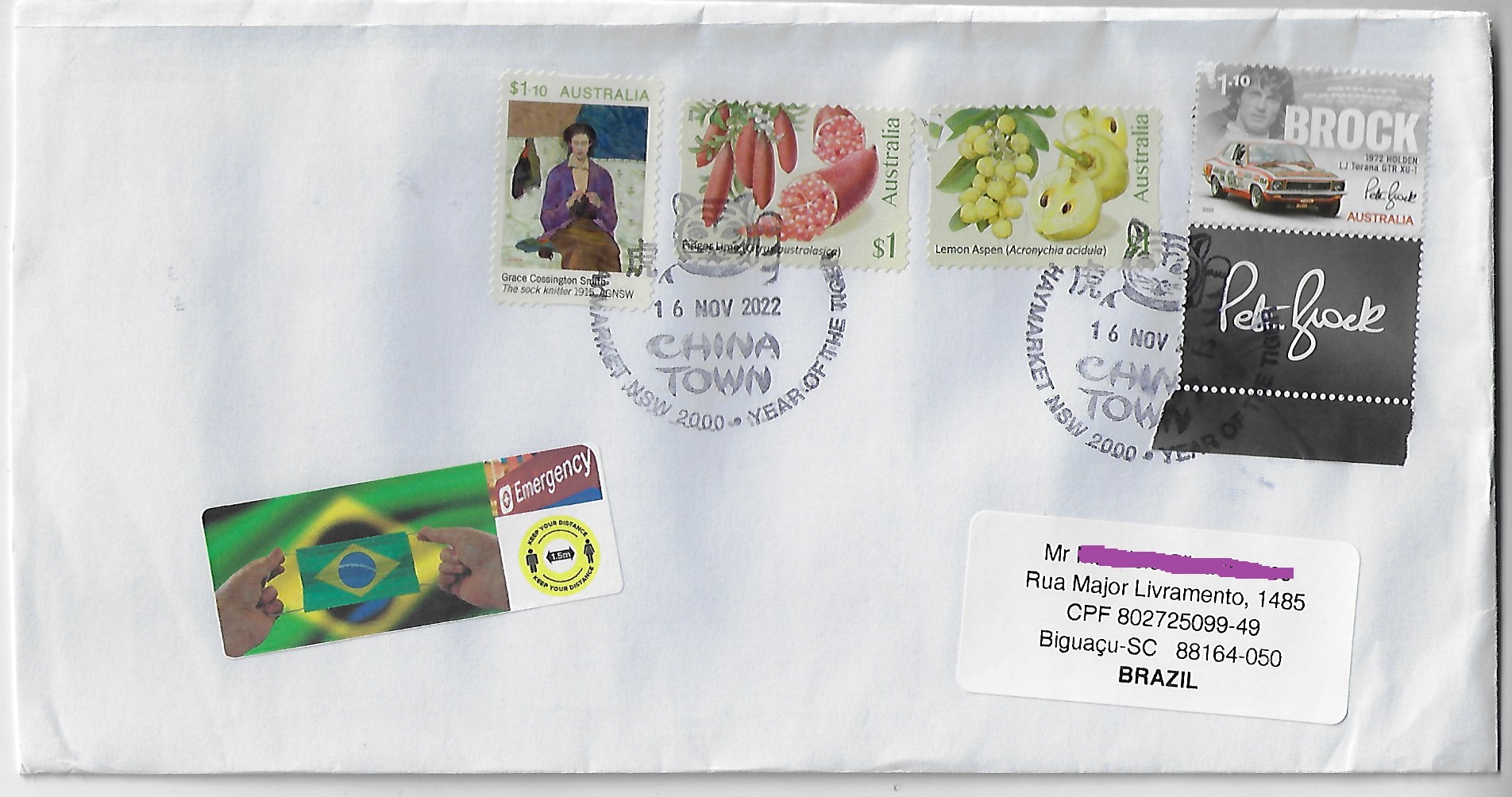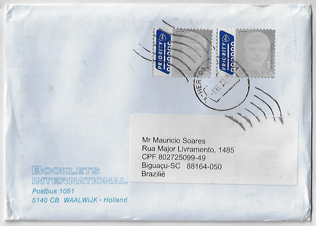 | 84865 | África do Sul, 2022, envelope prioritário registrado enviado de Vredenburg (21/12) para Biguaçu, porteado com franquia mecânica Web RePost (aka "PAT Label") | 10,00 | Foto |