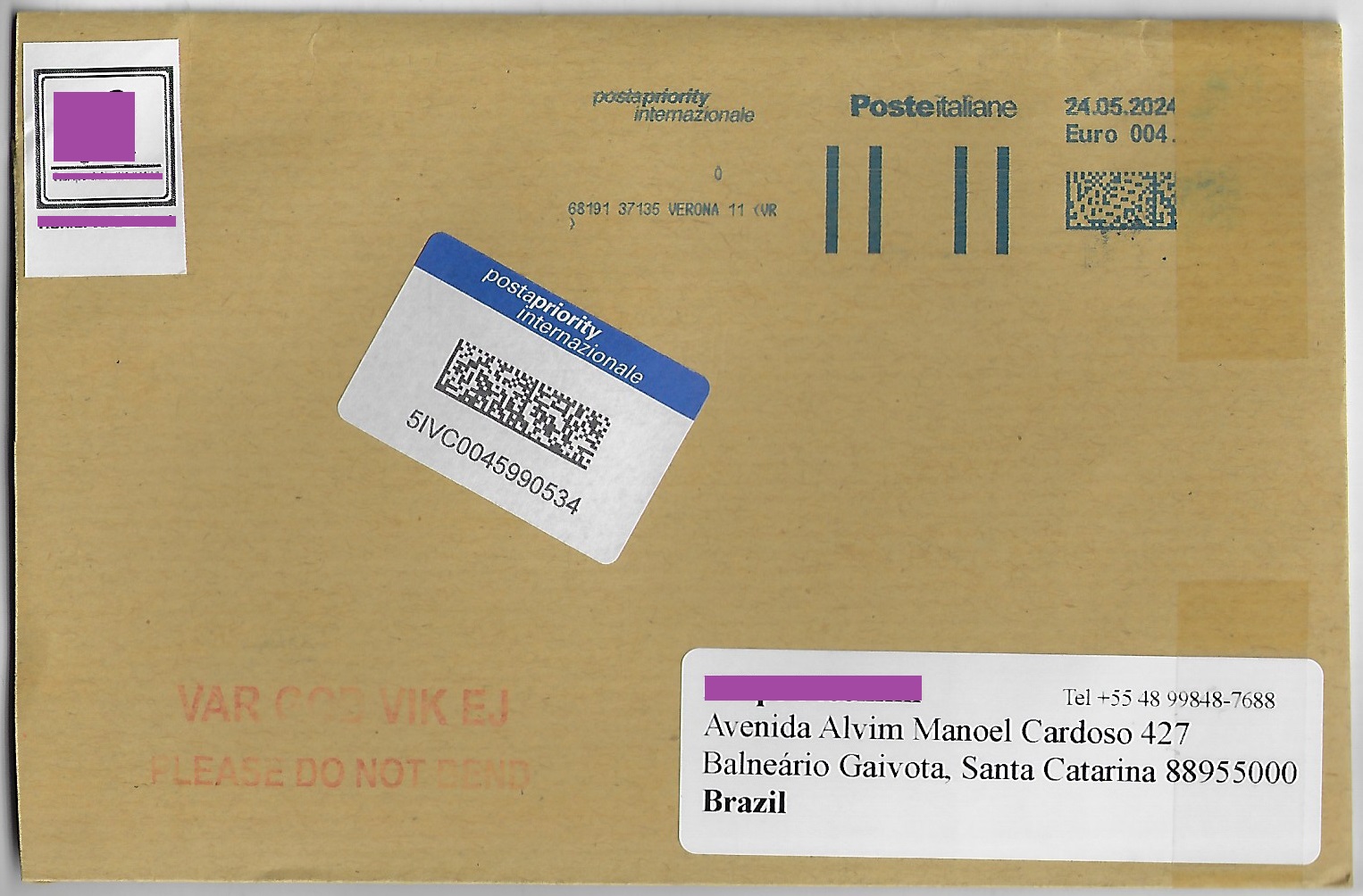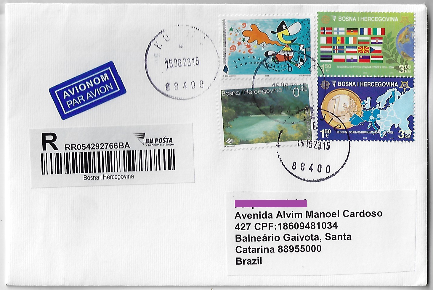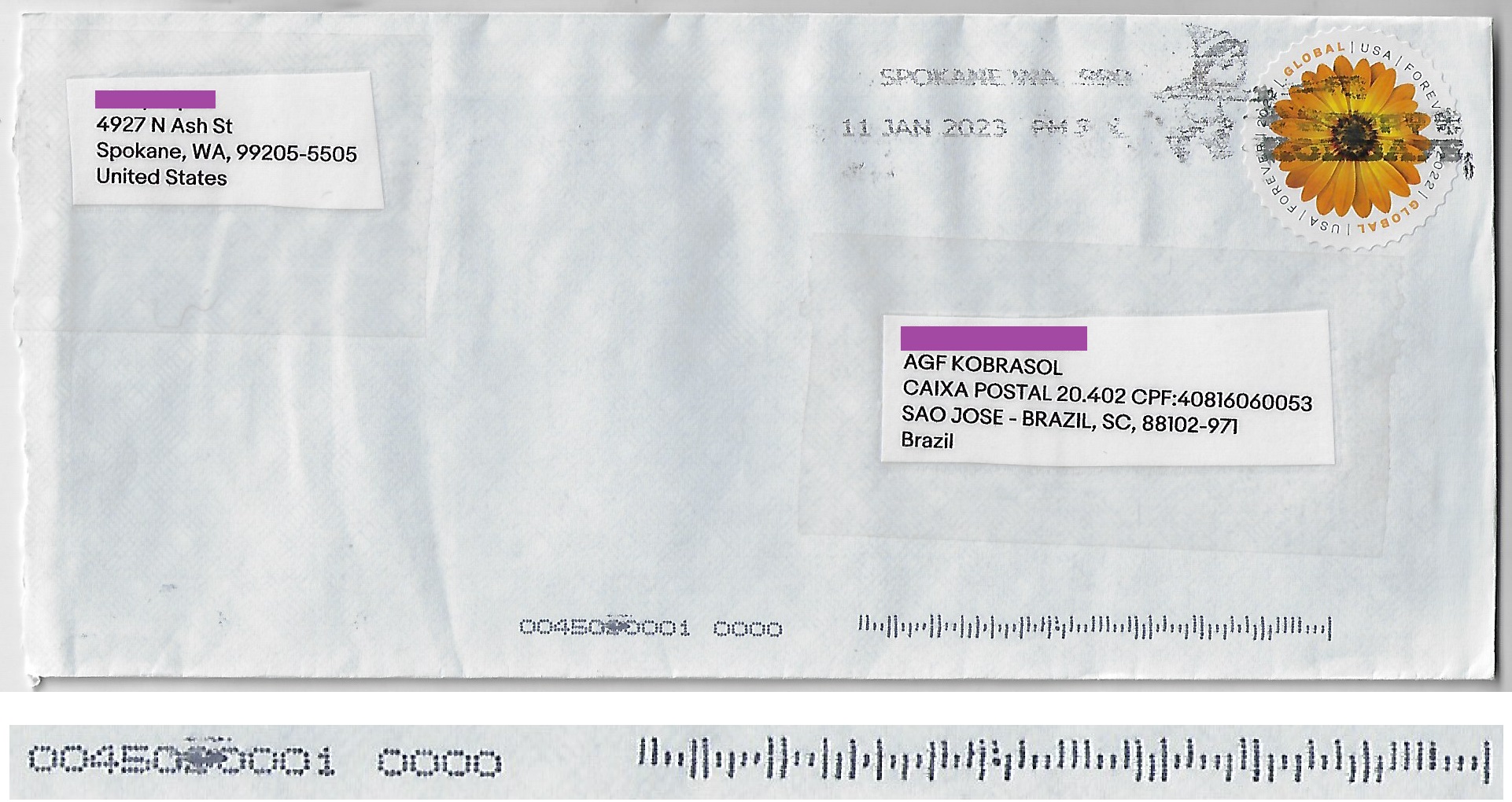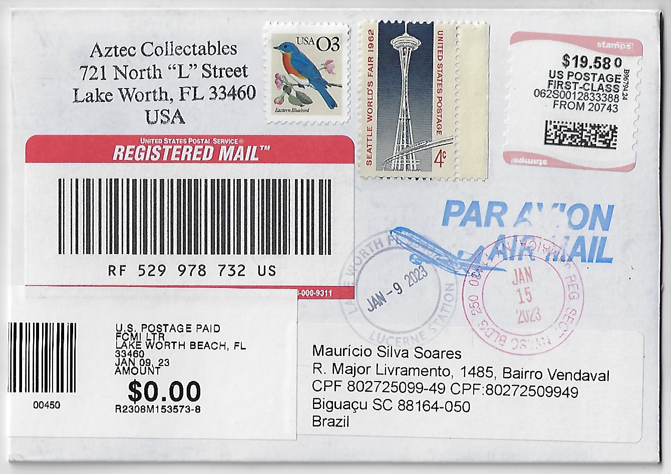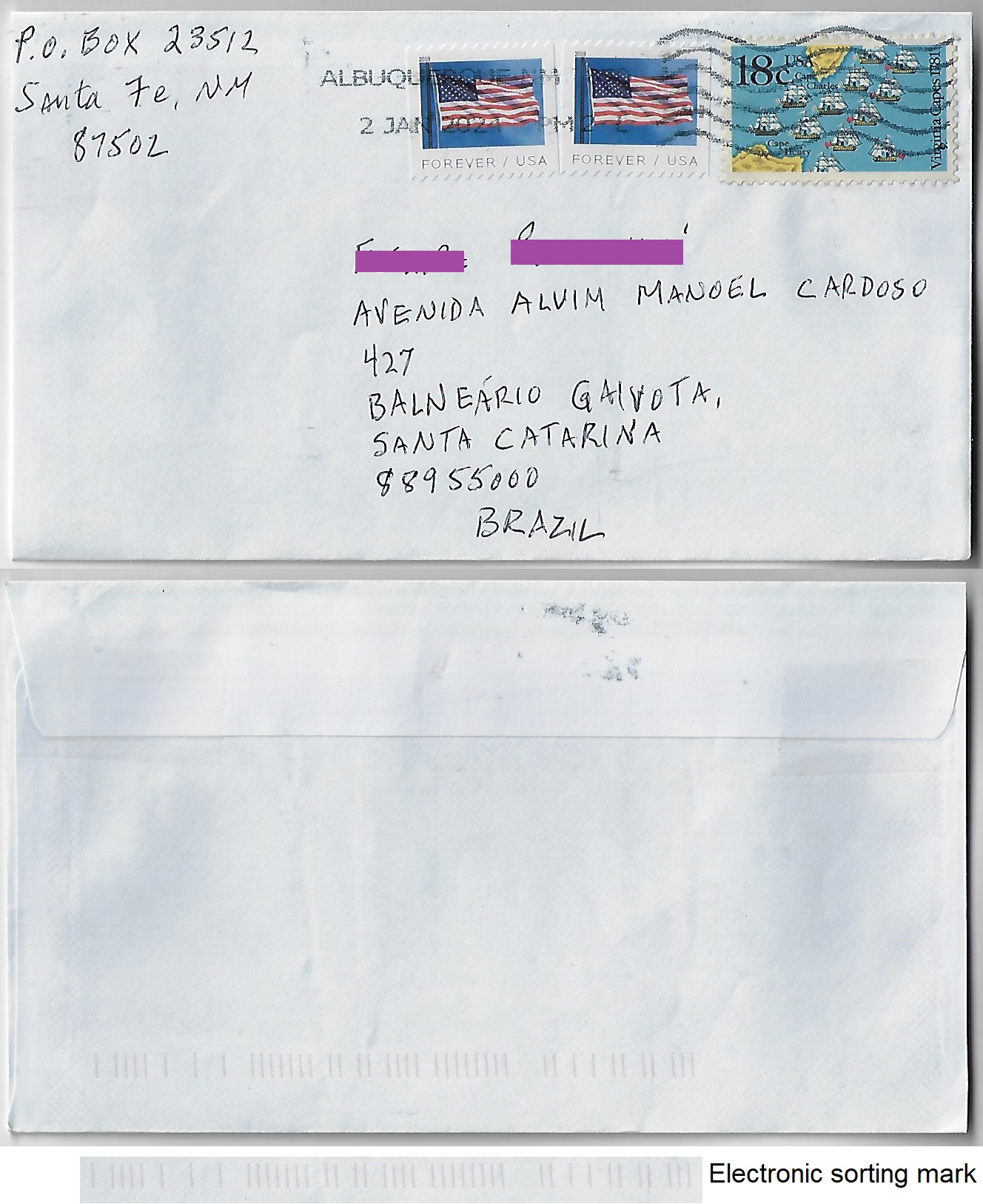 | 84865 | África do Sul, 2022, envelope prioritário registrado enviado de Vredenburg (21/12) para Biguaçu, porteado com franquia mecânica Web RePost (aka "PAT Label") | 10,00 | Foto |