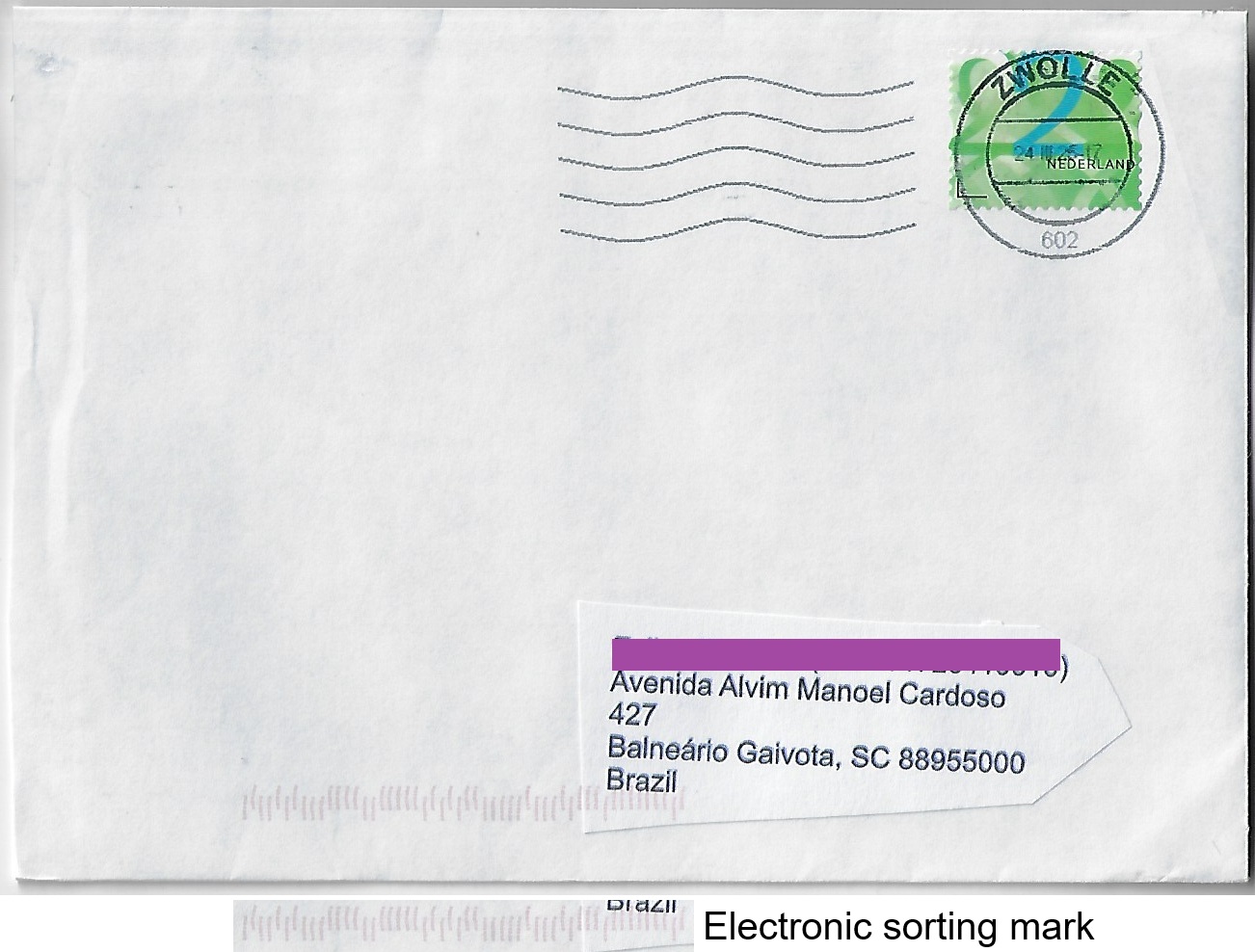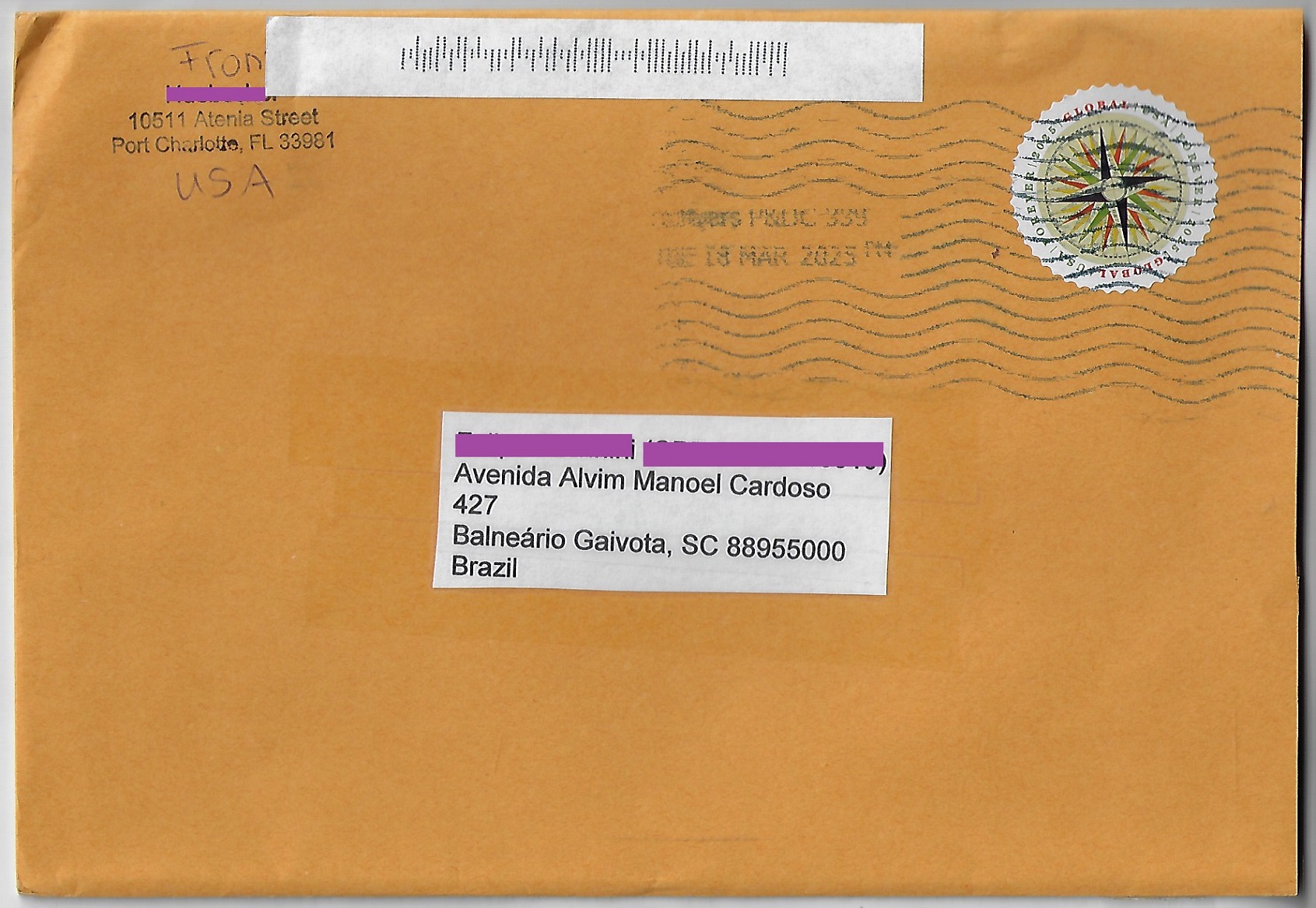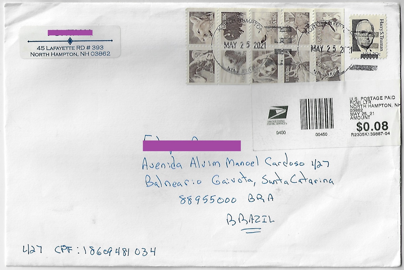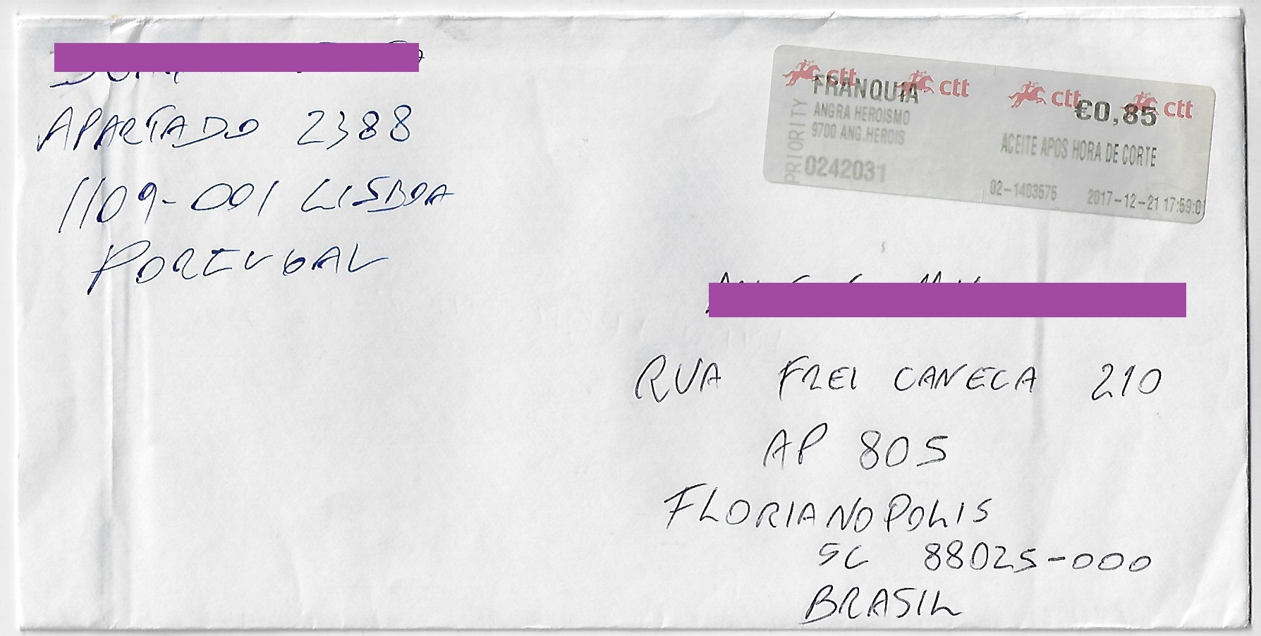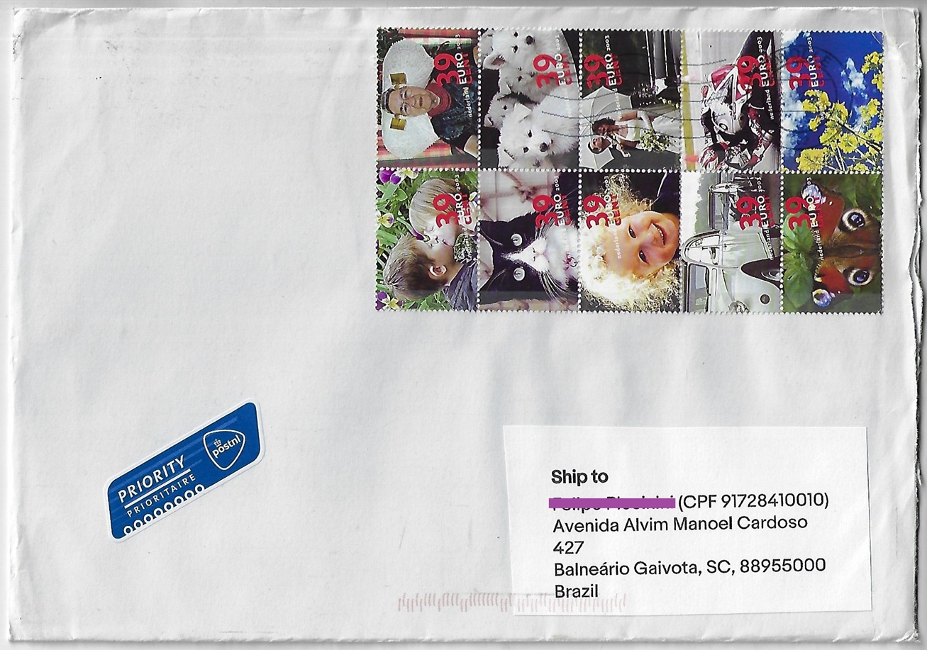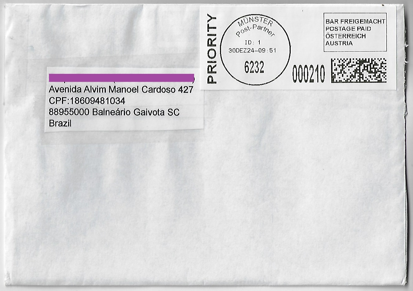 | 84865 | África do Sul, 2022, envelope prioritário registrado enviado de Vredenburg (21/12) para Biguaçu, porteado com franquia mecânica Web RePost (aka "PAT Label") | 10,00 | Foto |