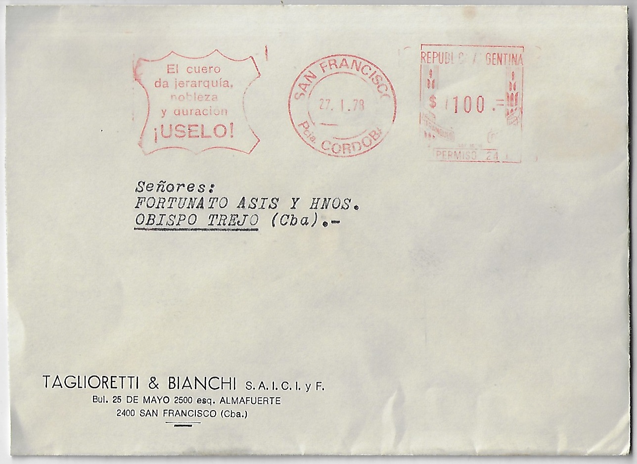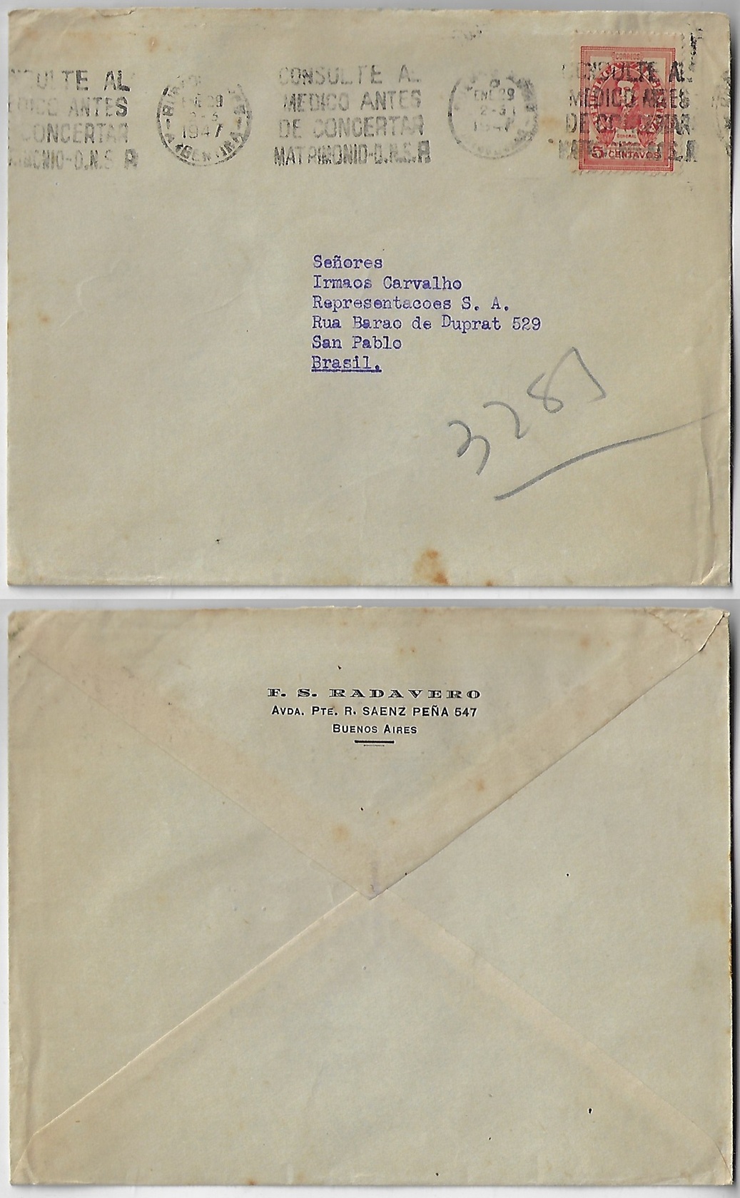 | 19642 | Argentina, 1947, envelope comercial de F.S.Radavero enviado de Buenos Aires (29/1) para São Paulo, reendereçado para Caixa Postal, selo San Martin, carimbo slogan "Consulte o médico antes de combinar o casamento - DNSP (Direção Nacional de Saúde Pública)" | 10,00 | Foto |