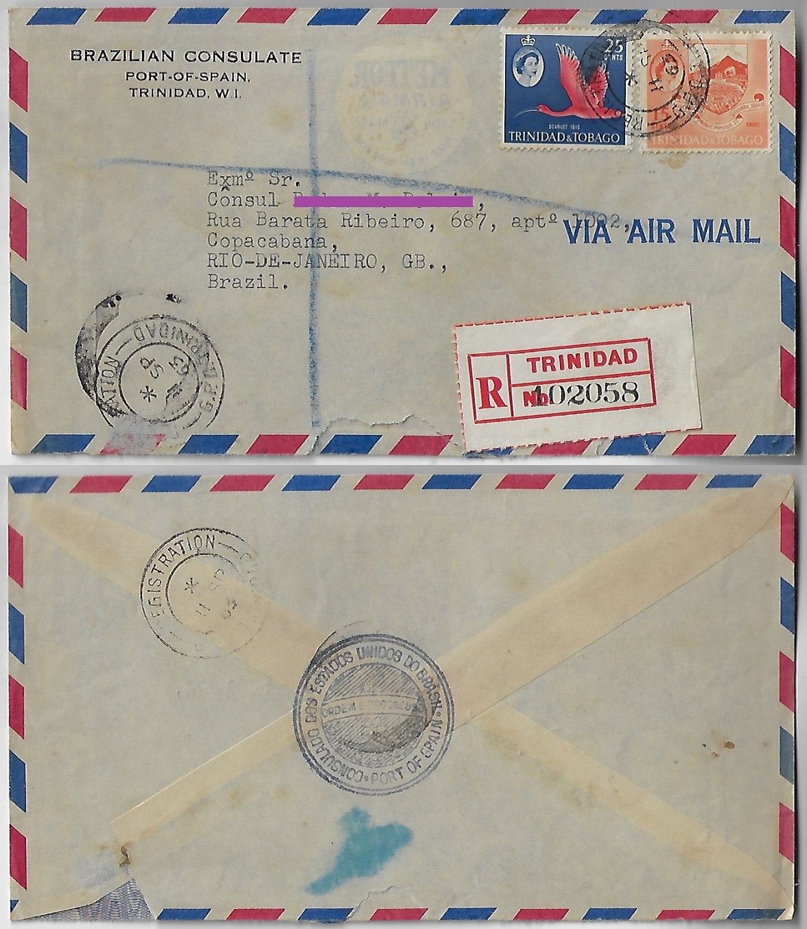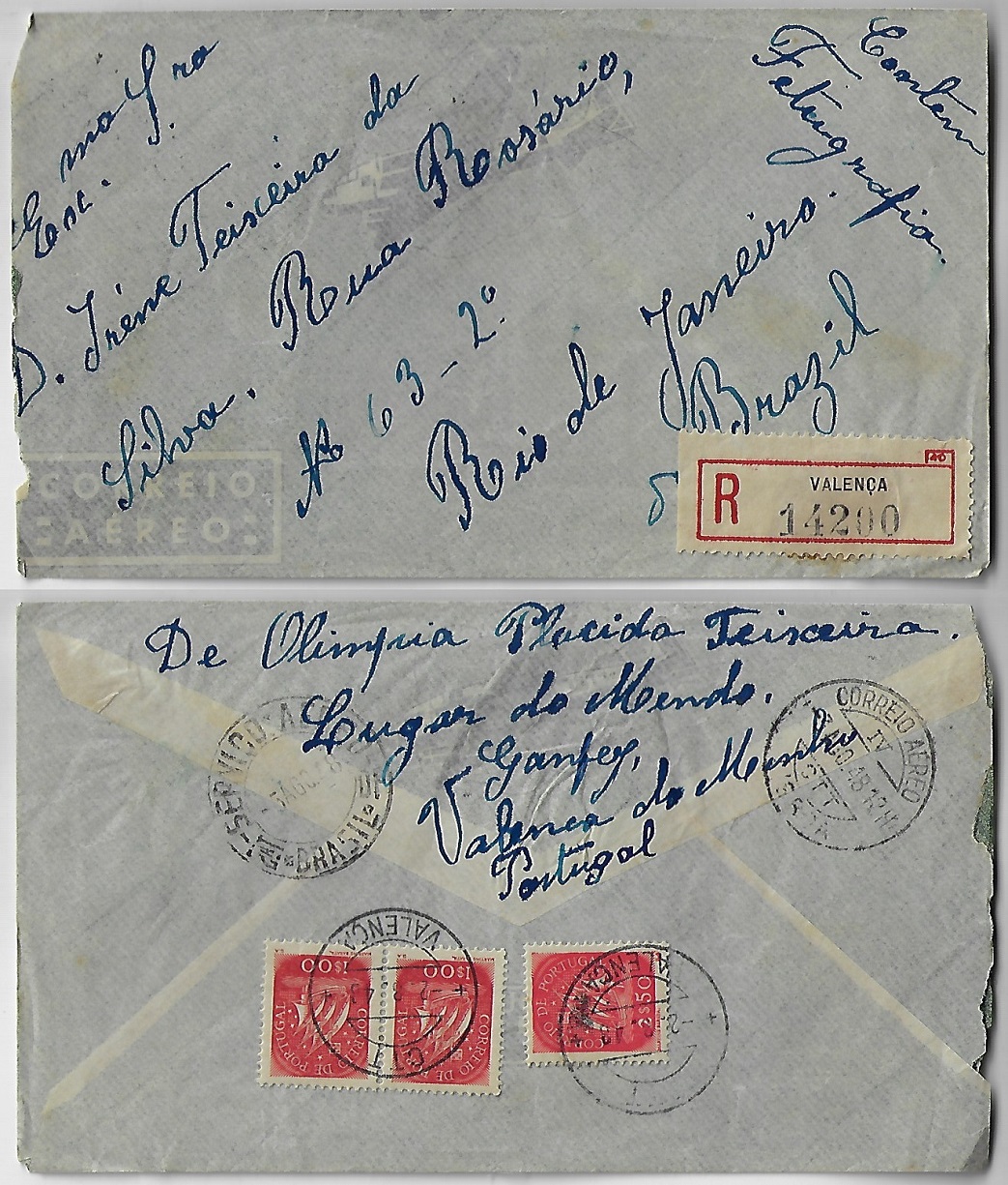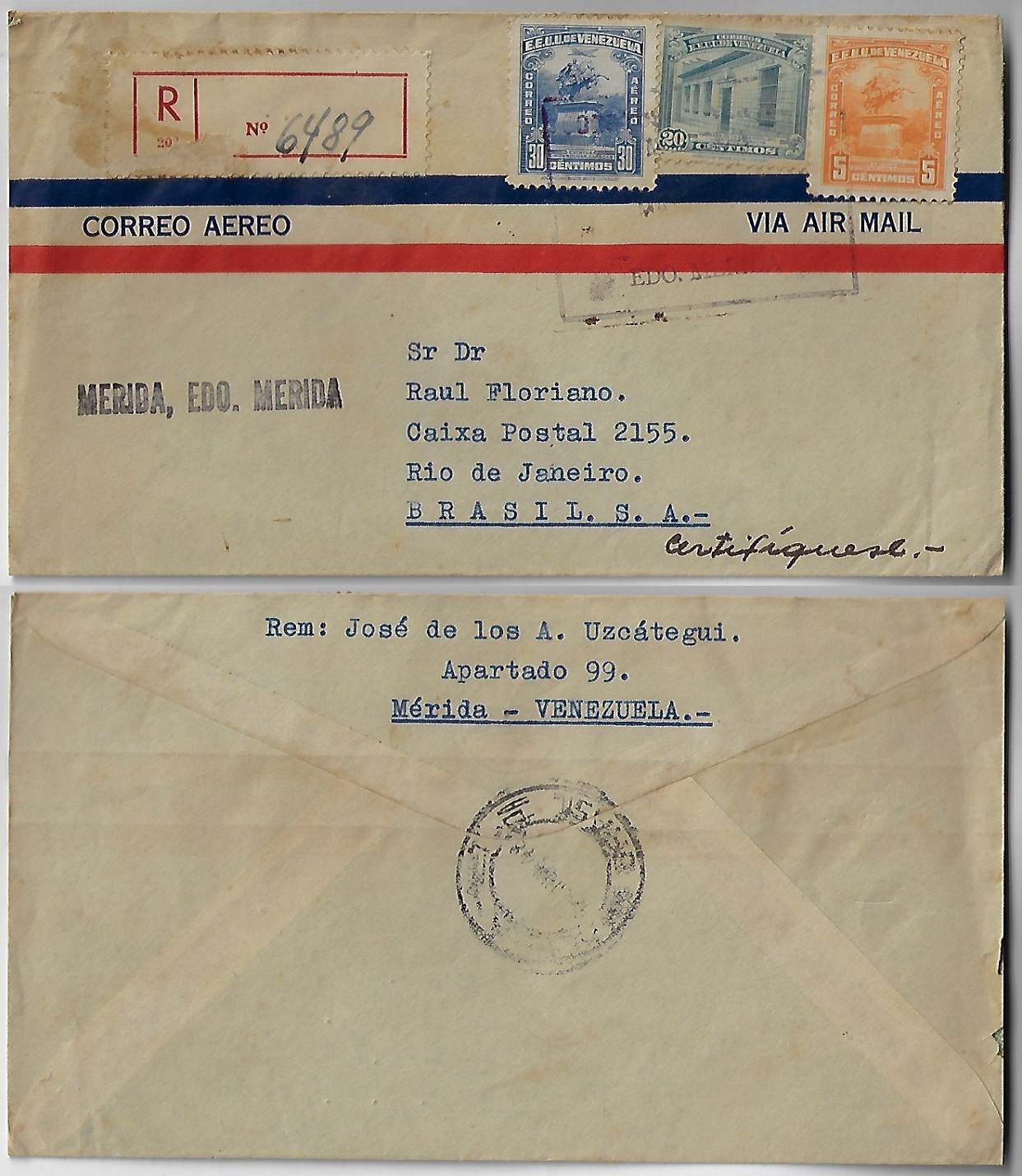 | 82550 | Venezuela, 1948, envelope aéreo registrado enviado de Mérida para o Rio de Janeiro, porteado com selos Estátua de Simon Bolivar 5 e 30 Centavos e Casa Natal de Simon Bolivar 20 Centavos | 10,00 | Foto |