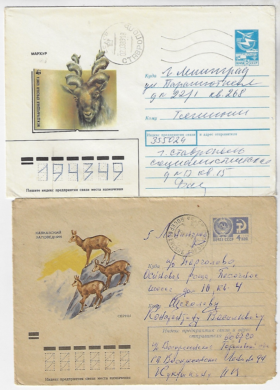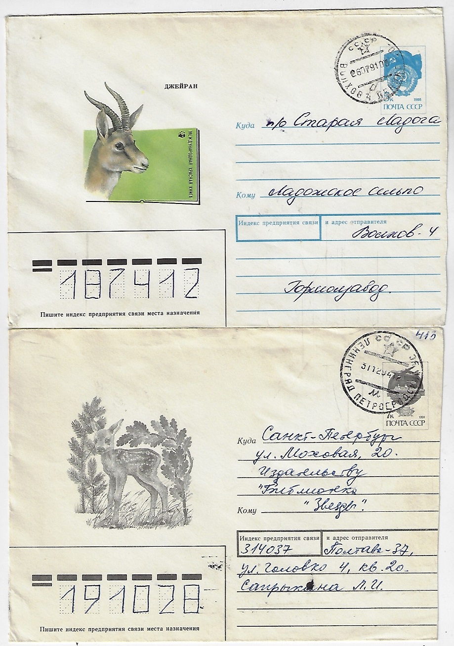 | 10487 | URSS, 1990/1991, 2 Inteiros Postais tipo envelope com desenhos de cabra selvagen e filhote de cervo, ambos circulados | 20,00 | Foto |