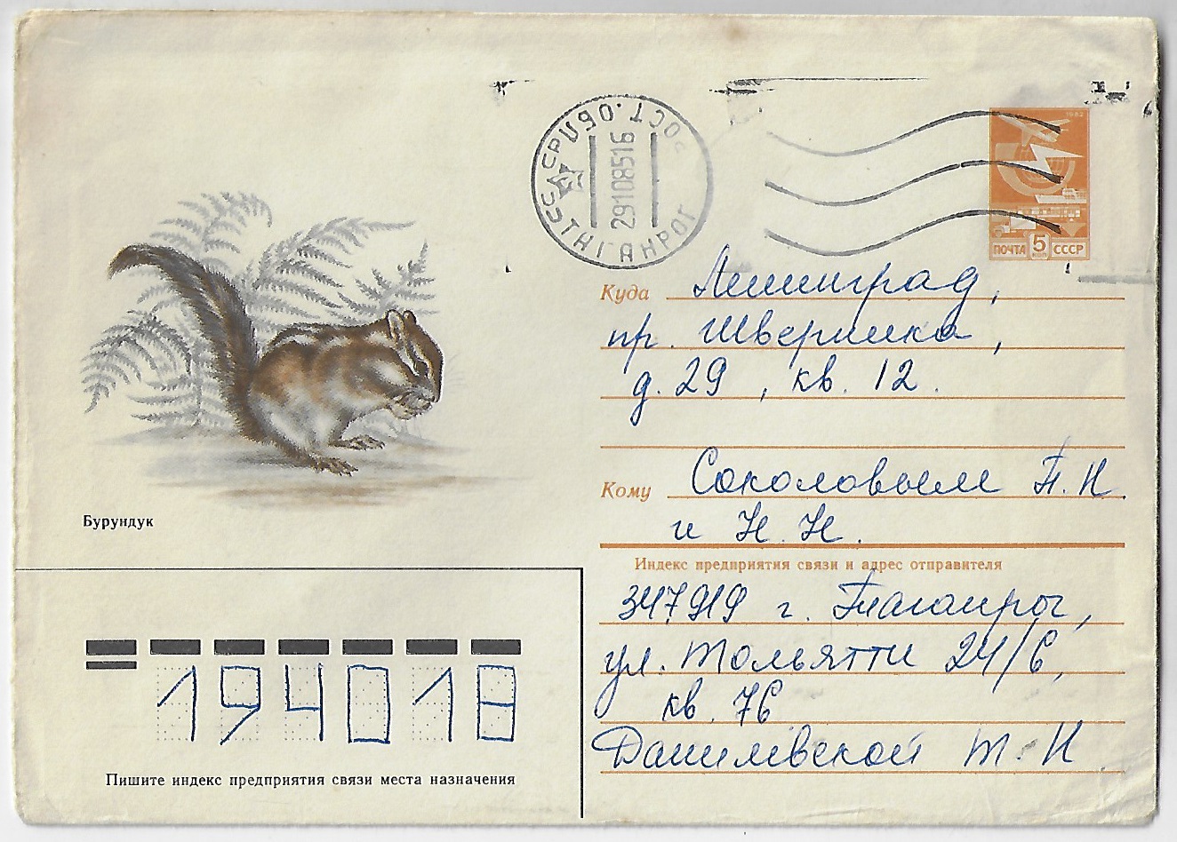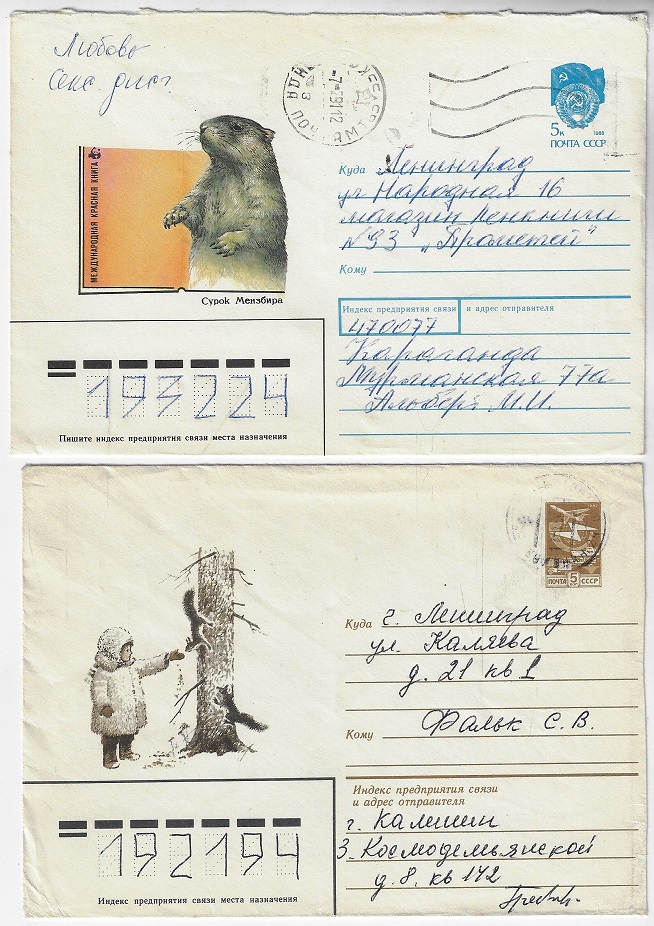| 10547 | URSS, 1983/1990, 2 Inteiros Postais tipo envelope com desenho de fauna, animal, mamífero, roedor, esquilo, marmota, circulados | 20,00 | Foto |