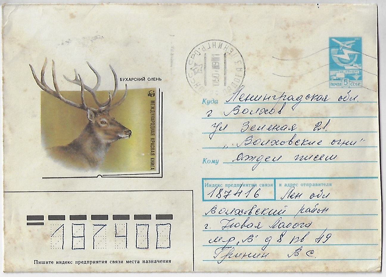 | 10533 | URSS, 1988, Inteiro Postal tipo envelope com desenho de Cervo de Bukhara, circulado | 10,00 | Foto |