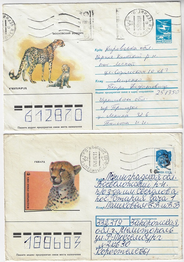 | 10546 | URSS, 1985/1990, 2 Inteiros Postais tipo envelope com desenho de guepardo e filhote, circulados | 20,00 | Foto |