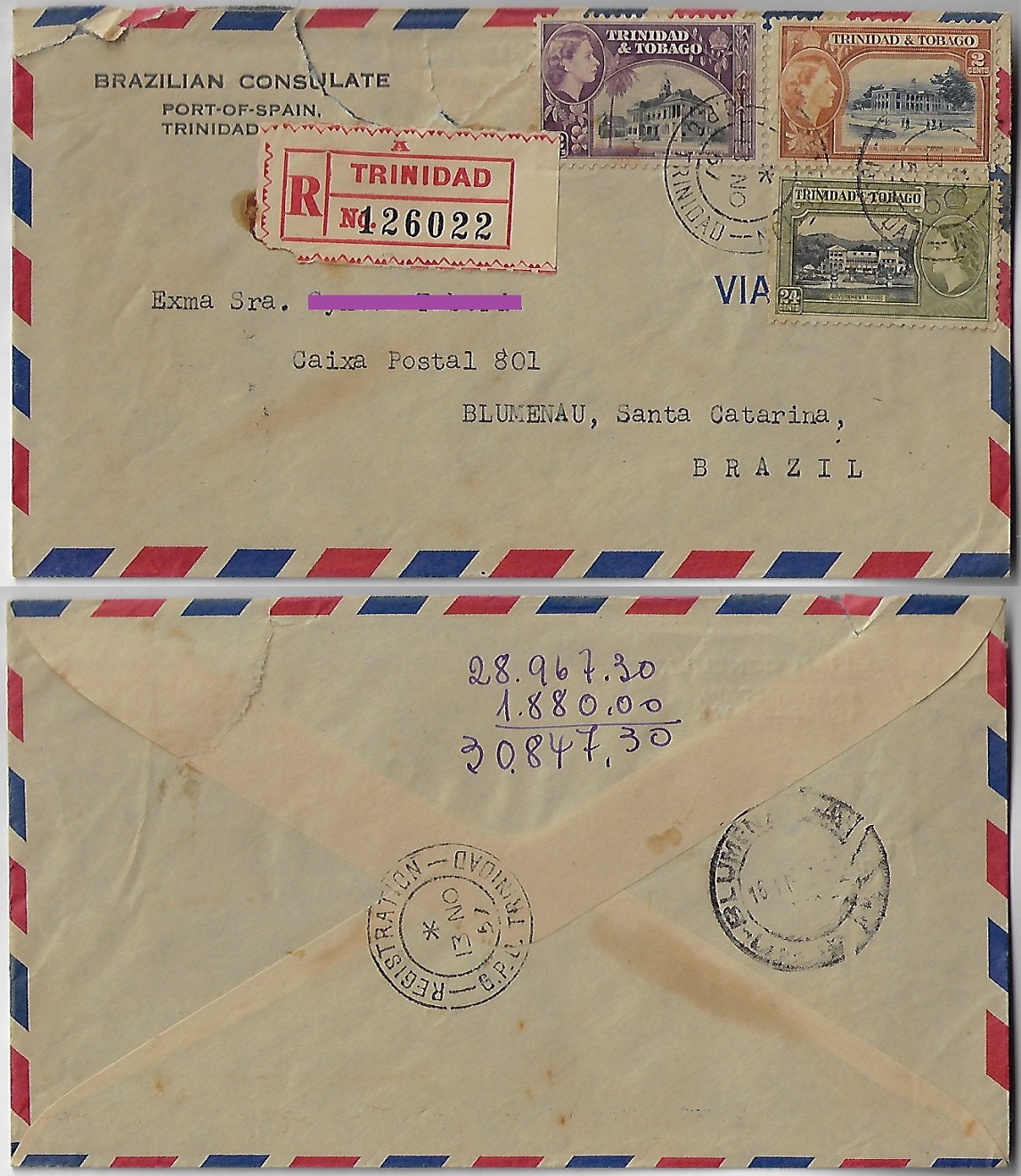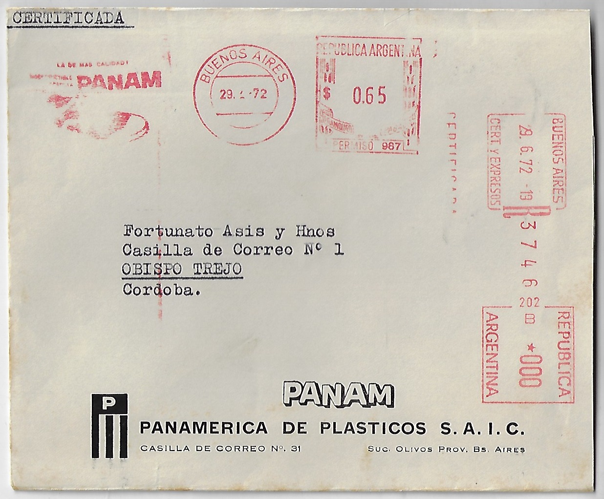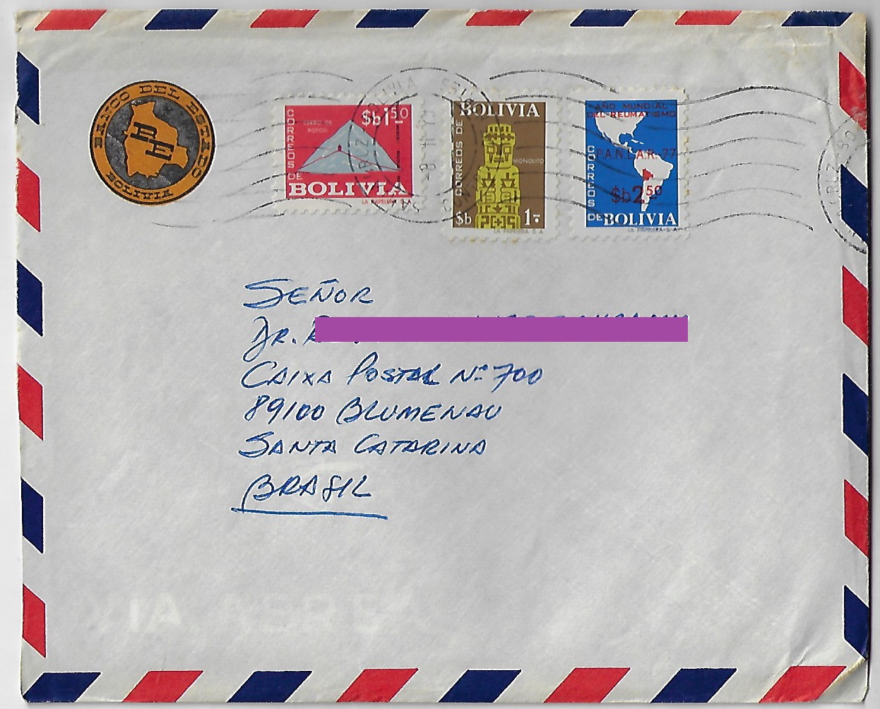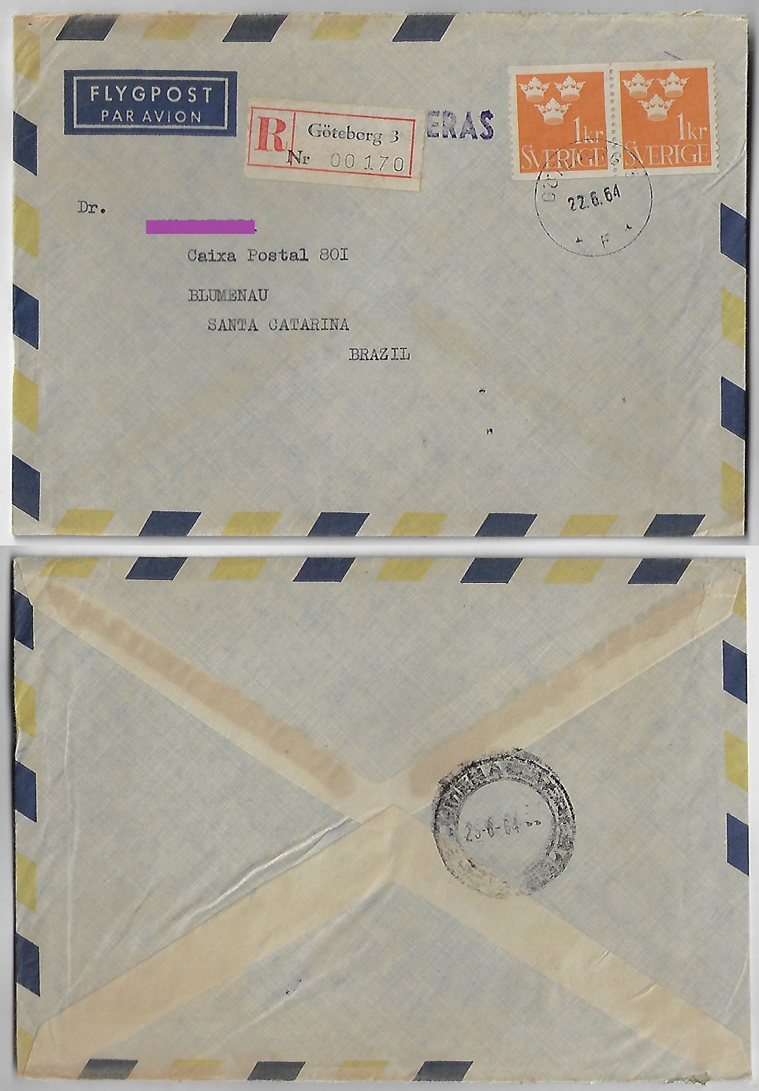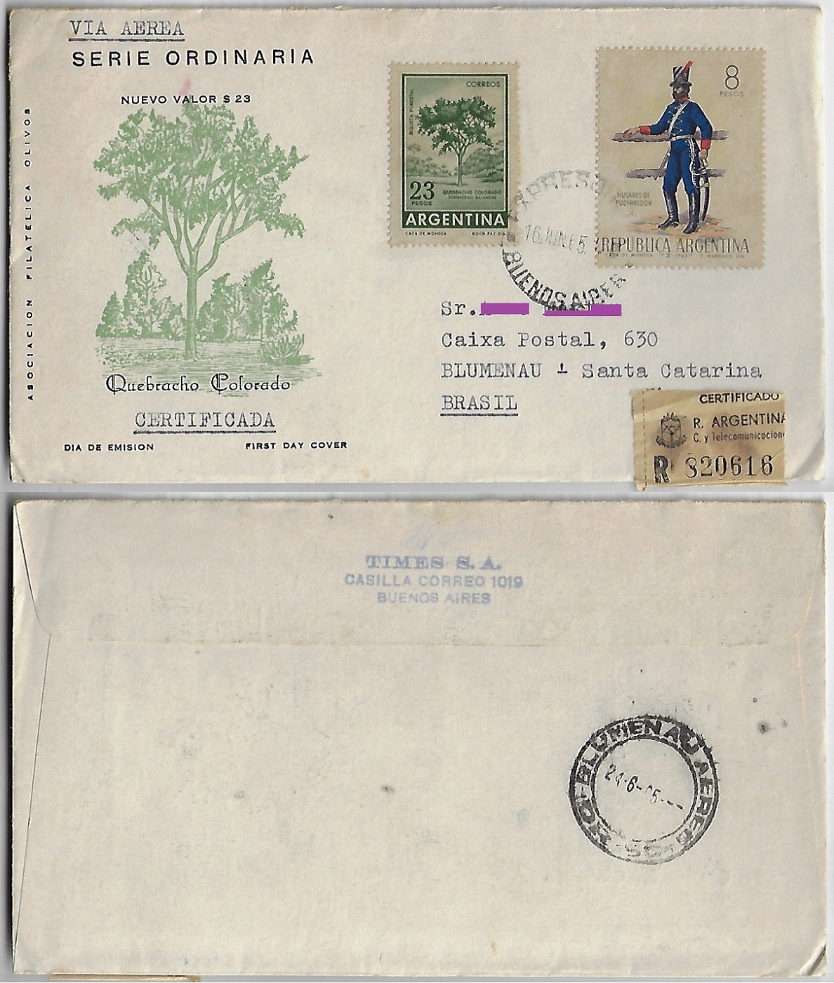 | 46101 | Argentina, 1965, envelope aéreo registrado enviado de Buenos Aires (16/6) para Blumenau (24/6), porteado com selos Uniforme e Árvore | 10,00 | Foto |