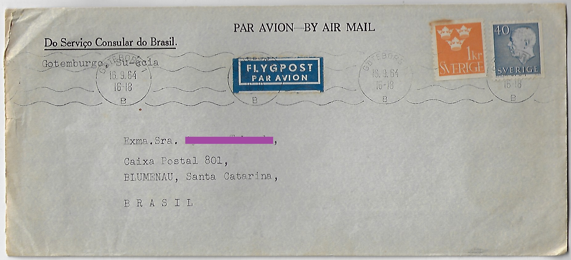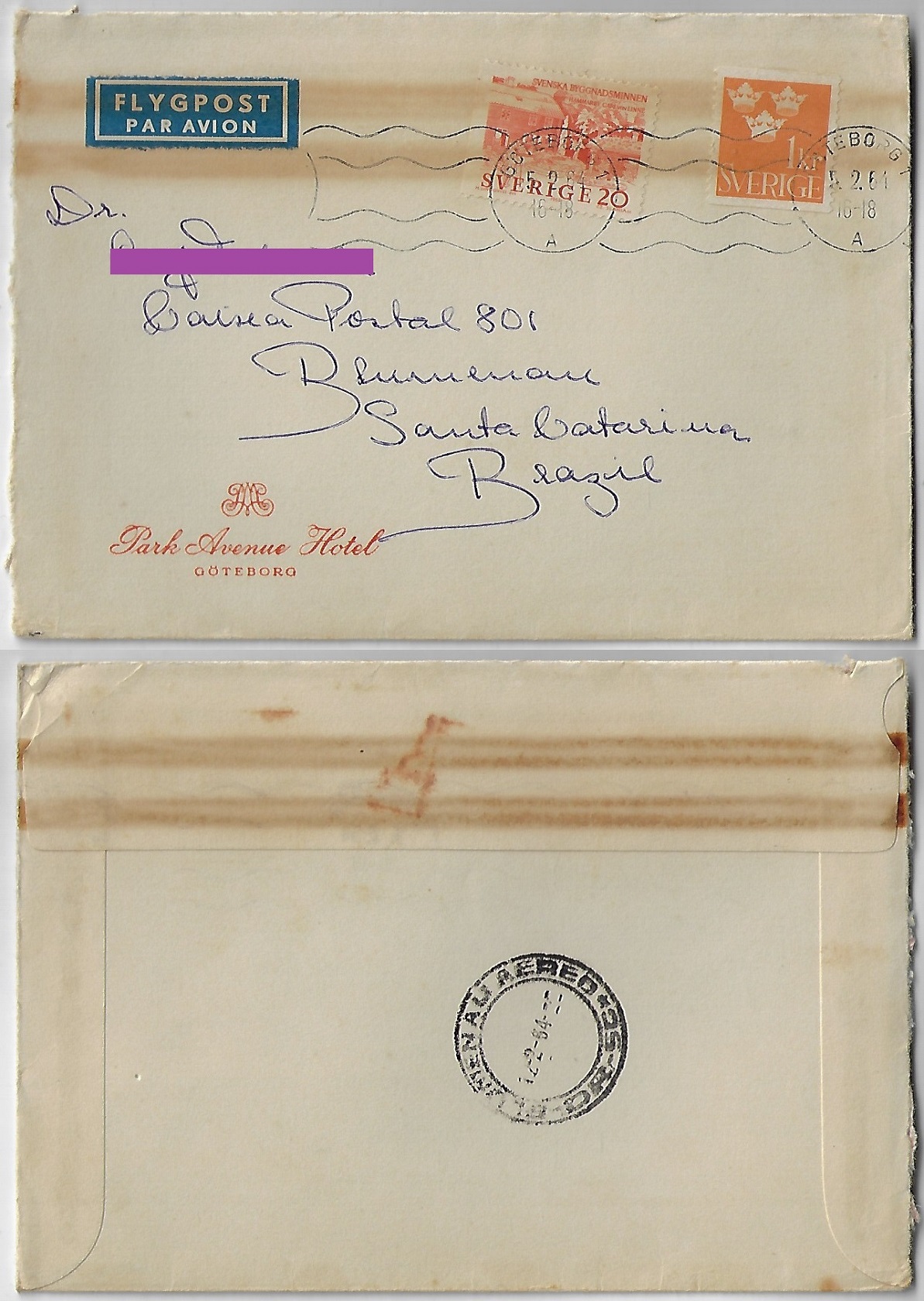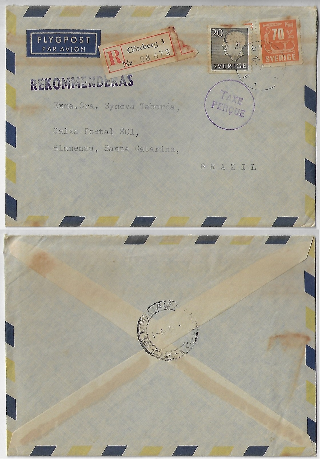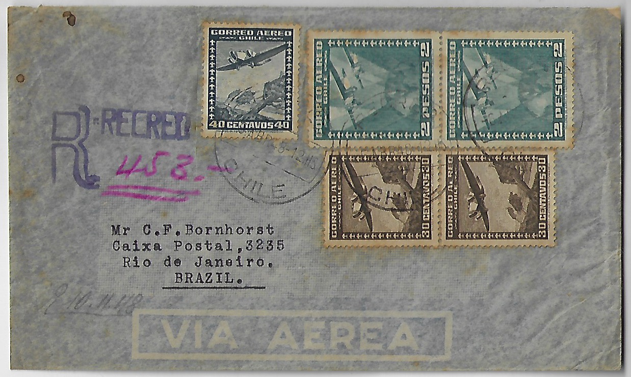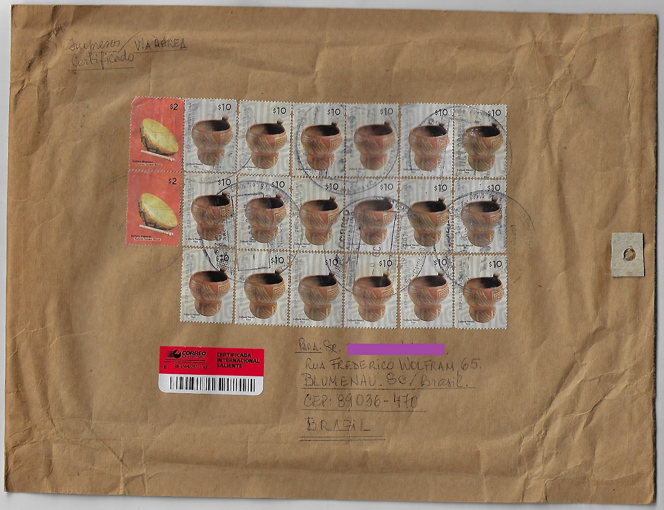 | 46101 | Argentina, 1965, envelope aéreo registrado enviado de Buenos Aires (16/6) para Blumenau (24/6), porteado com selos Uniforme e Árvore | 10,00 | Foto |
