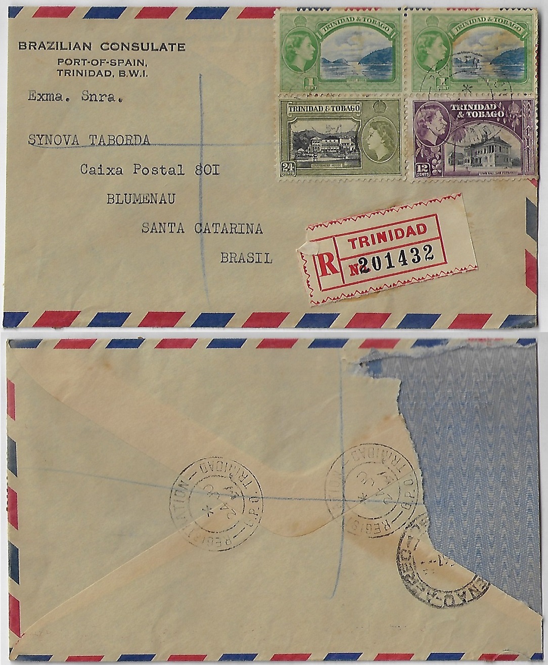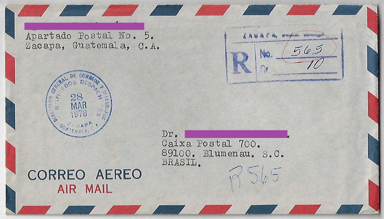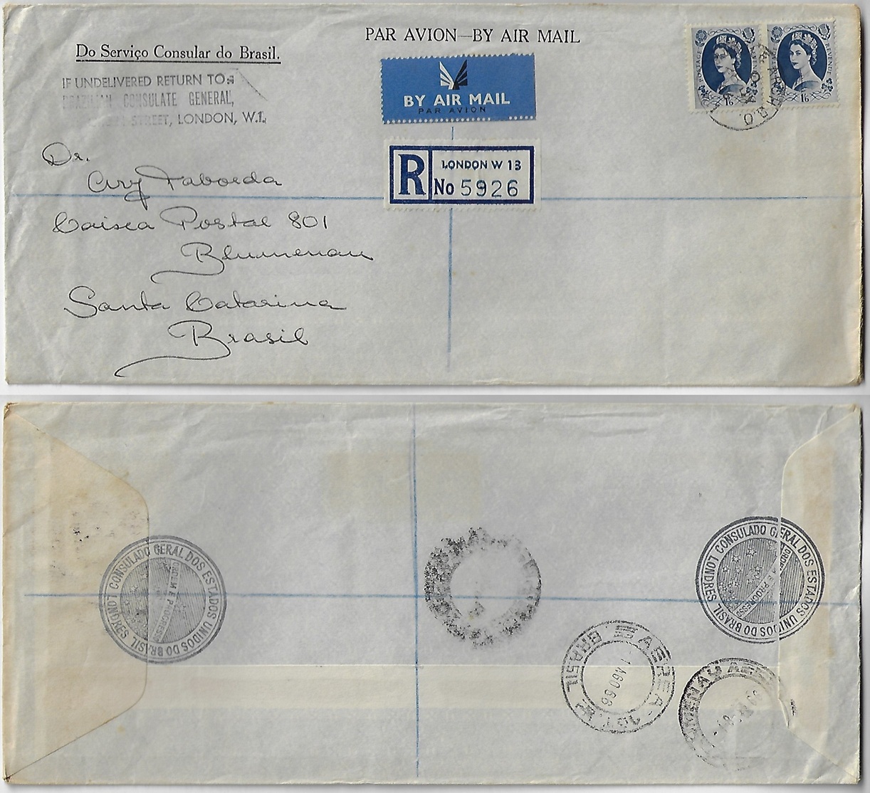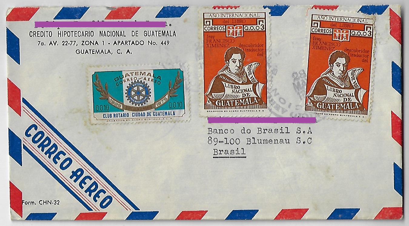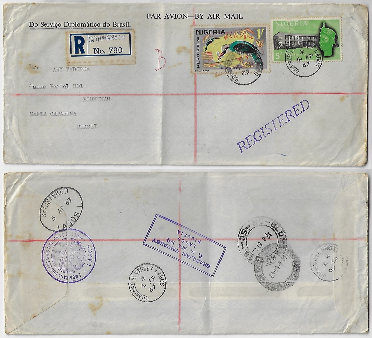 | 46101 | Argentina, 1965, envelope aéreo registrado enviado de Buenos Aires (16/6) para Blumenau (24/6), porteado com selos Uniforme e Árvore | 10,00 | Foto |