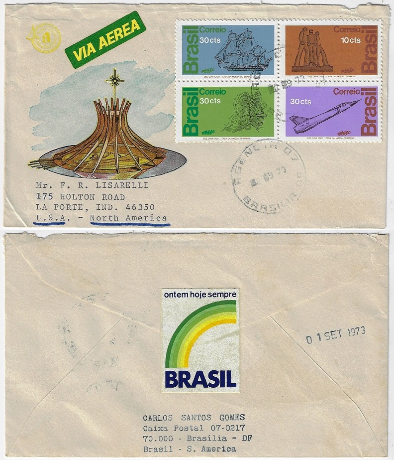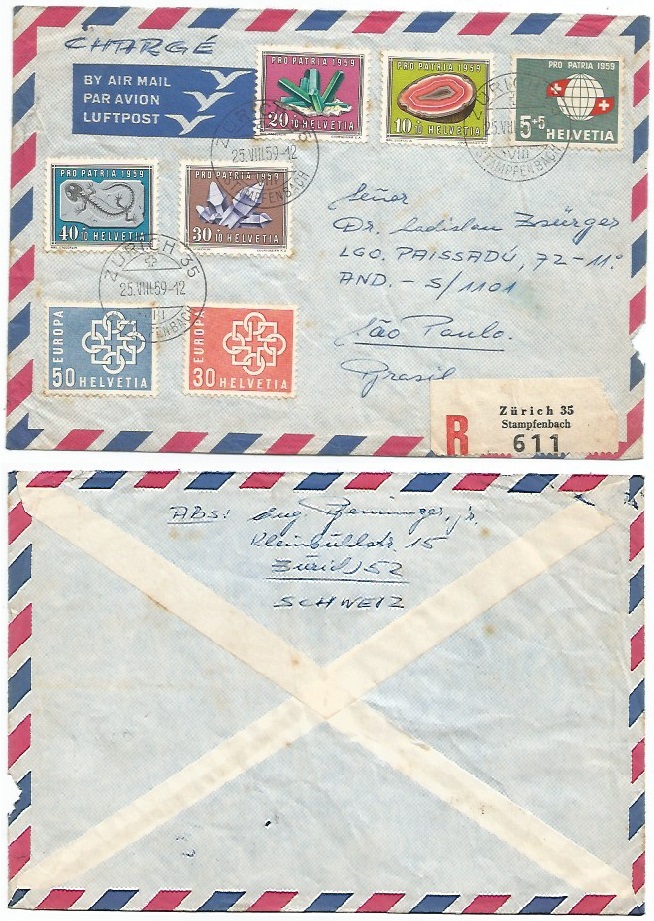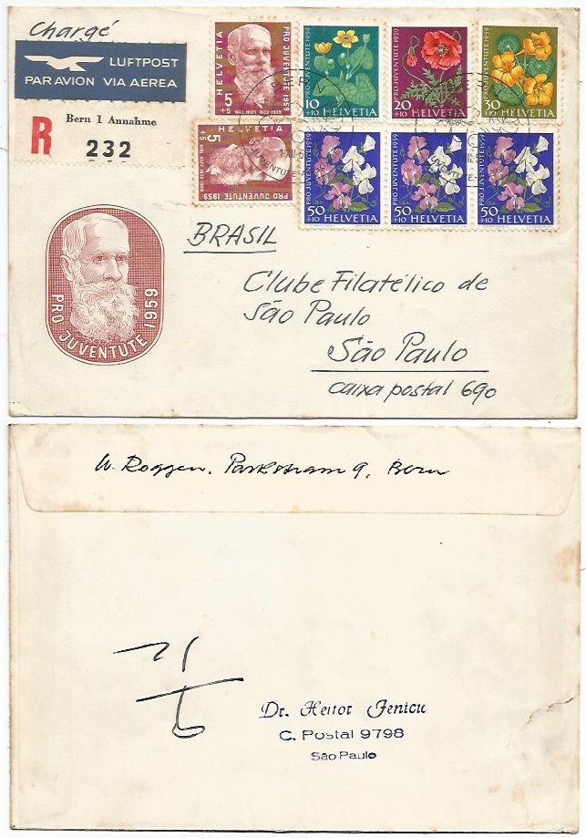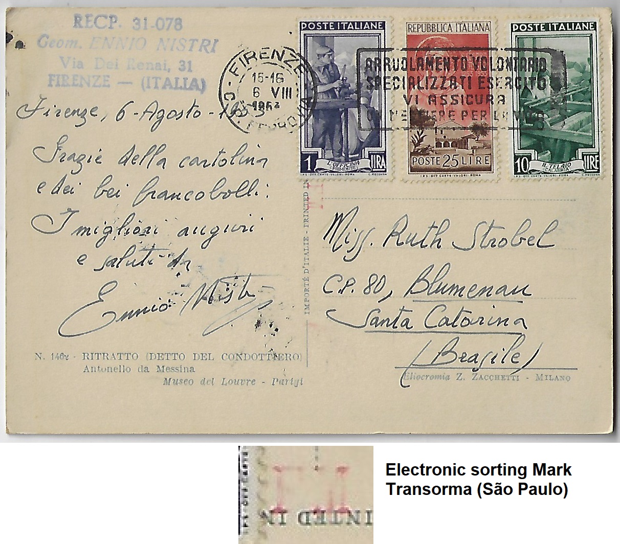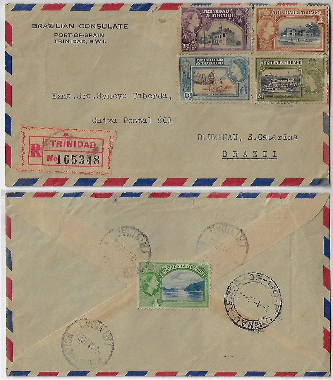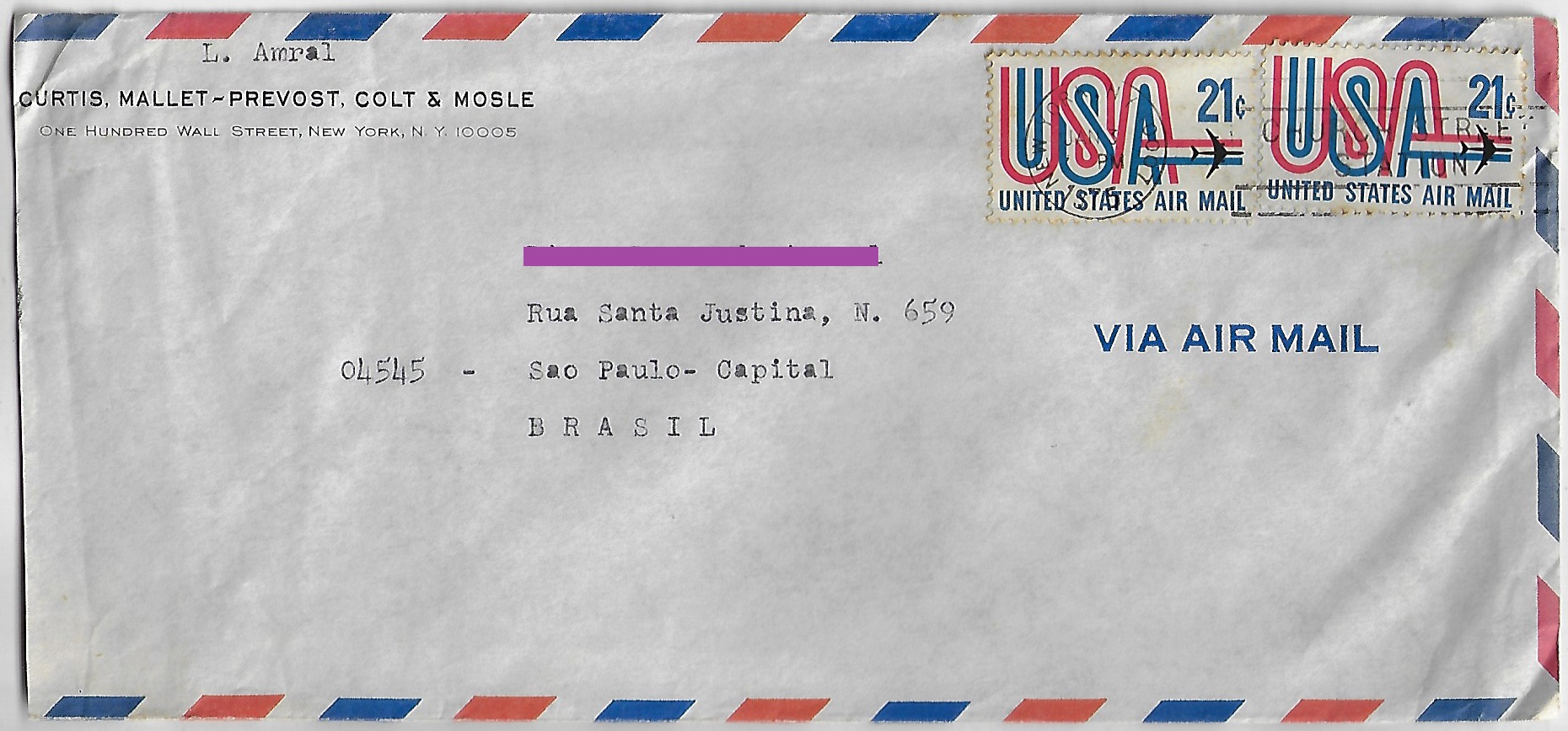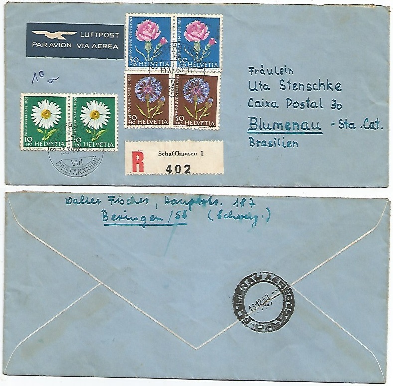 | 46101 | Argentina, 1965, envelope aéreo registrado enviado de Buenos Aires (16/6) para Blumenau (24/6), porteado com selos Uniforme e Árvore | 10,00 | Foto |