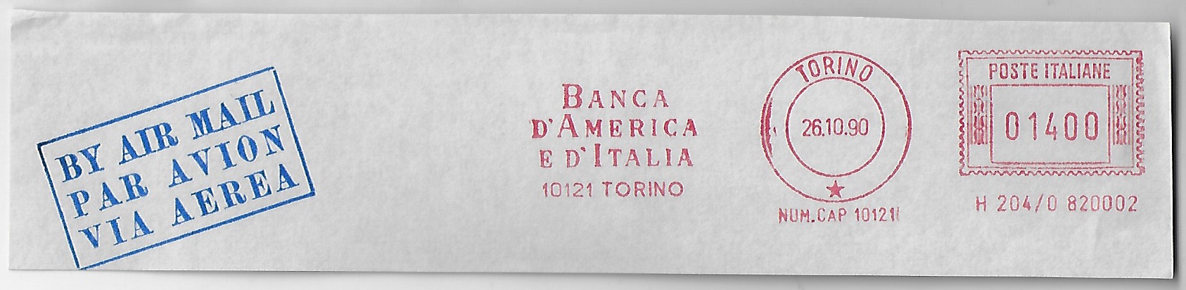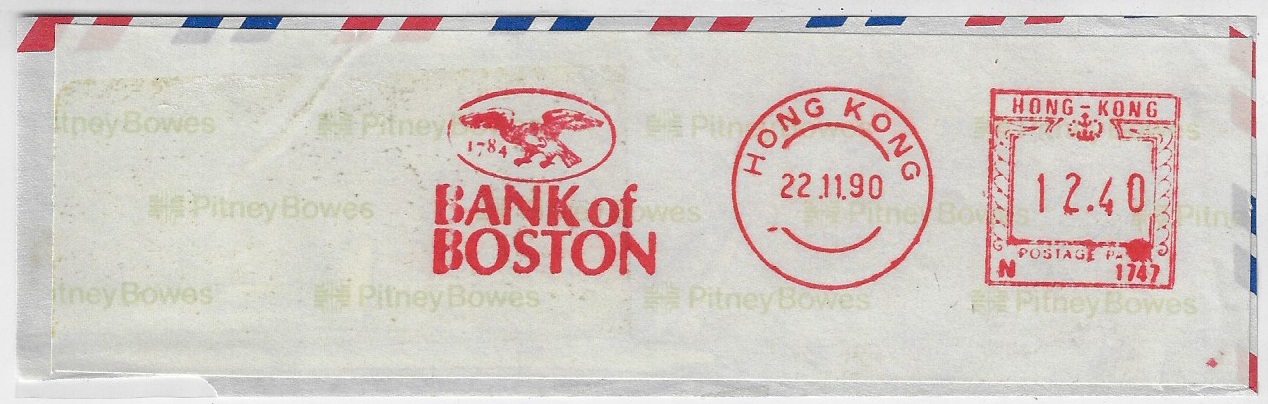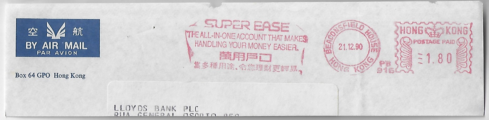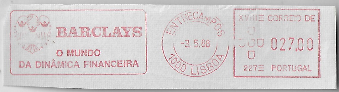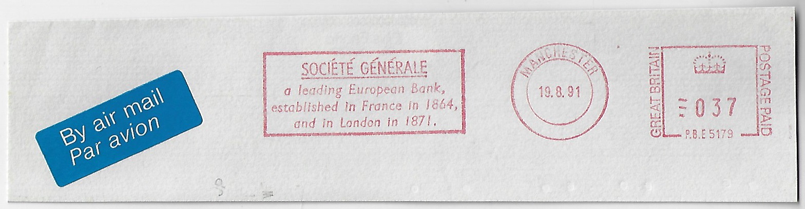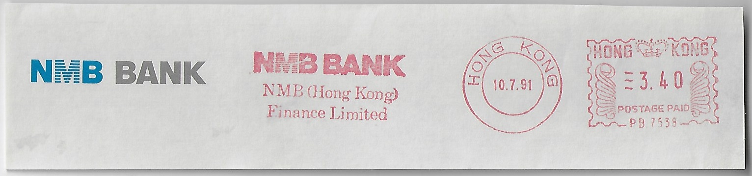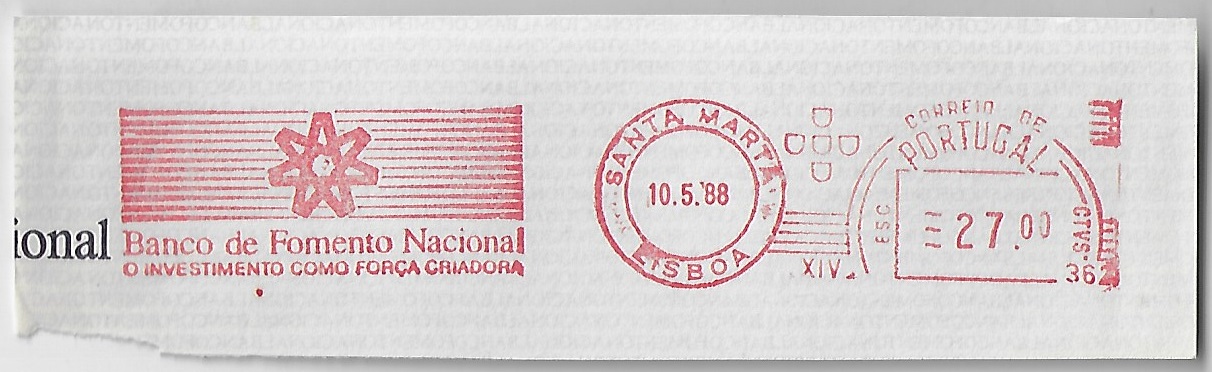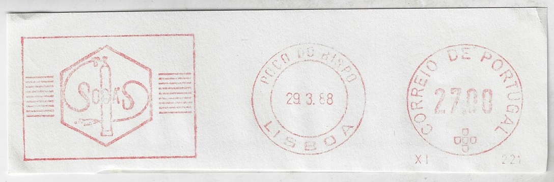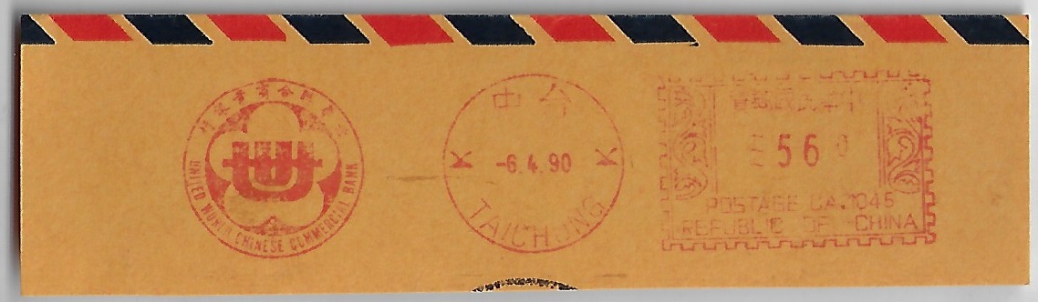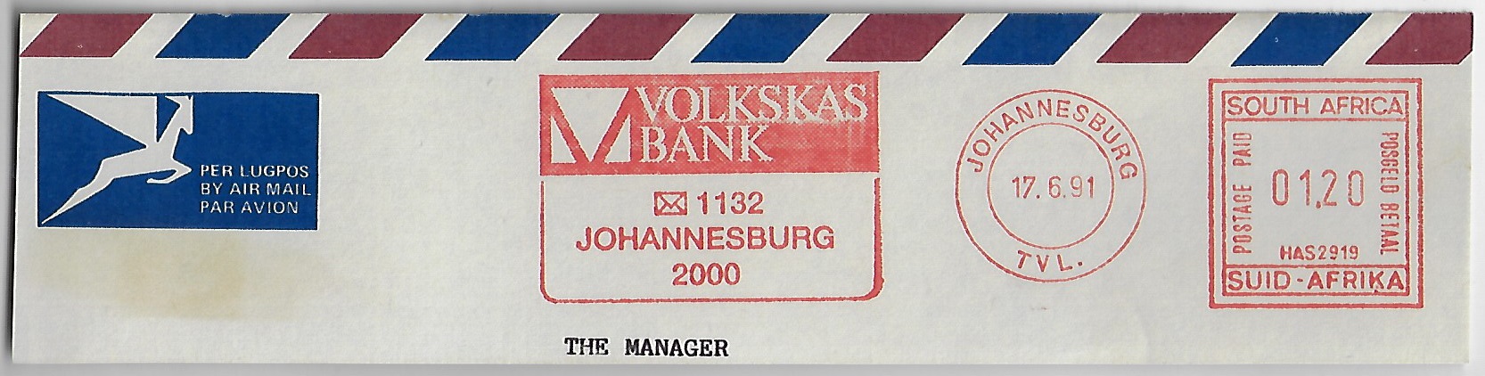 | 59200 | África do Sul, 1991, fragmento de envelope aéreo porteado com franquia mecânica Hasler "Mailmaster" com slogan "Volkskas Bank ( Banco Popular)", de Johannesburg |