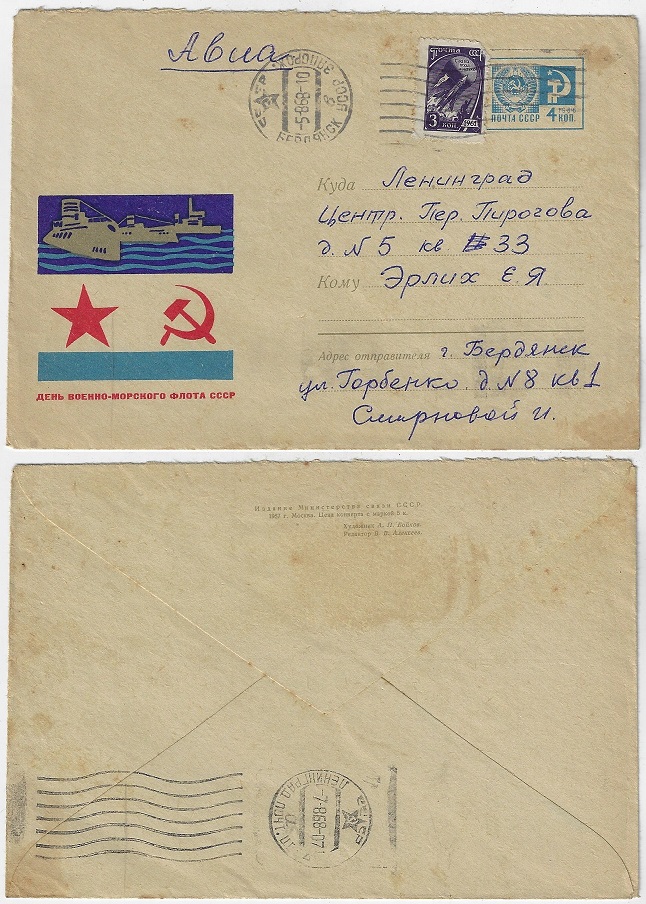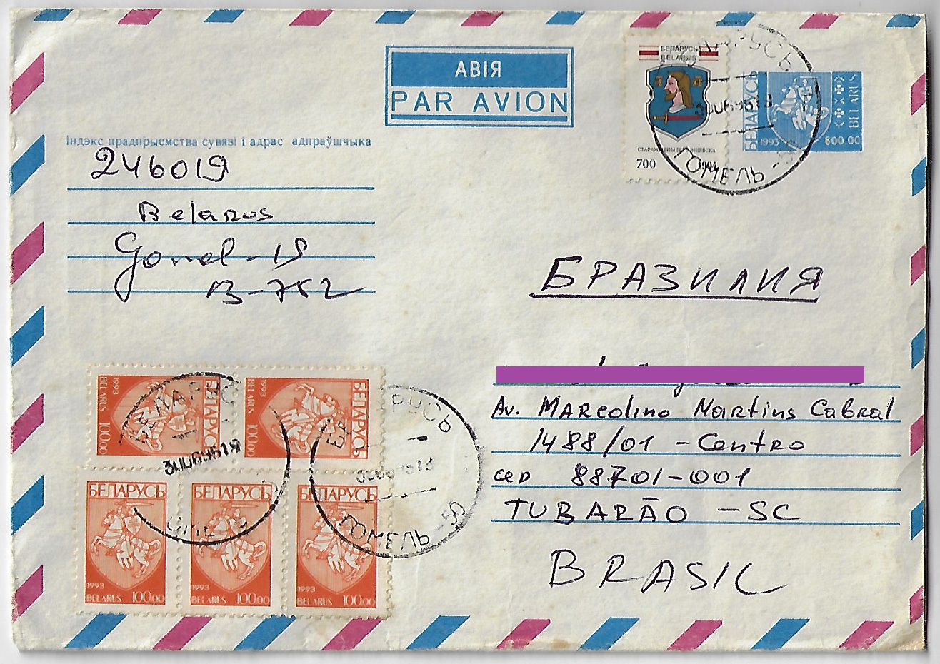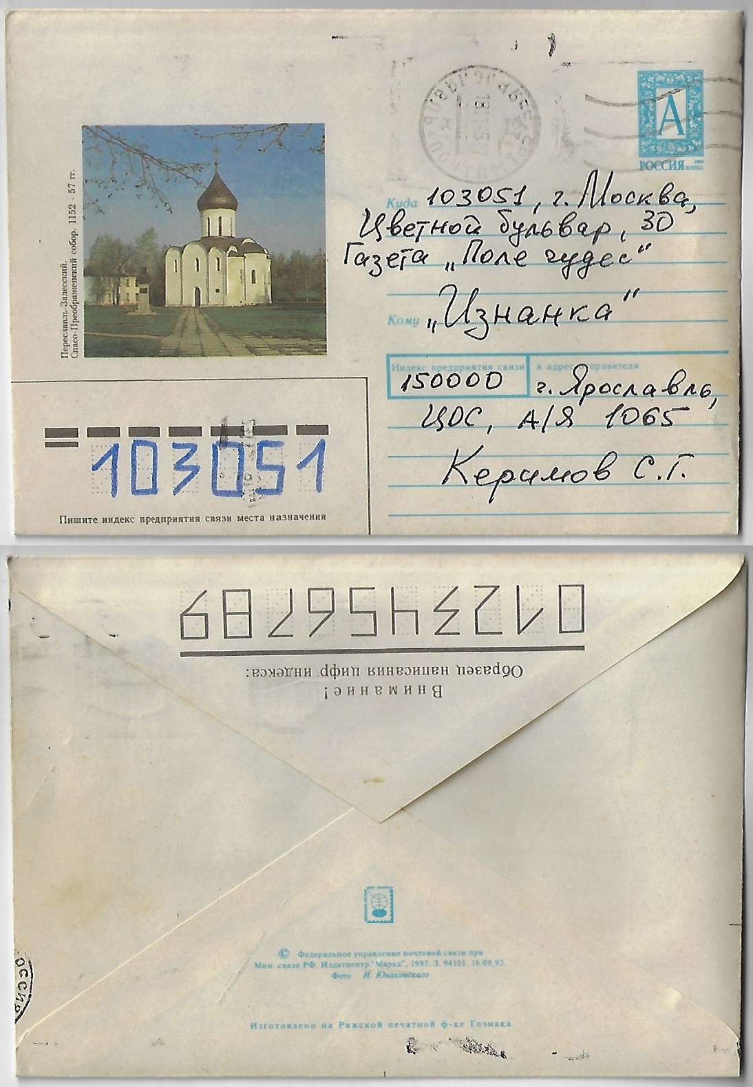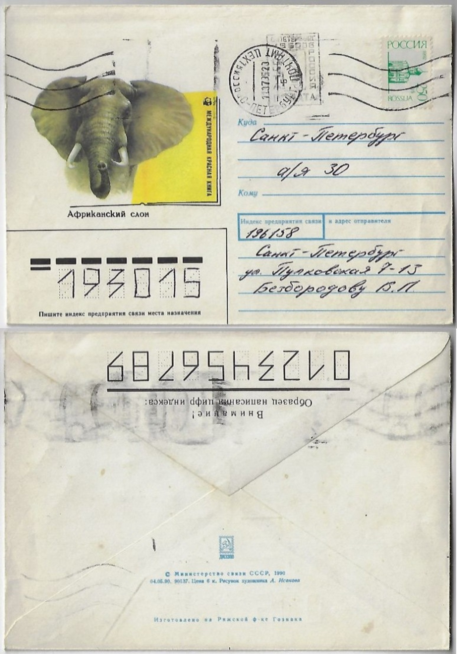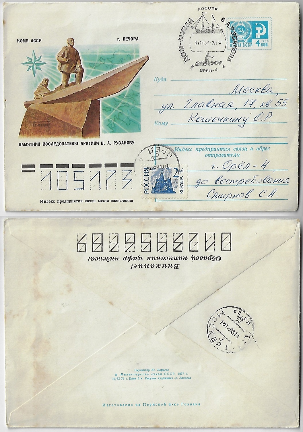 | 44655 | URSS, 1993, inteiro postal tipo envelope, selo 4 Kopecks, enviado de Oriol (10/12) para Moscou (18/12) com selo adicional 2 Kopecks, tema Navegação, Monumento ao Explorador Ártico Vladimir Alexandrovich Rusanov, em Pechora | 10,00 | Foto |