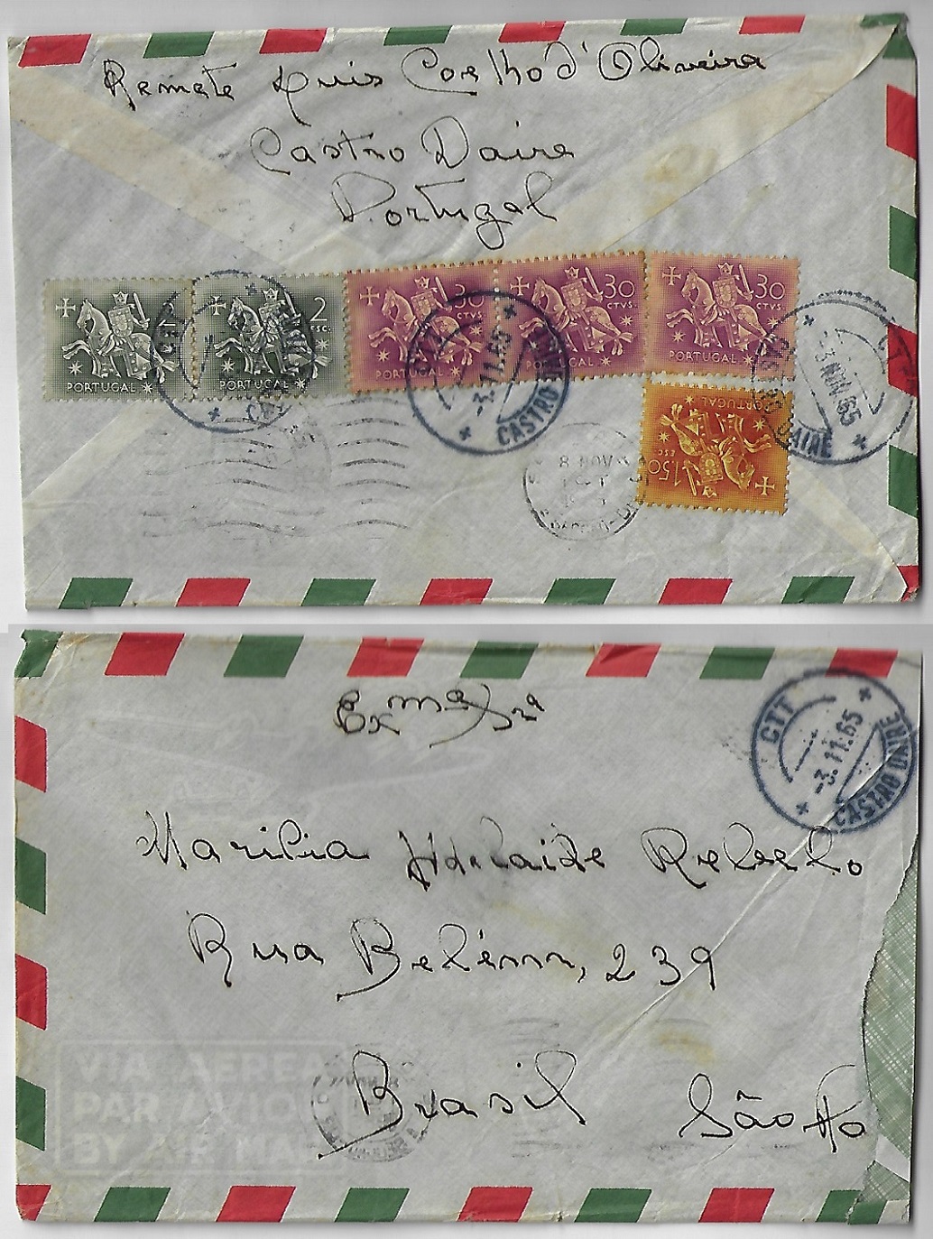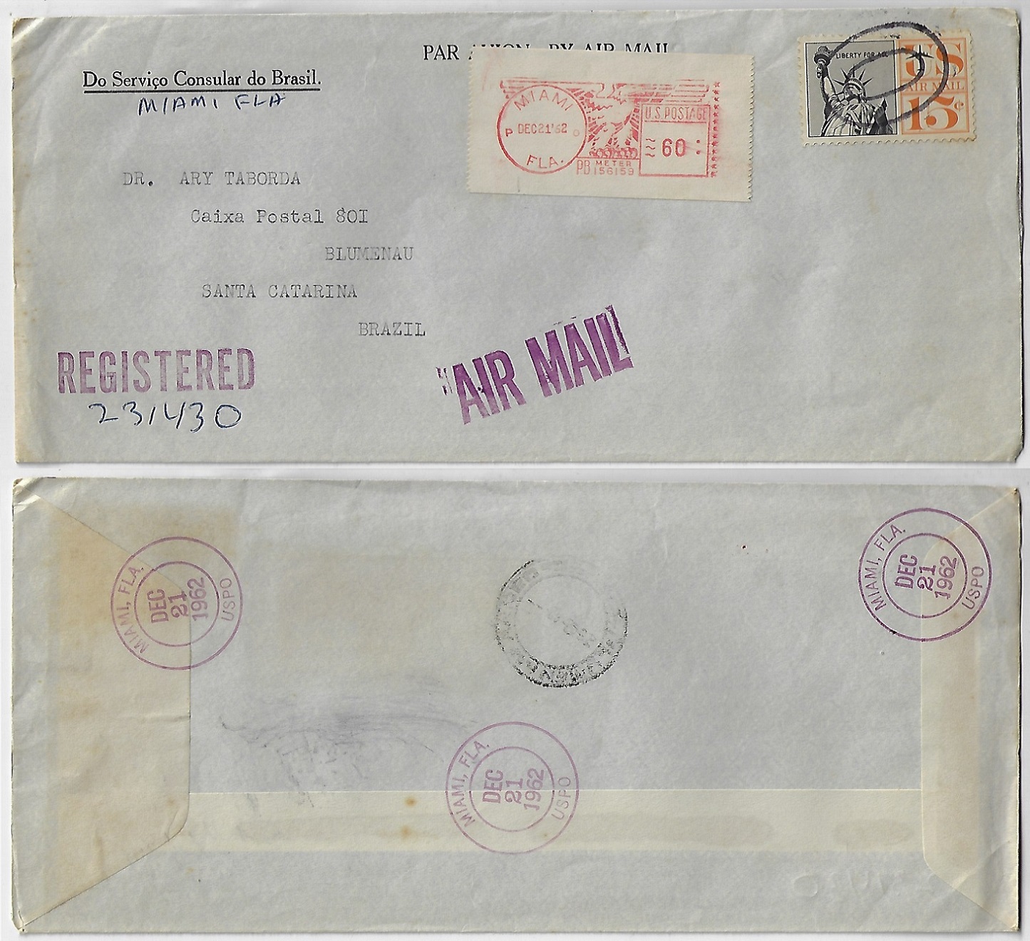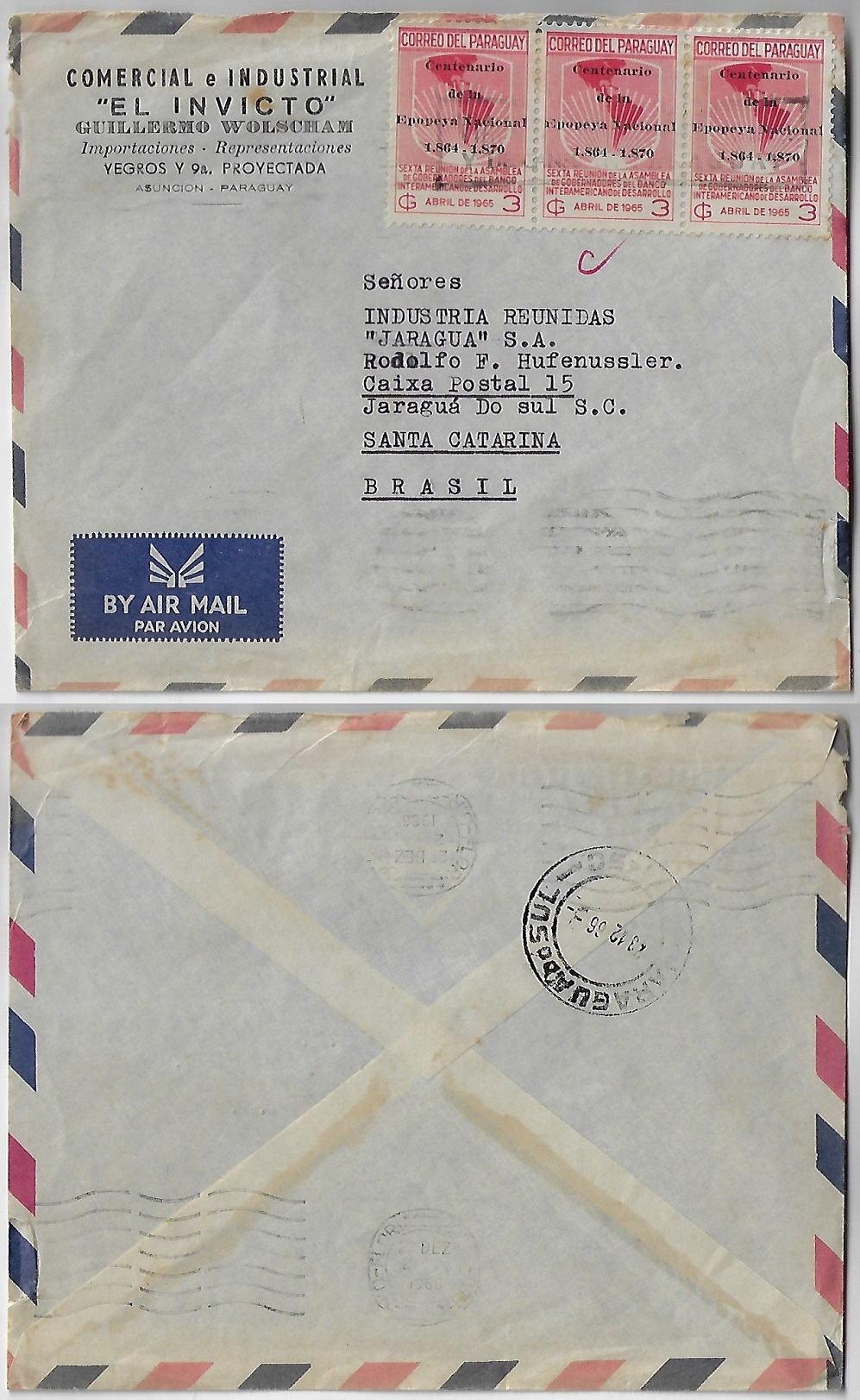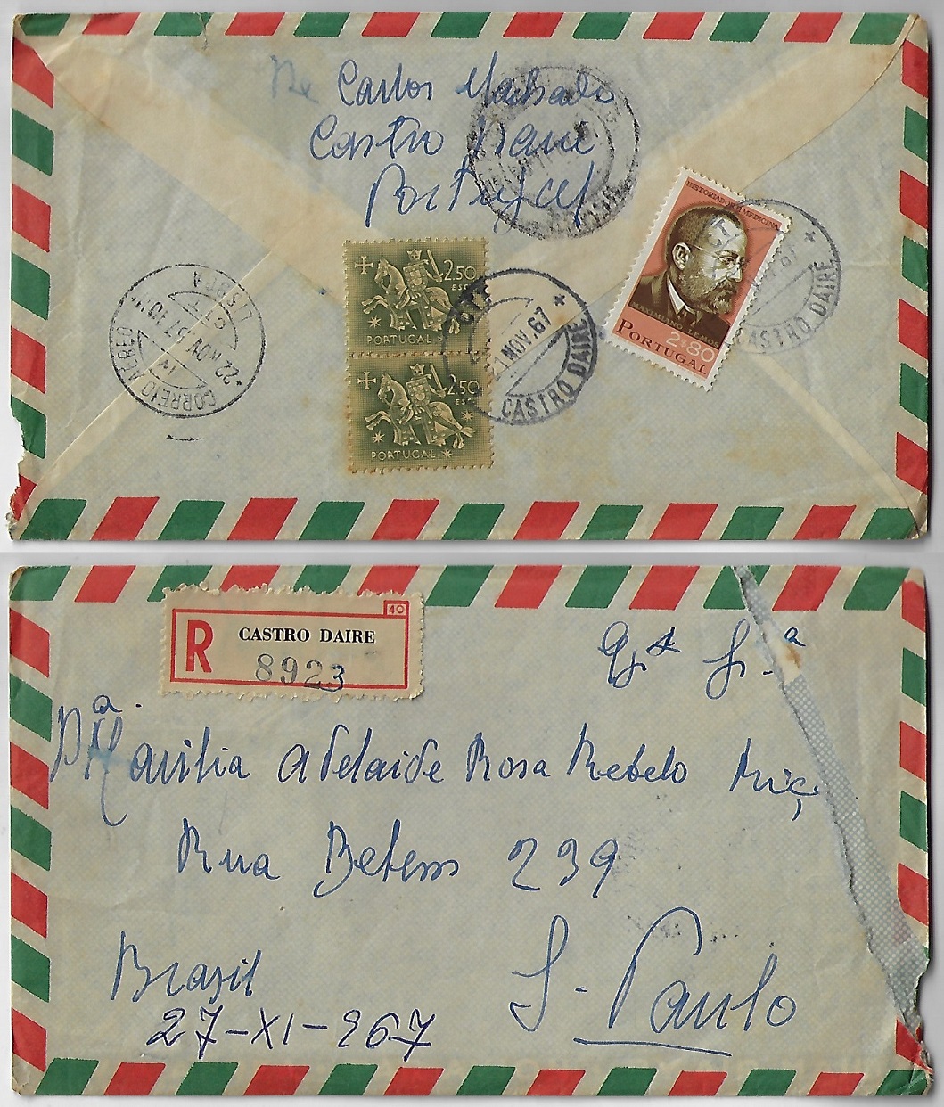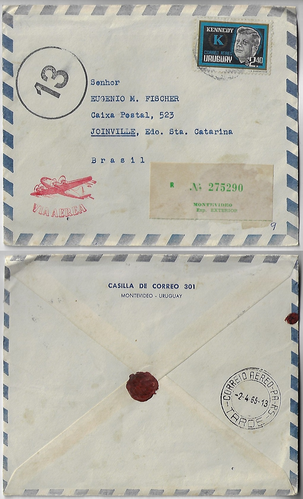 | 57575 | Uruguai, 1965, envelope aéreo registrado enviado de Montevidéu, via Porto Alegre (2/4) para Joinville, furo de cupim, porteado com selo Morte do Presidente dos EUA John F. Kennedy | 10,00 | Foto |