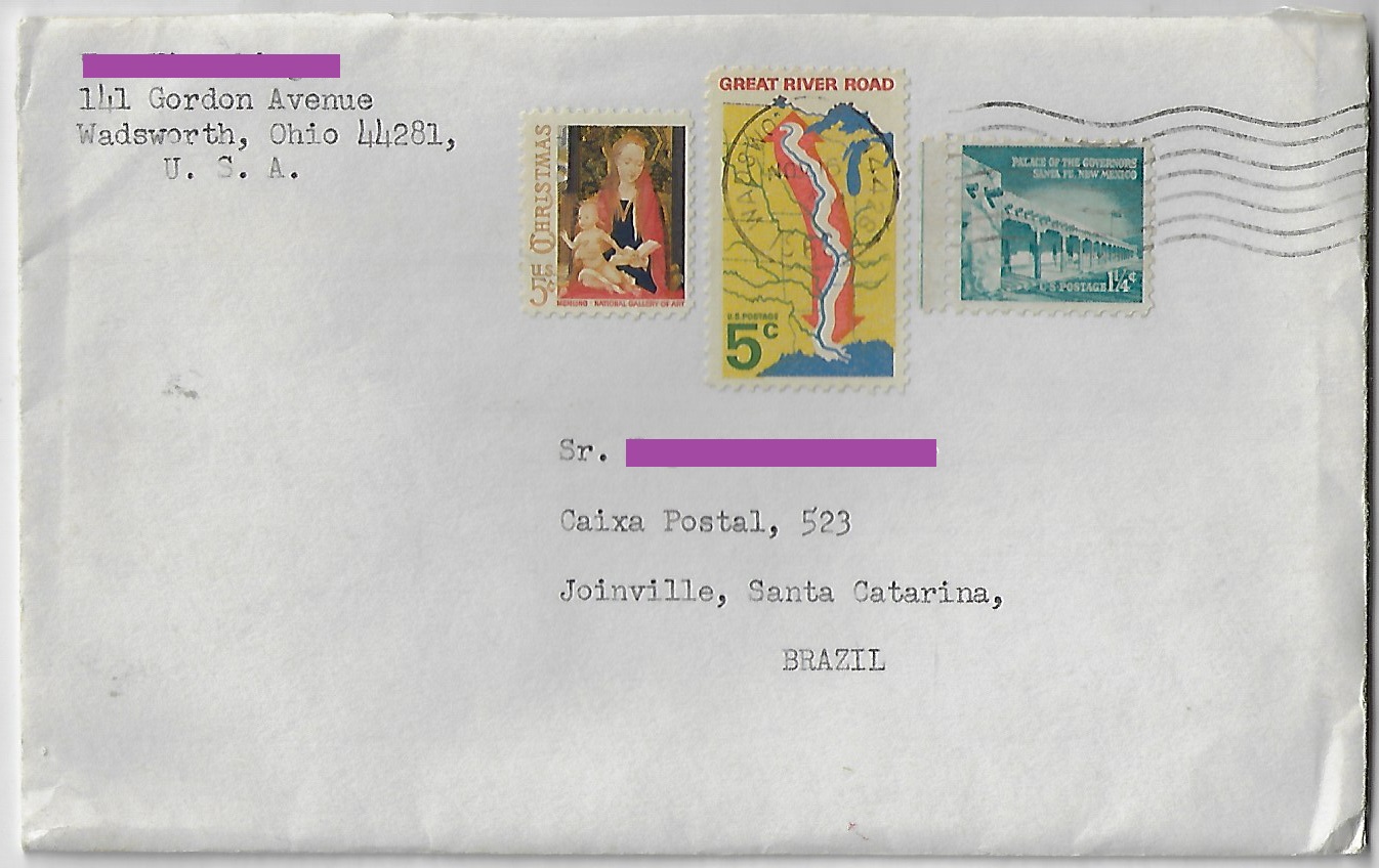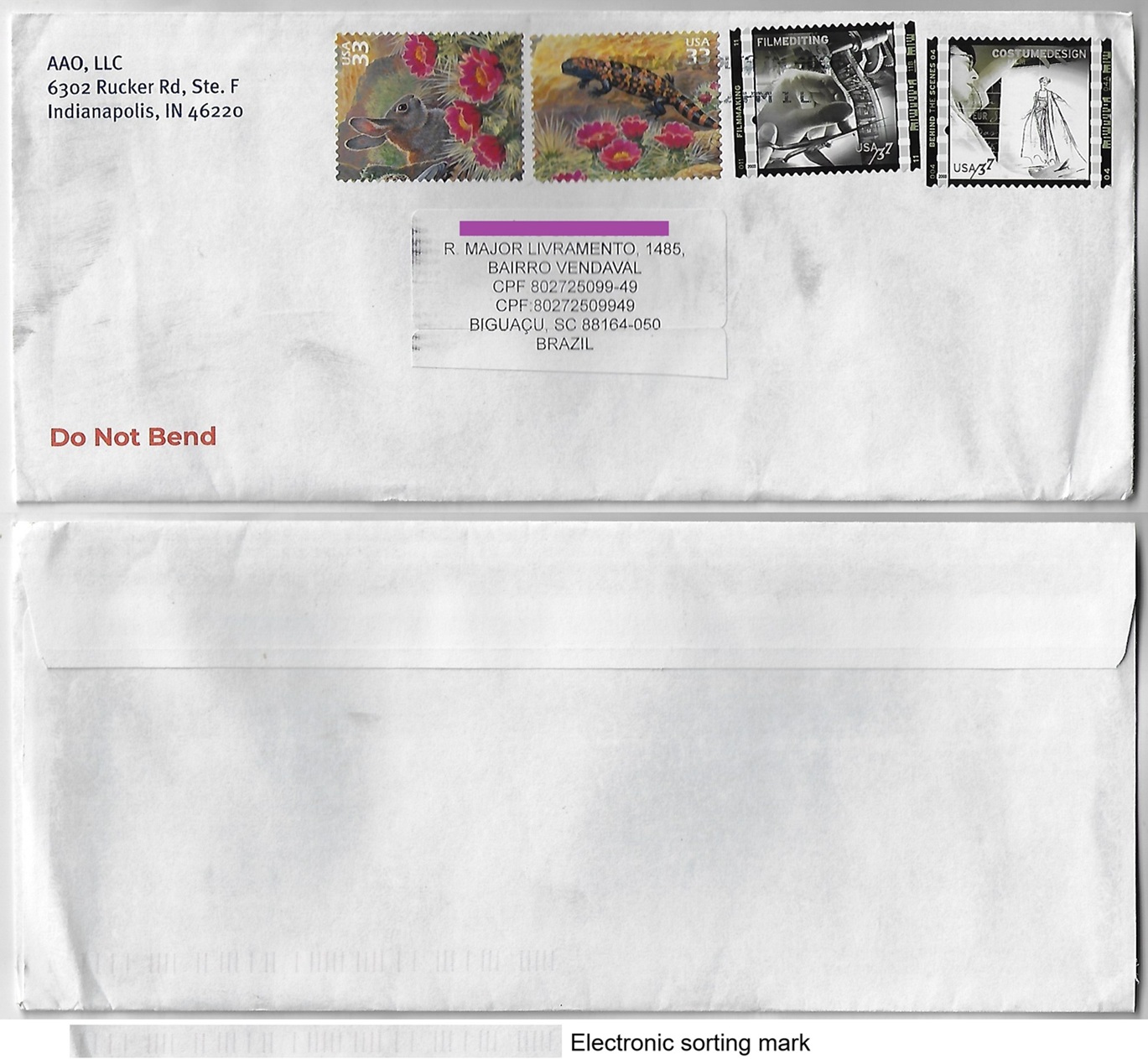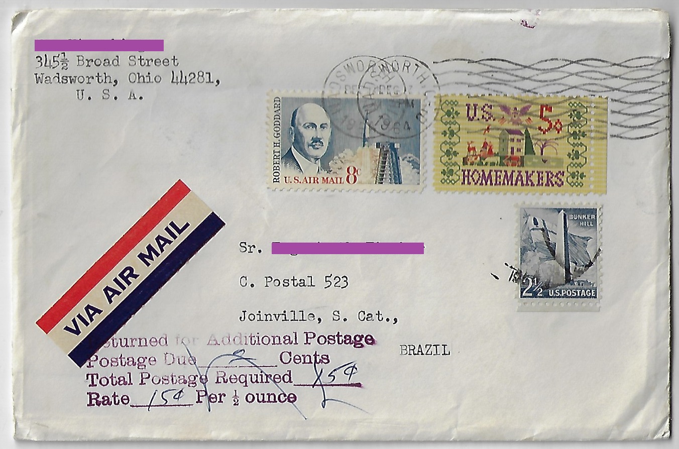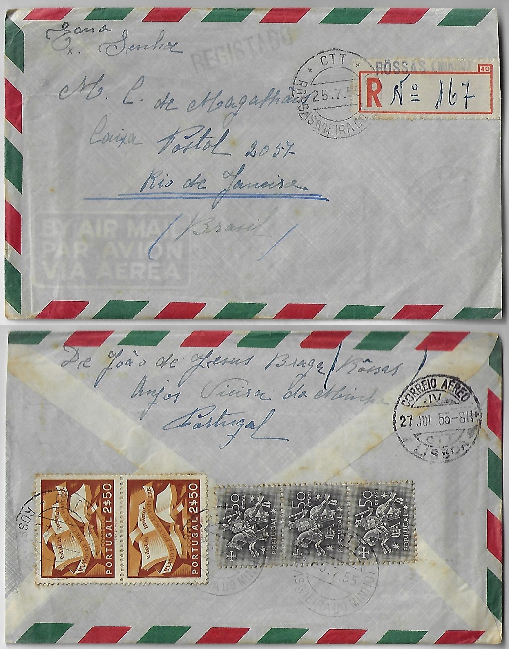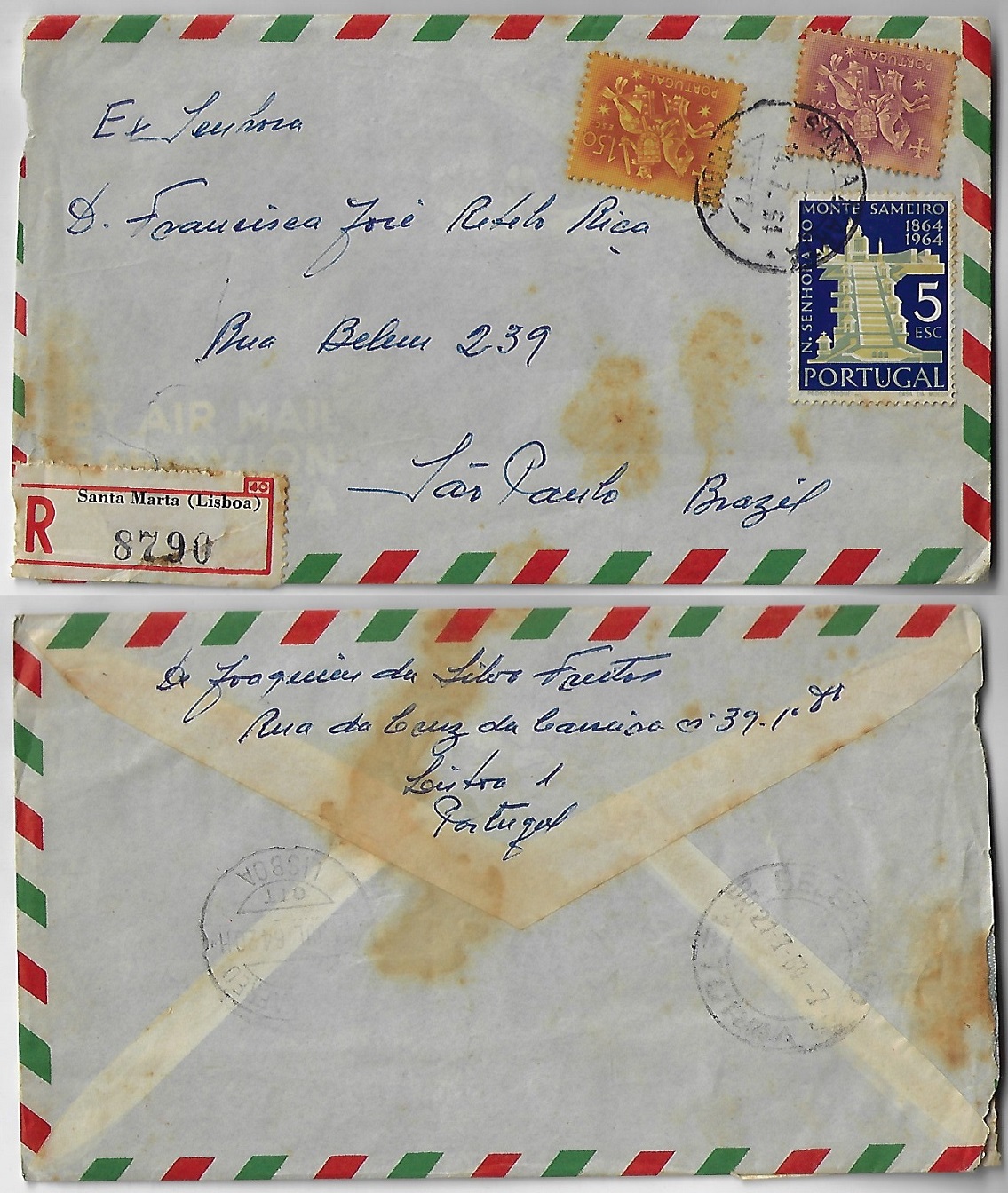 | 57575 | Uruguai, 1965, envelope aéreo registrado enviado de Montevidéu, via Porto Alegre (2/4) para Joinville, furo de cupim, porteado com selo Morte do Presidente dos EUA John F. Kennedy | 10,00 | Foto |