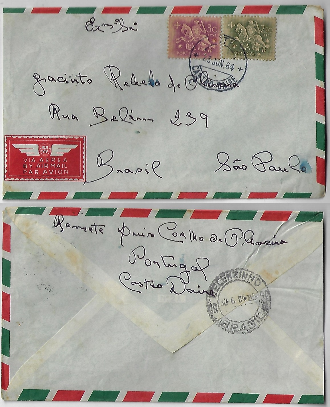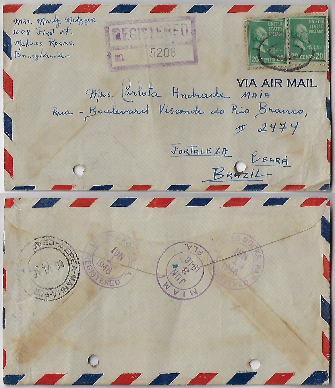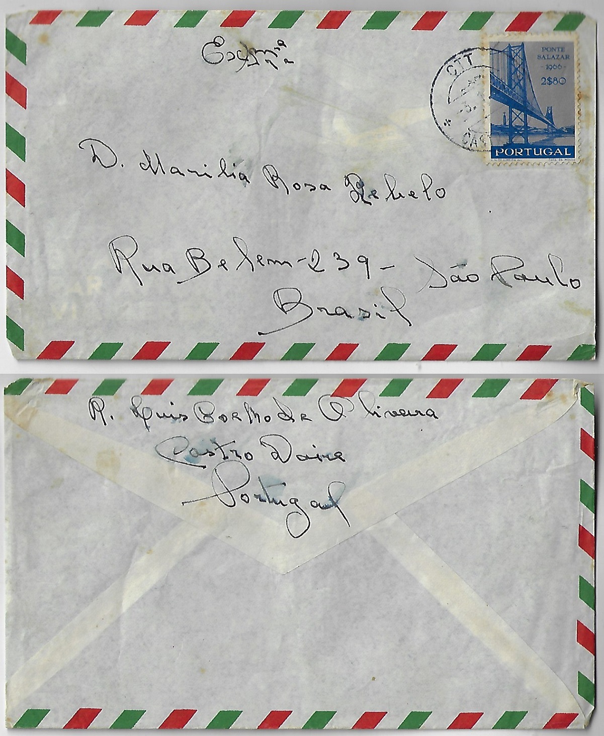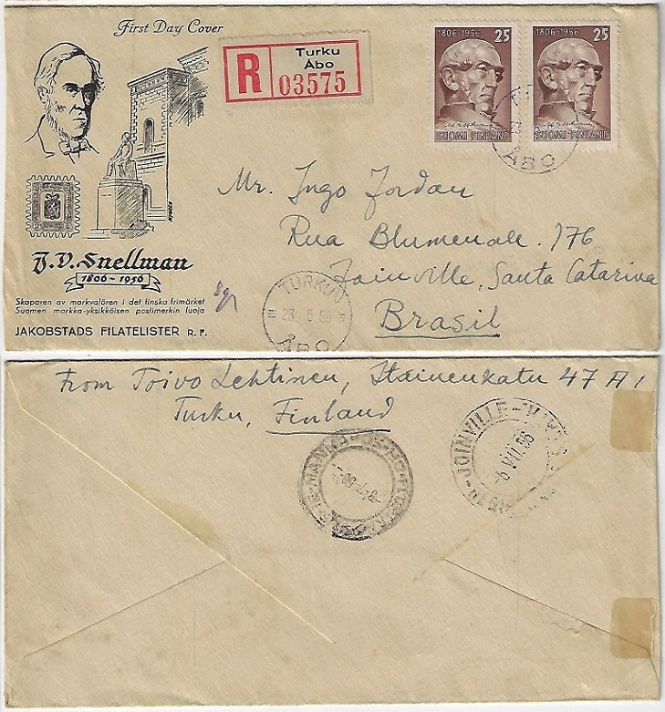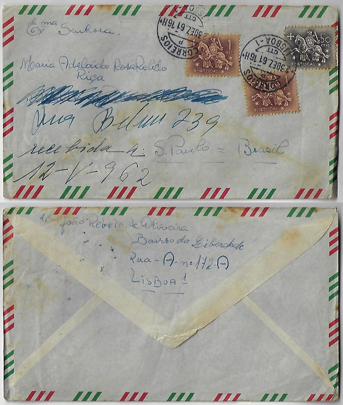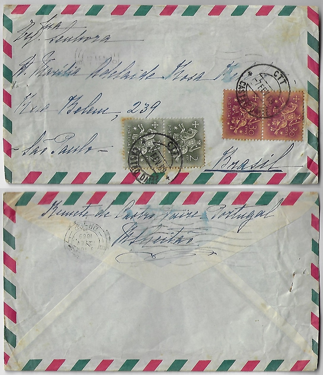 | 57575 | Uruguai, 1965, envelope aéreo registrado enviado de Montevidéu, via Porto Alegre (2/4) para Joinville, furo de cupim, porteado com selo Morte do Presidente dos EUA John F. Kennedy | 10,00 | Foto |