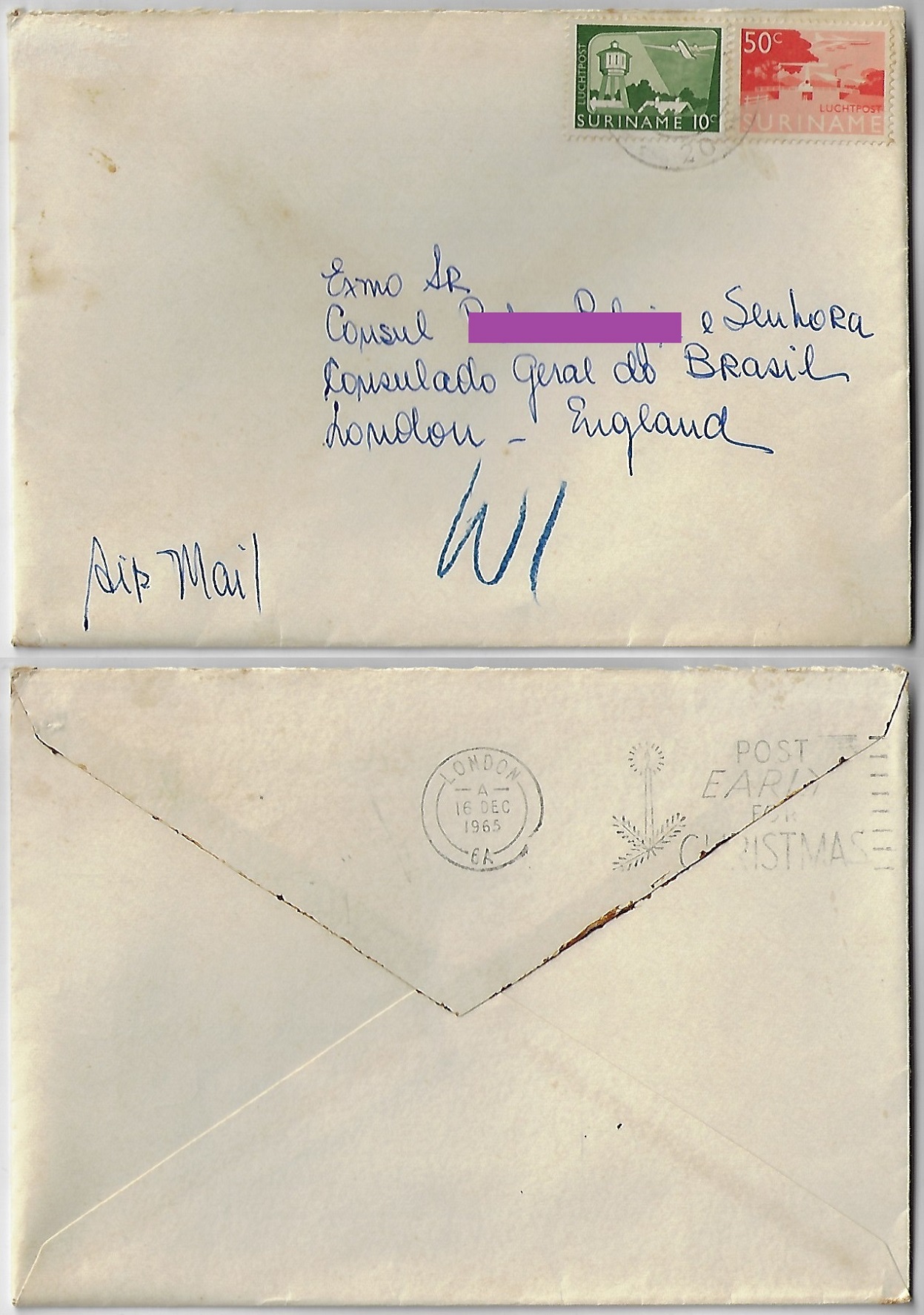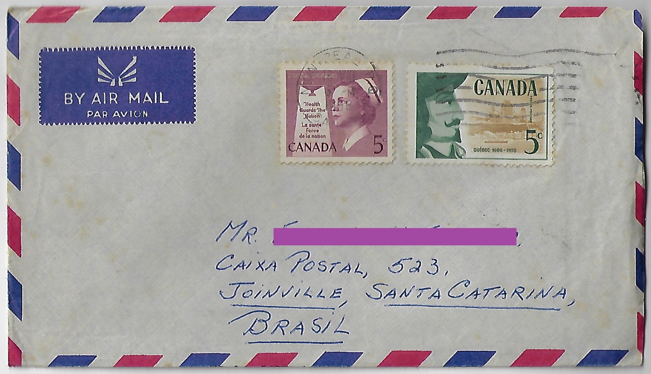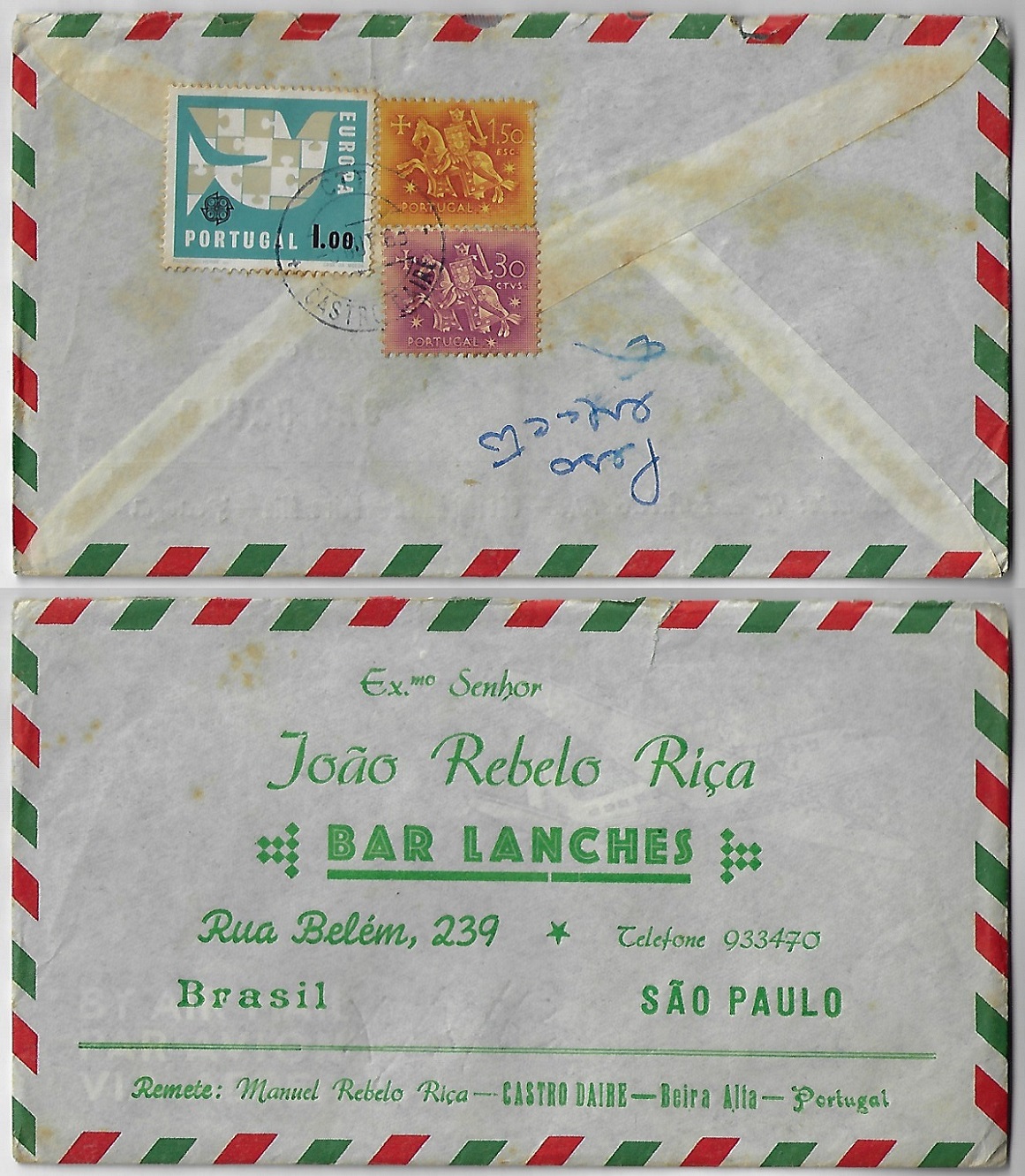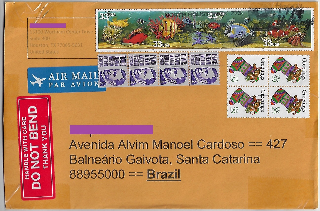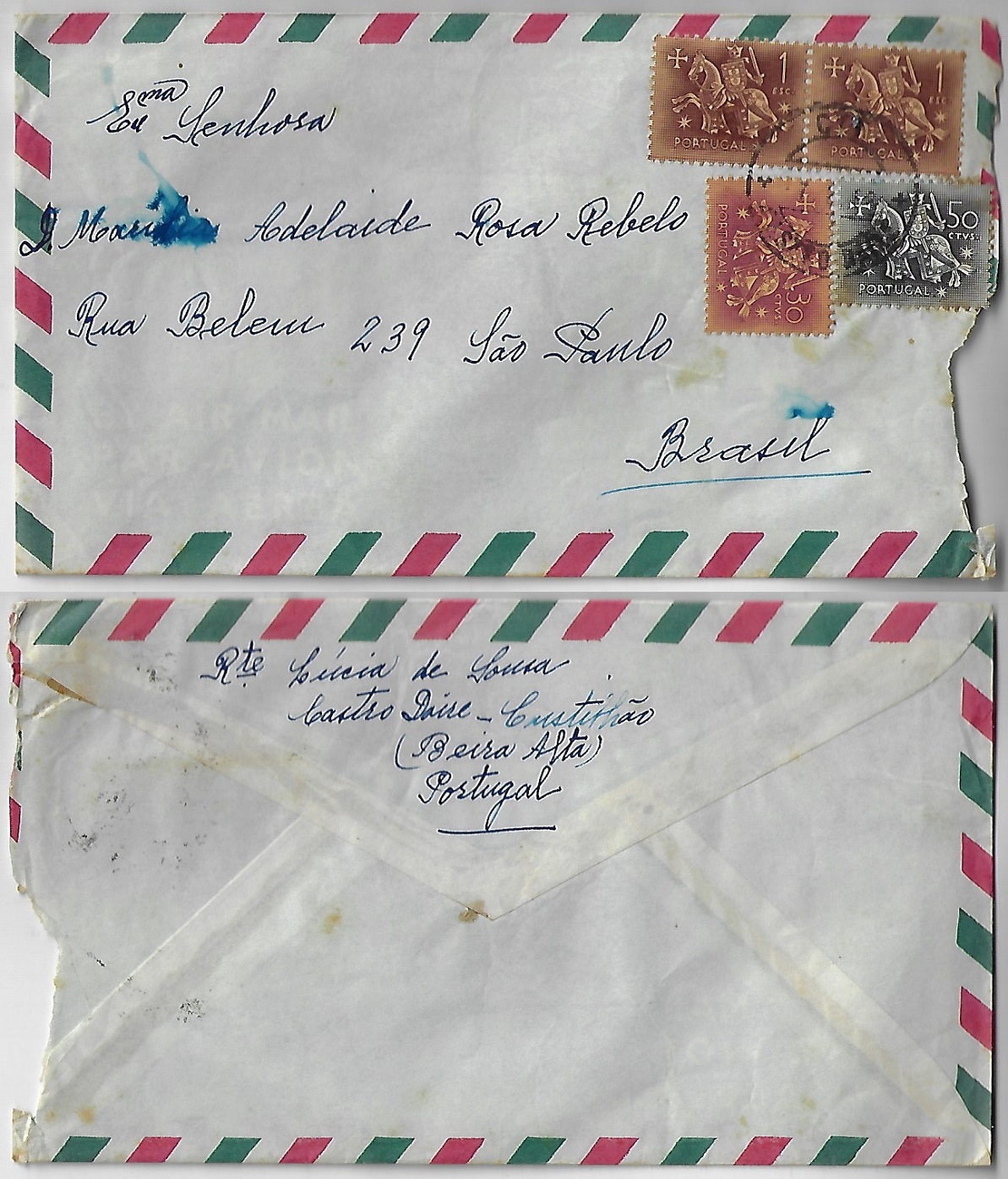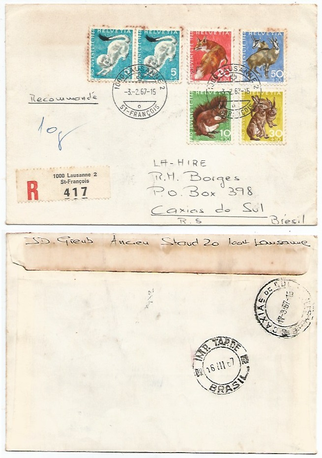 | 57575 | Uruguai, 1965, envelope aéreo registrado enviado de Montevidéu, via Porto Alegre (2/4) para Joinville, furo de cupim, porteado com selo Morte do Presidente dos EUA John F. Kennedy | 10,00 | Foto |