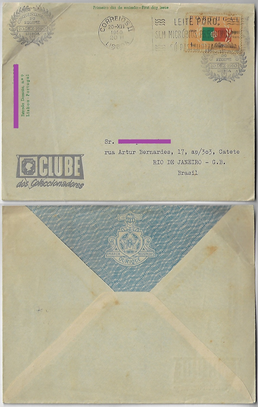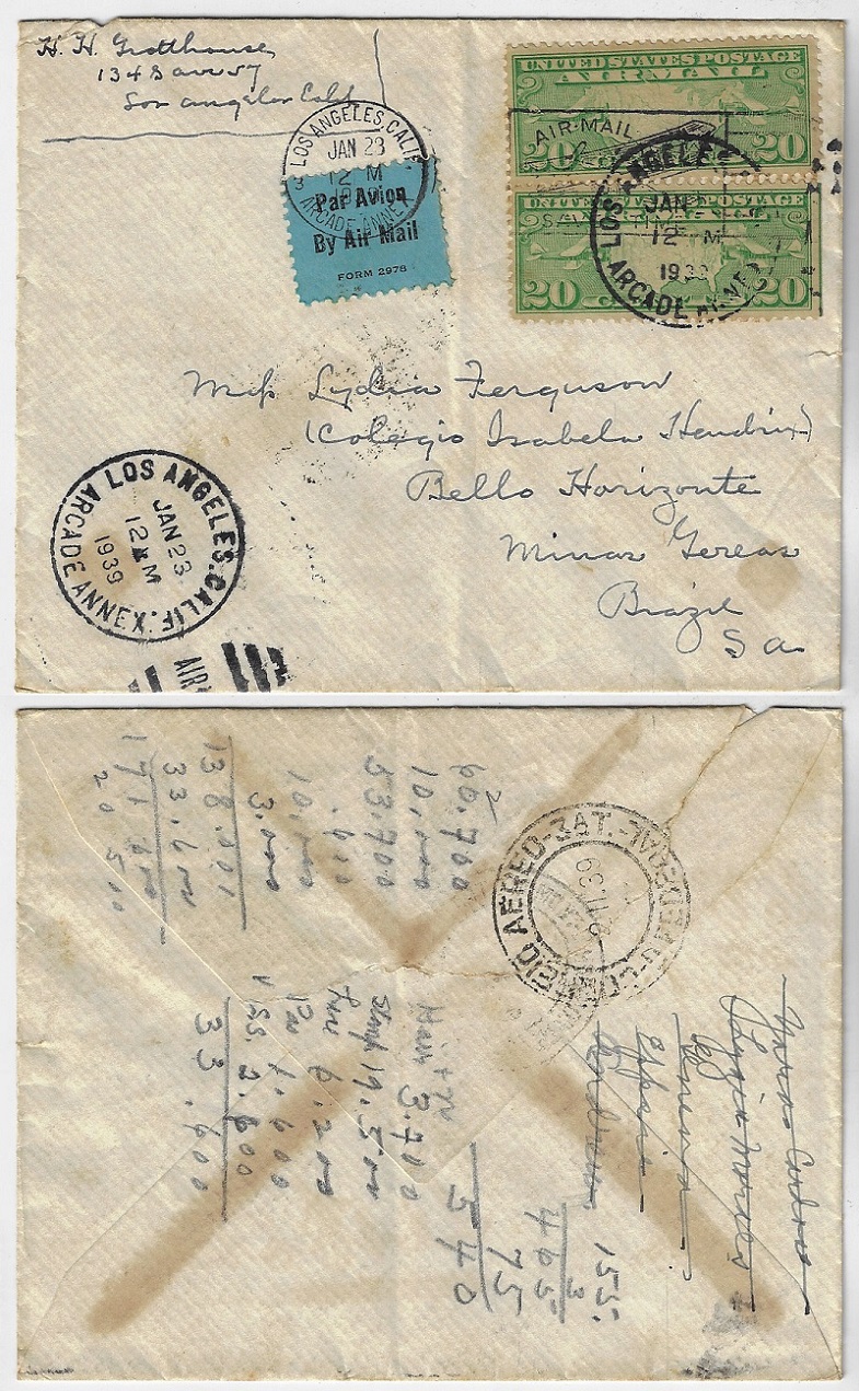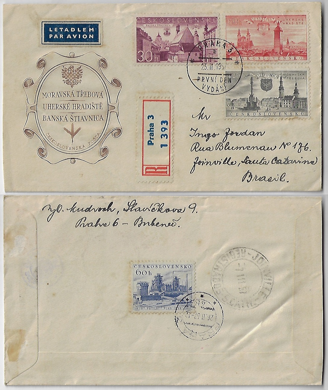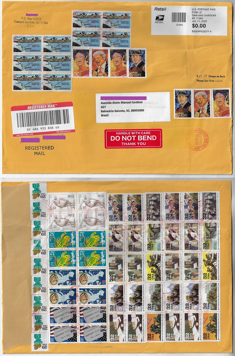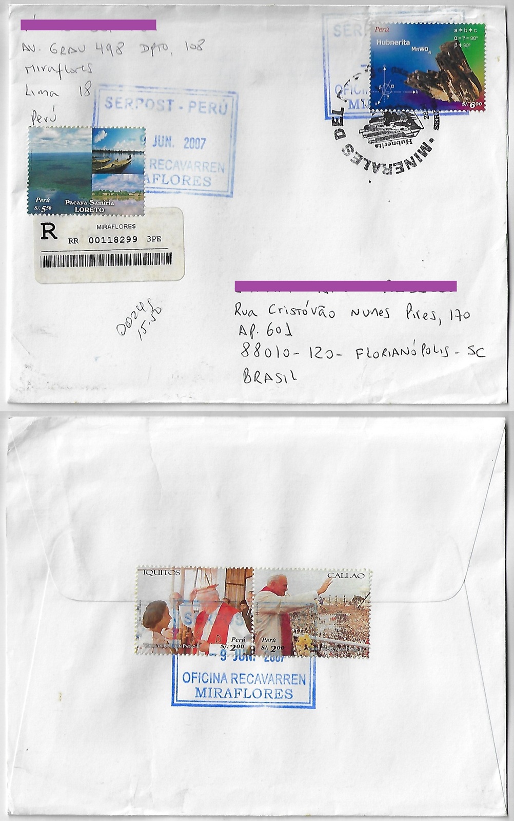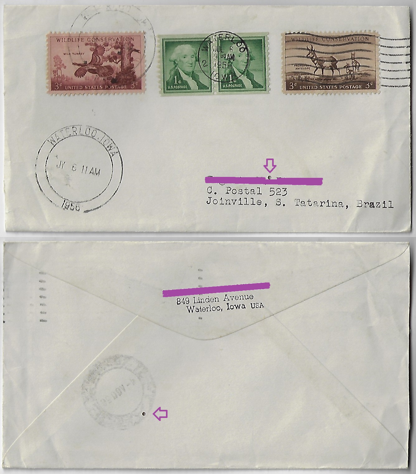 | 57575 | Uruguai, 1965, envelope aéreo registrado enviado de Montevidéu, via Porto Alegre (2/4) para Joinville, furo de cupim, porteado com selo Morte do Presidente dos EUA John F. Kennedy | 10,00 | Foto |