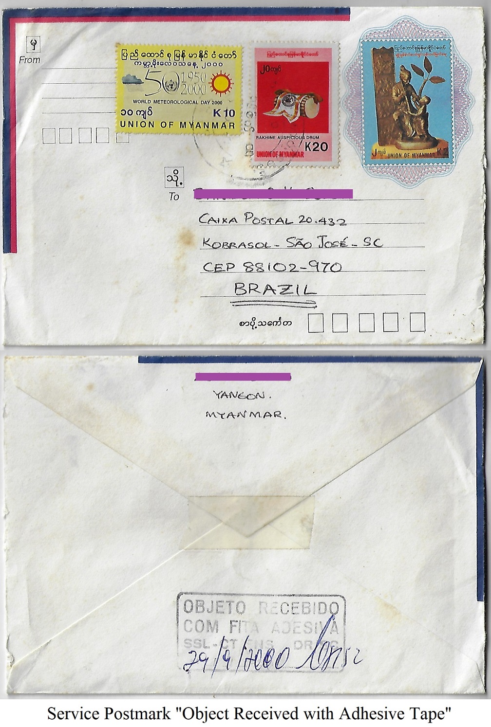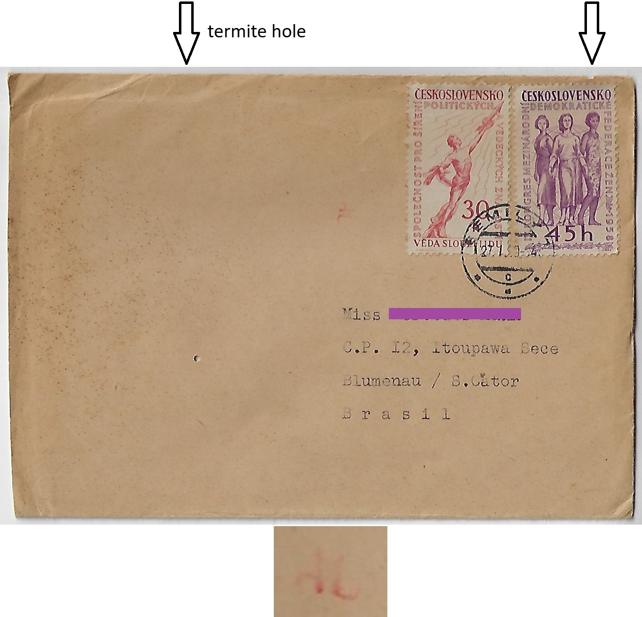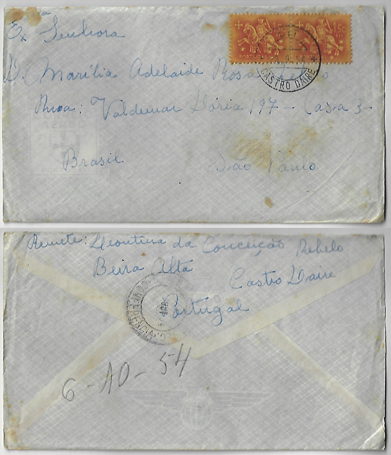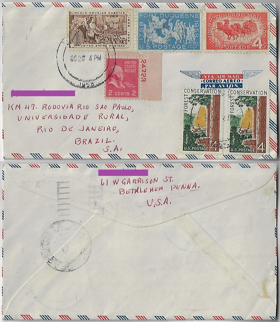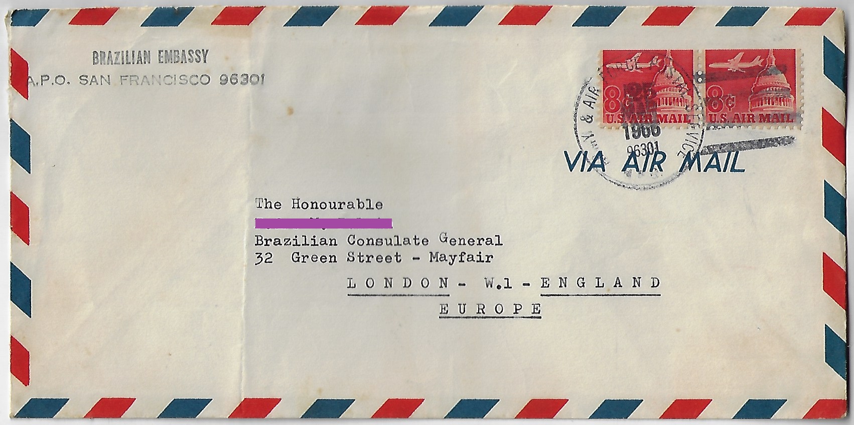 | 57575 | Uruguai, 1965, envelope aéreo registrado enviado de Montevidéu, via Porto Alegre (2/4) para Joinville, furo de cupim, porteado com selo Morte do Presidente dos EUA John F. Kennedy | 10,00 | Foto |
