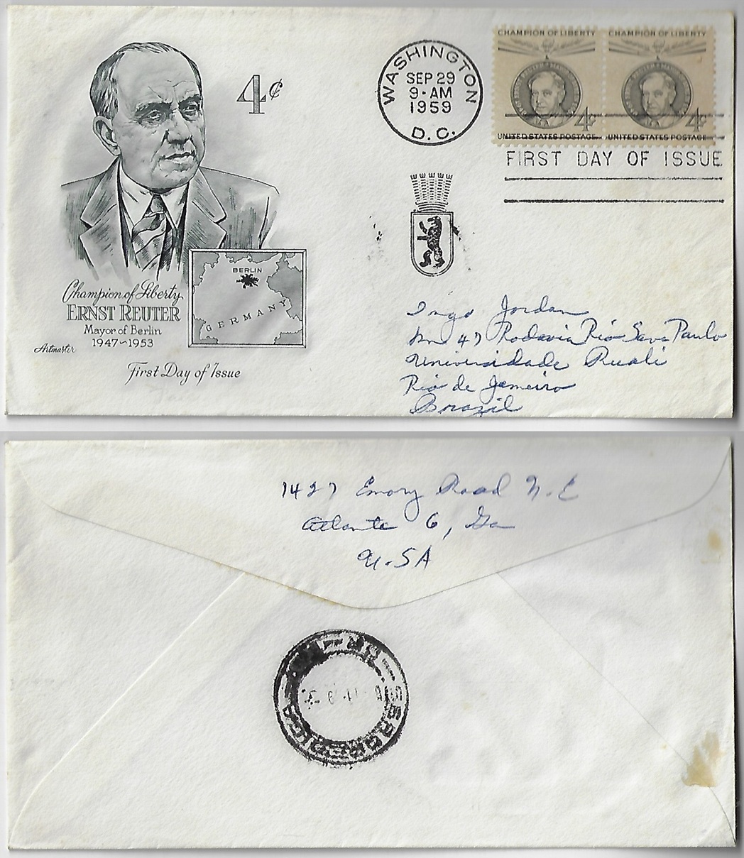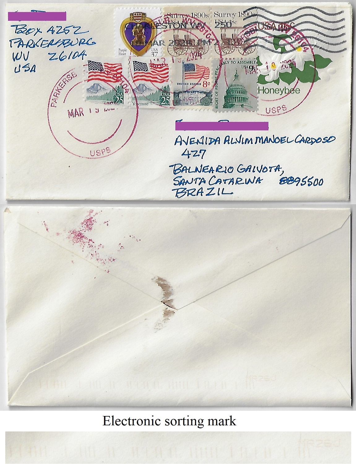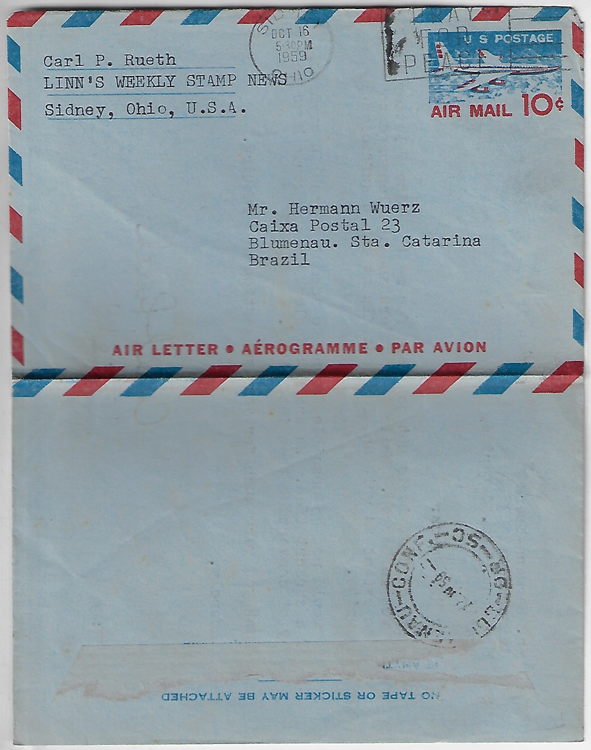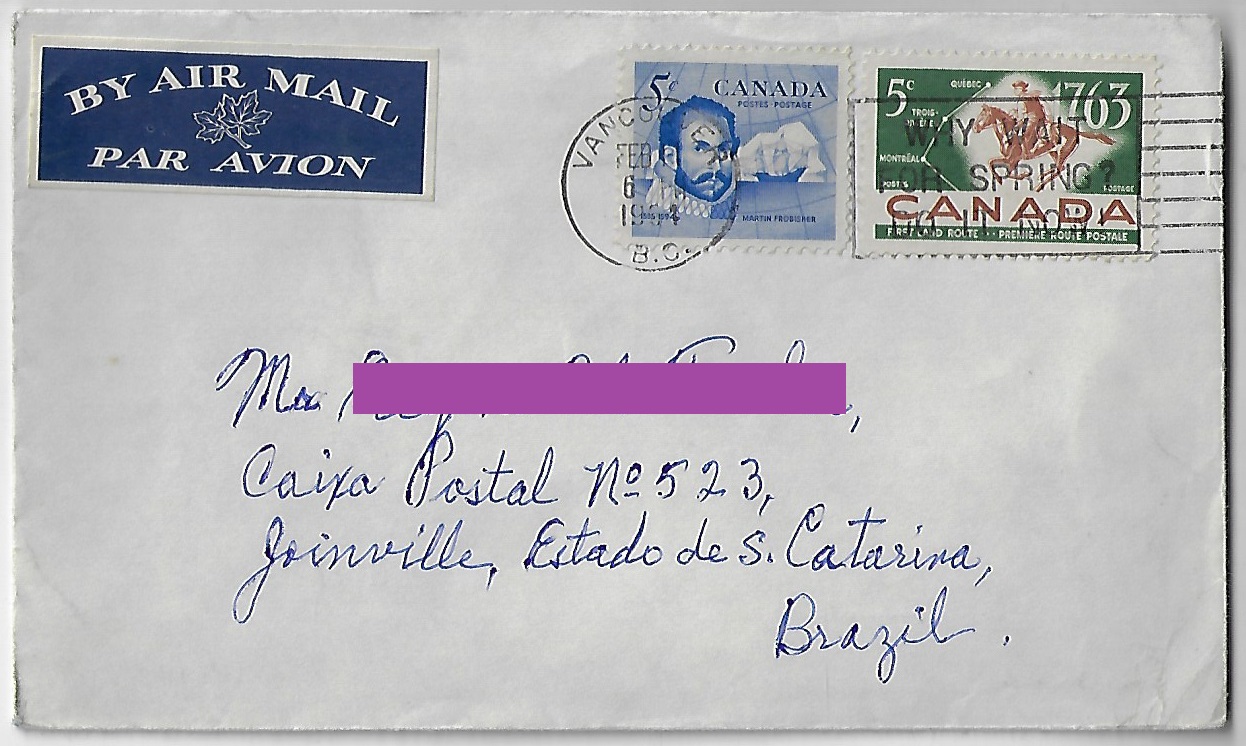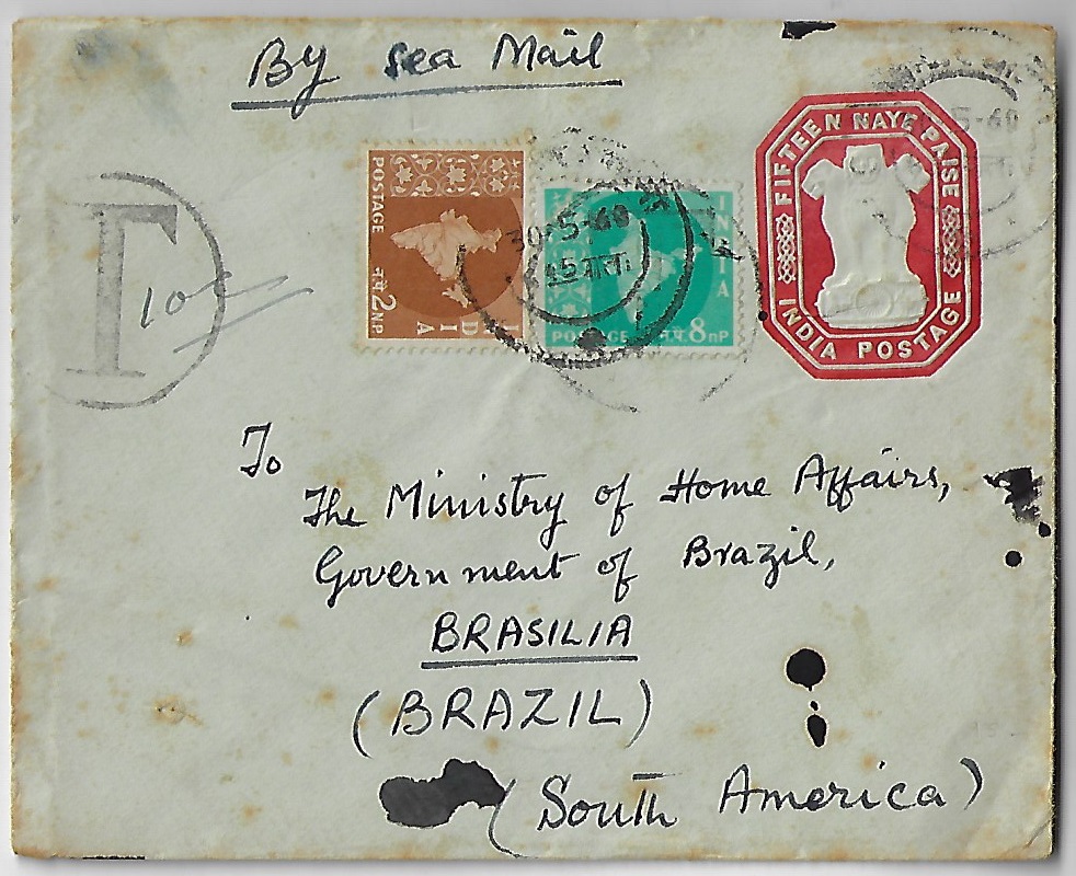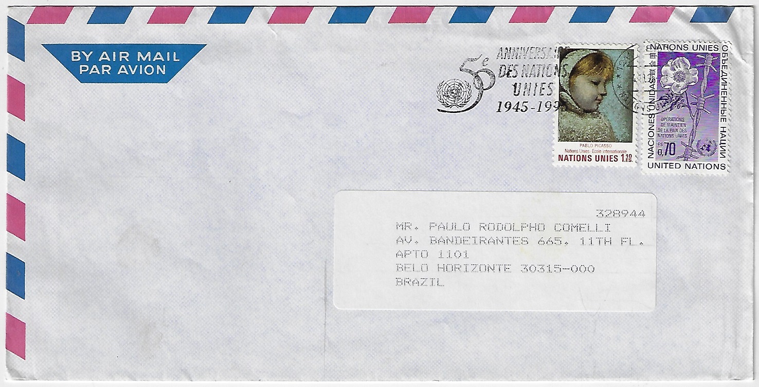 | 57575 | Uruguai, 1965, envelope aéreo registrado enviado de Montevidéu, via Porto Alegre (2/4) para Joinville, furo de cupim, porteado com selo Morte do Presidente dos EUA John F. Kennedy | 10,00 | Foto |