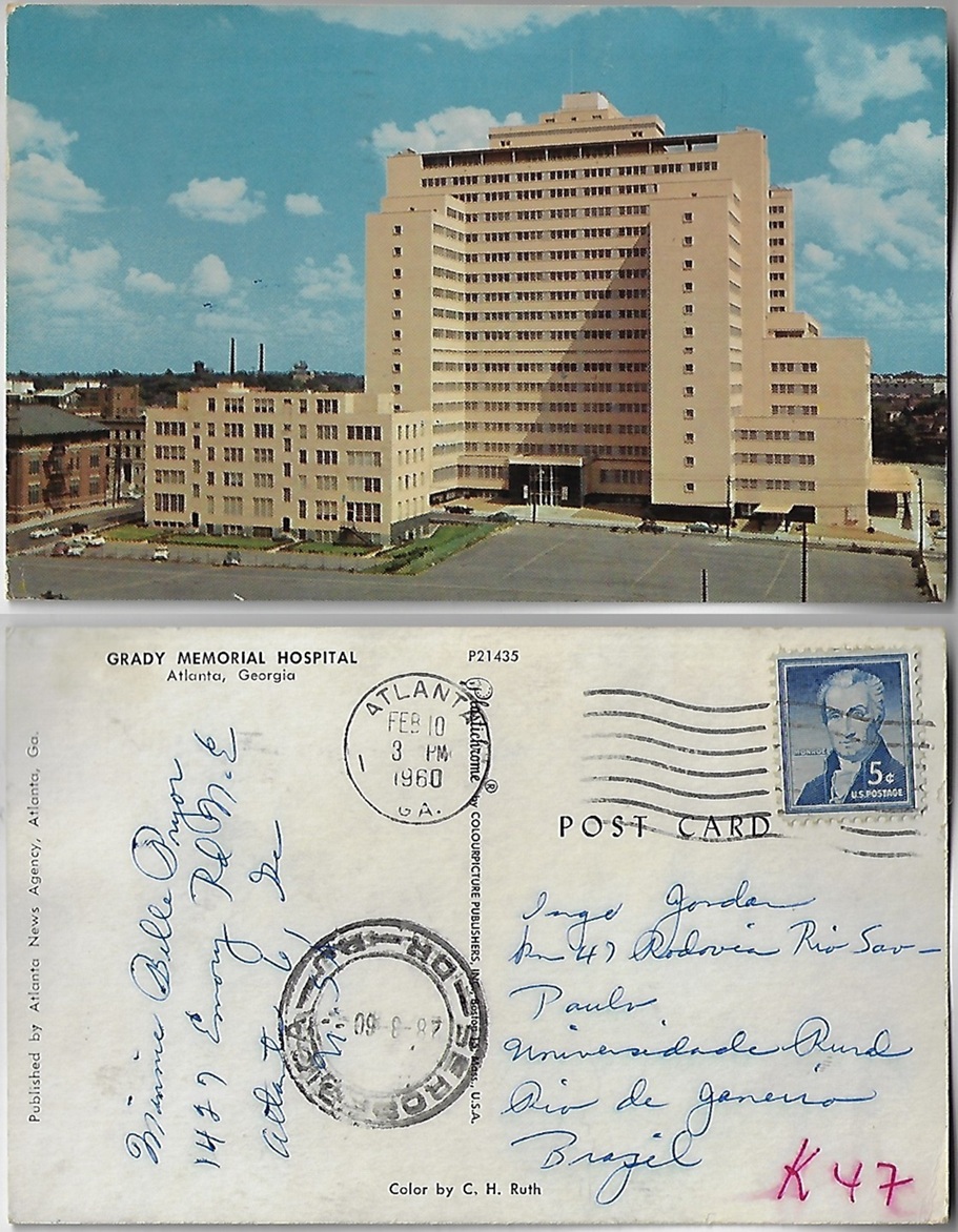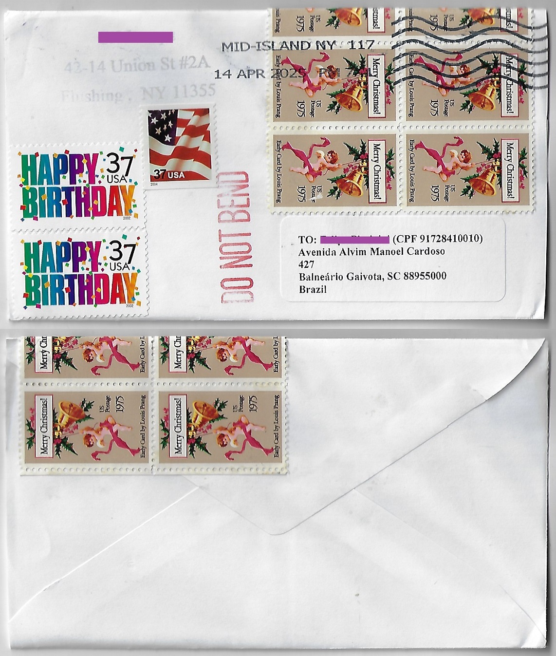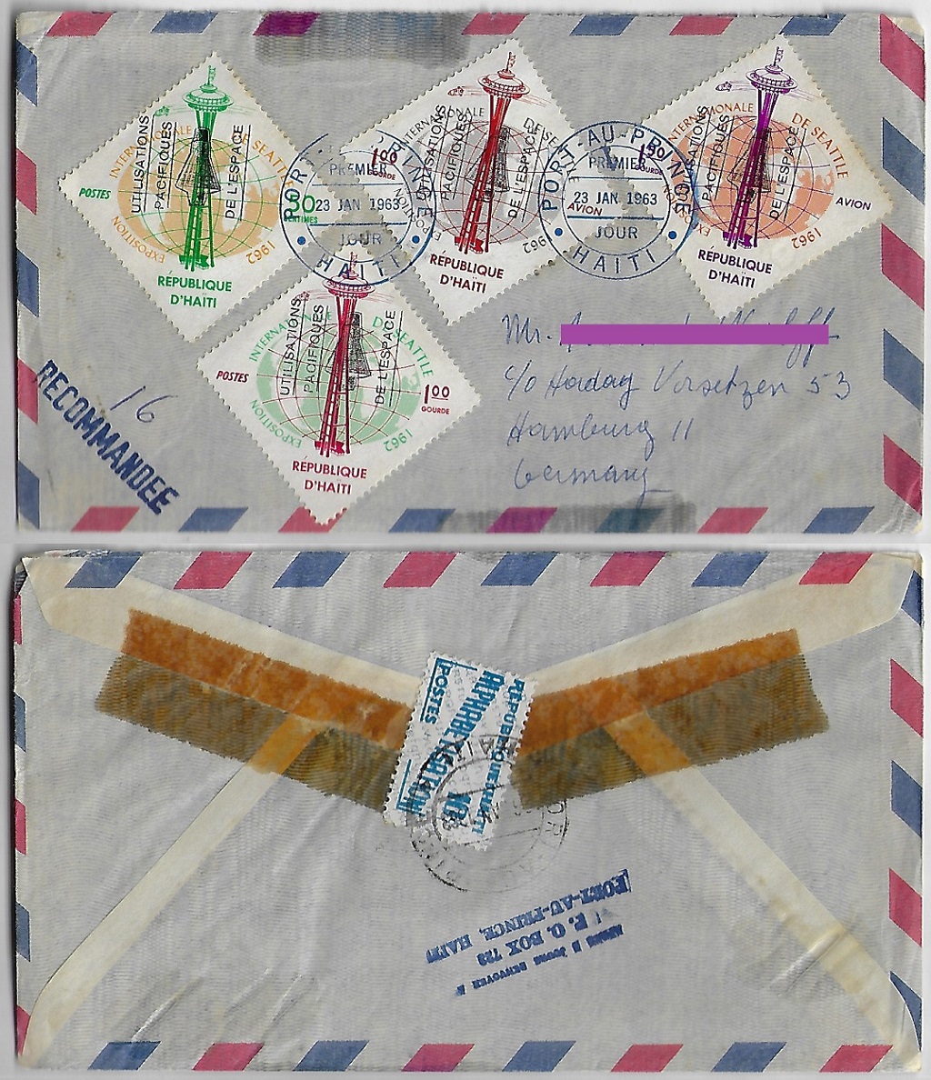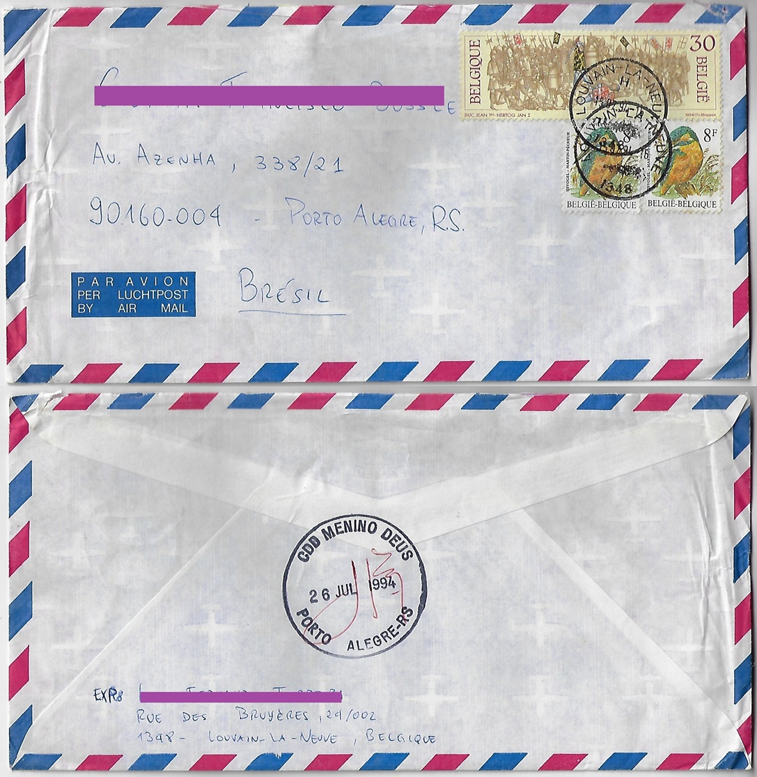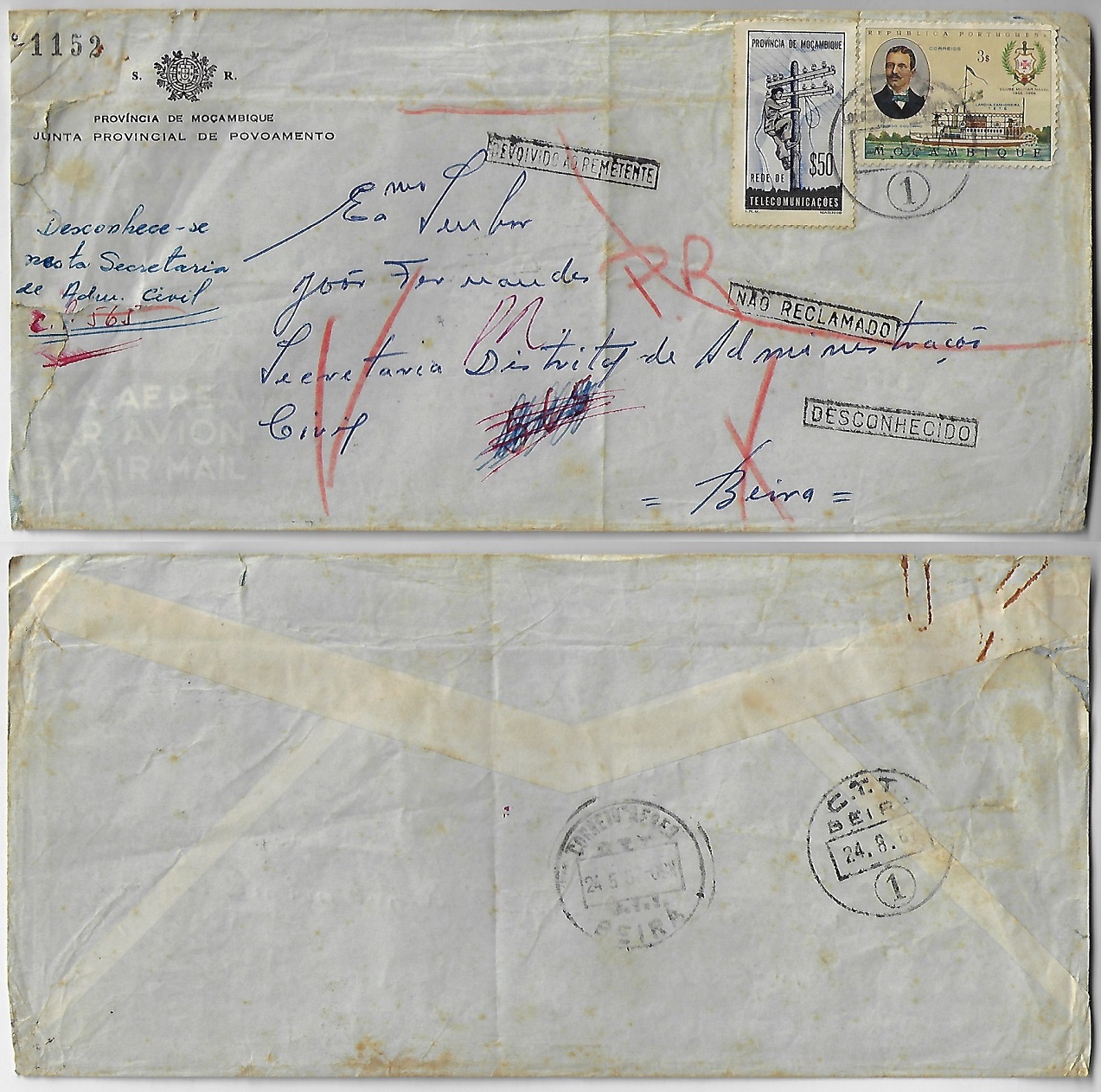 | 57575 | Uruguai, 1965, envelope aéreo registrado enviado de Montevidéu, via Porto Alegre (2/4) para Joinville, furo de cupim, porteado com selo Morte do Presidente dos EUA John F. Kennedy | 10,00 | Foto |