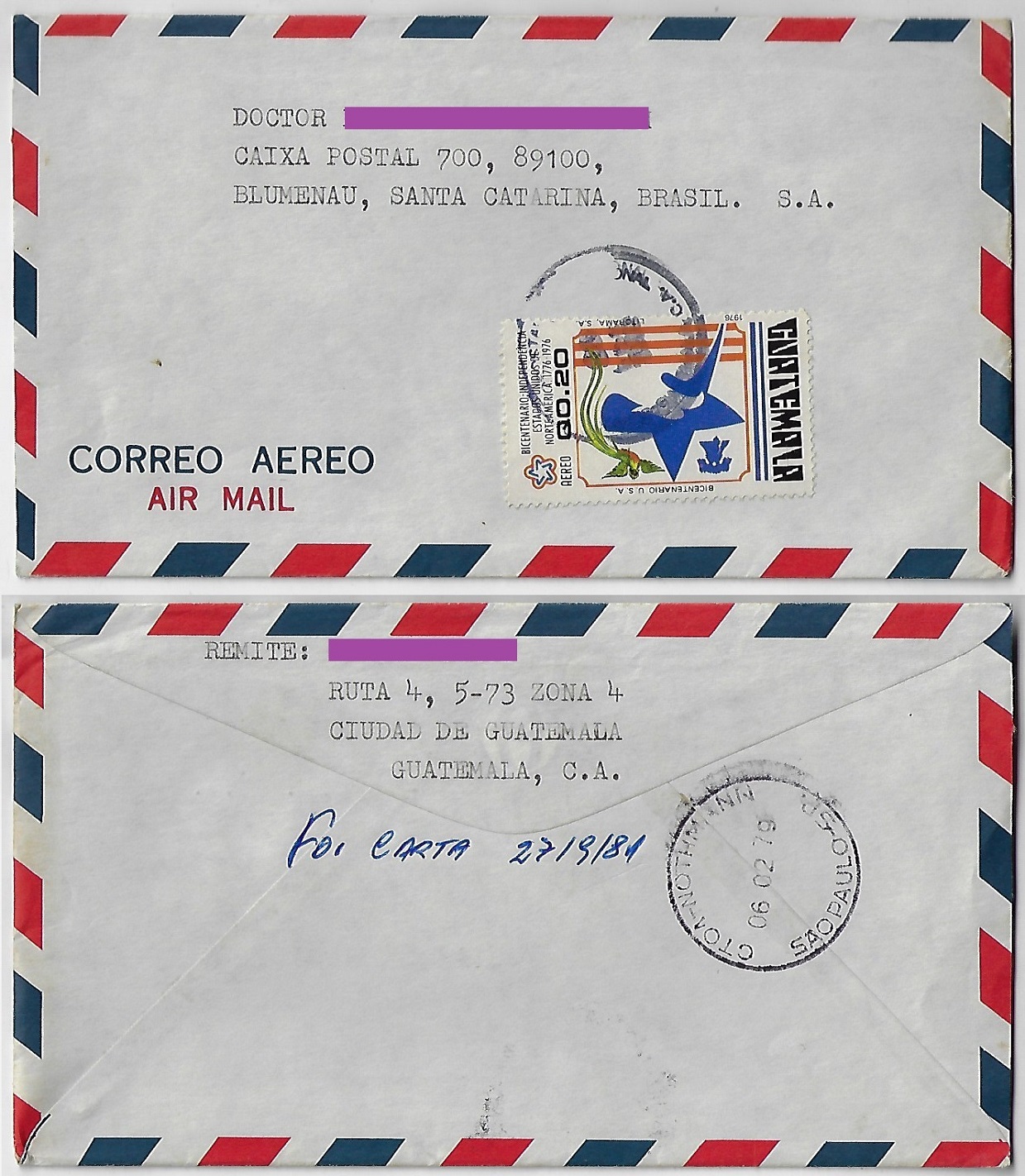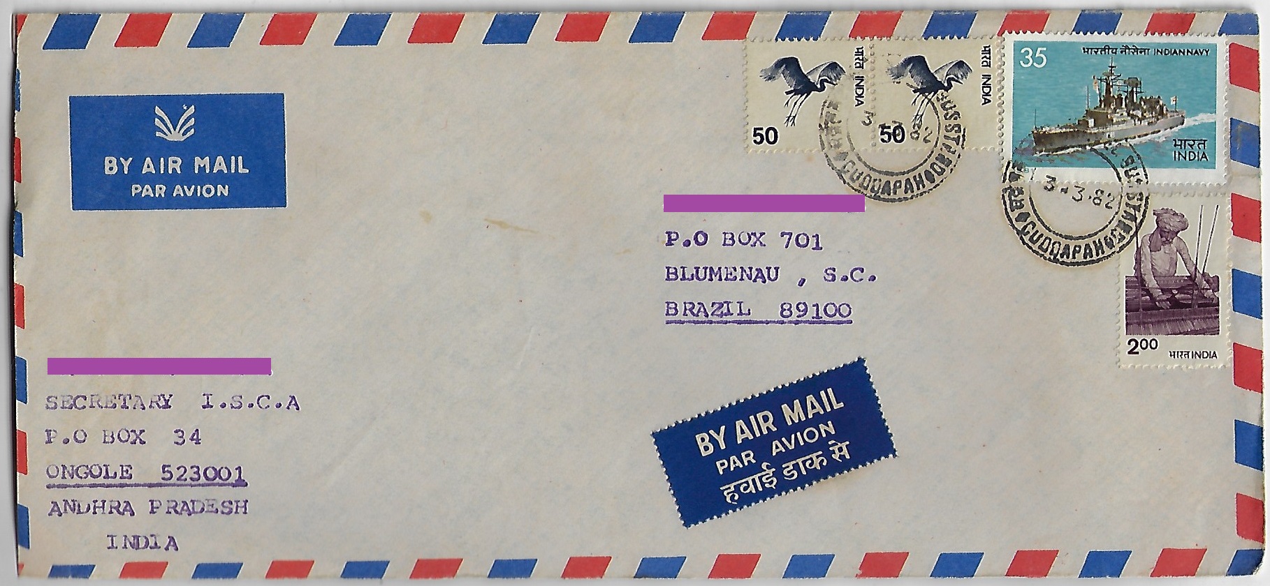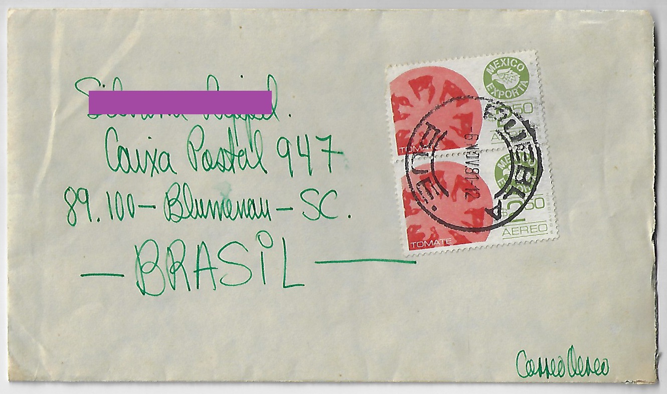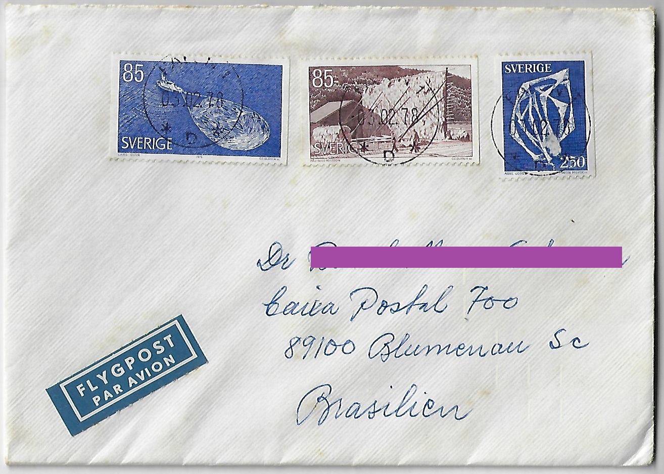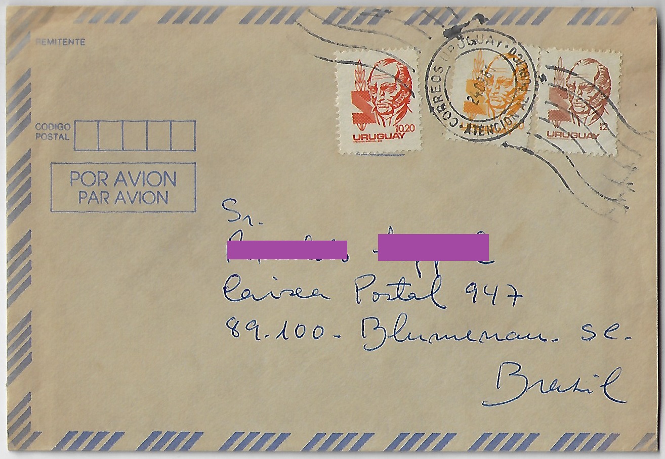 | 84654 | Uruguai, 1981, envelope aéreo enviado de Montevidéu (24/9) para Blumenau, porteado com 3 selos regulares diferentes José Gervasio Artigas | 10,00 | Foto |