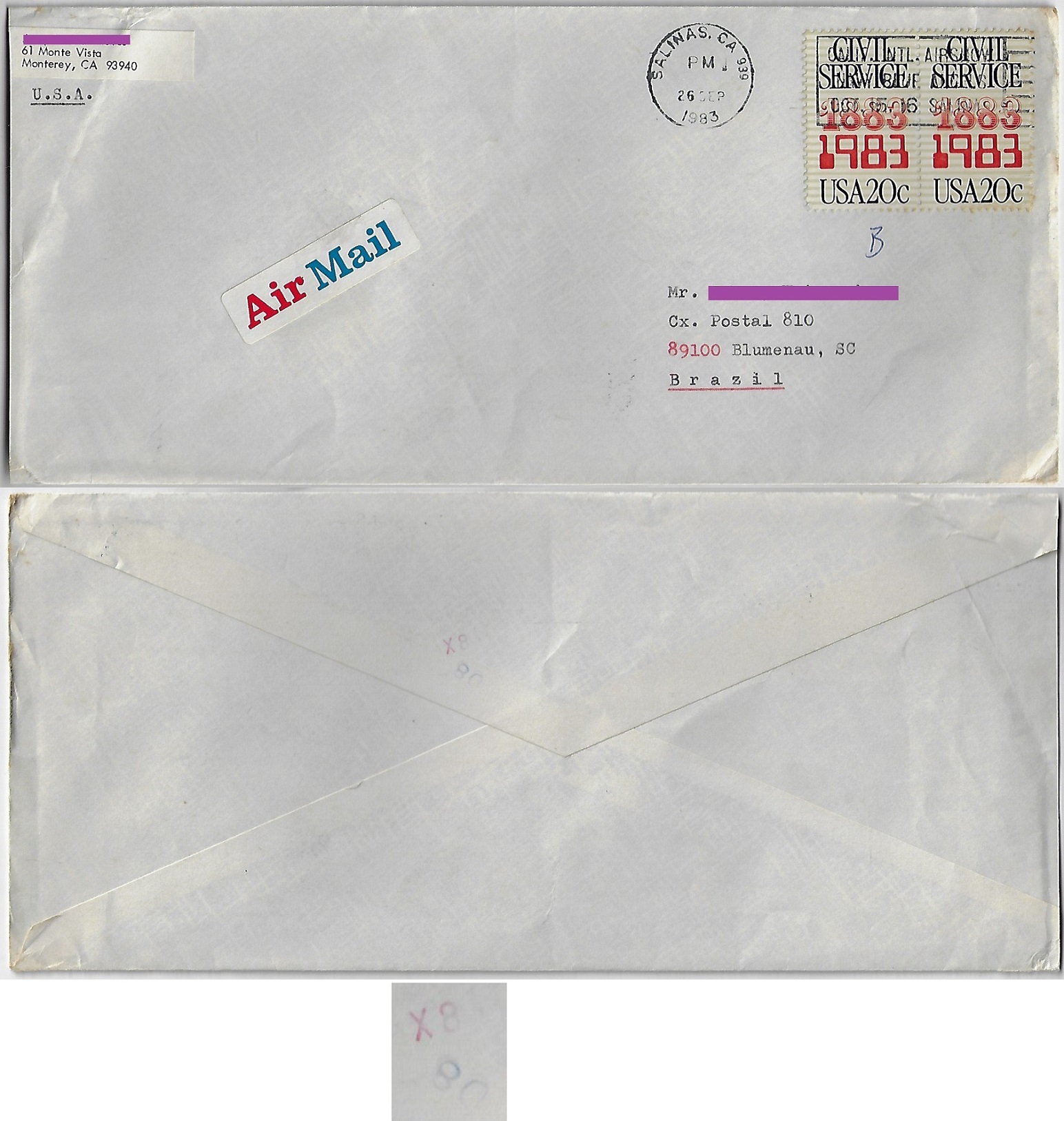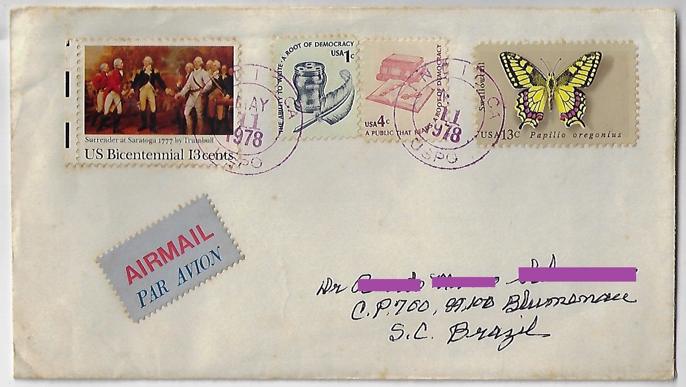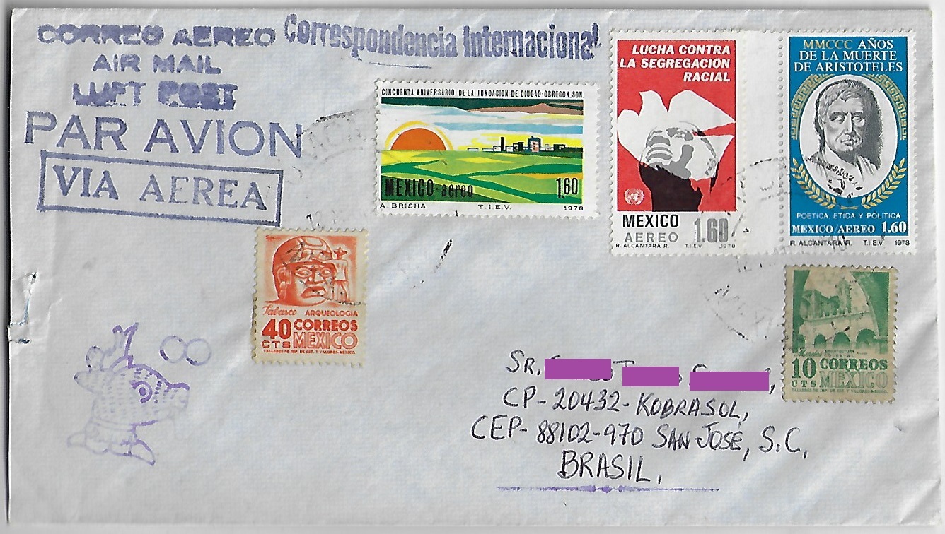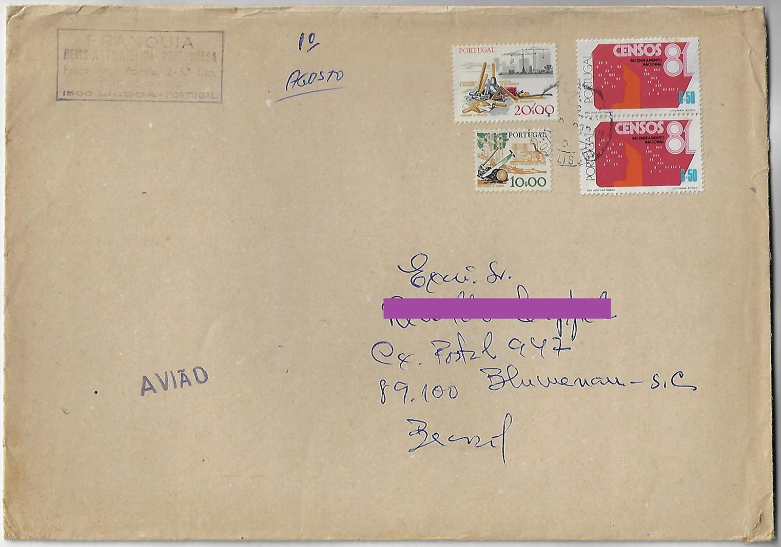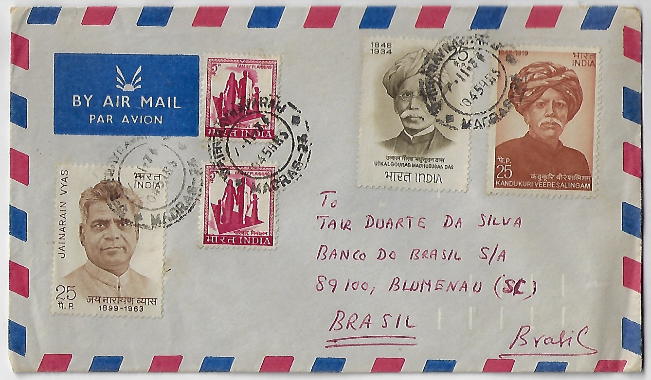 | 84654 | Uruguai, 1981, envelope aéreo enviado de Montevidéu (24/9) para Blumenau, porteado com 3 selos regulares diferentes José Gervasio Artigas | 10,00 | Foto |