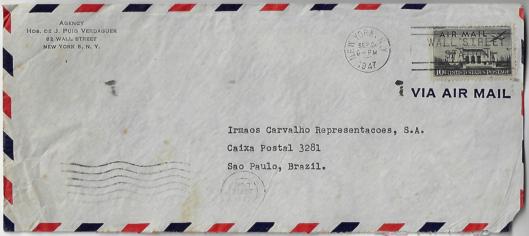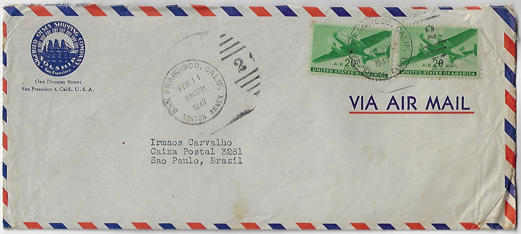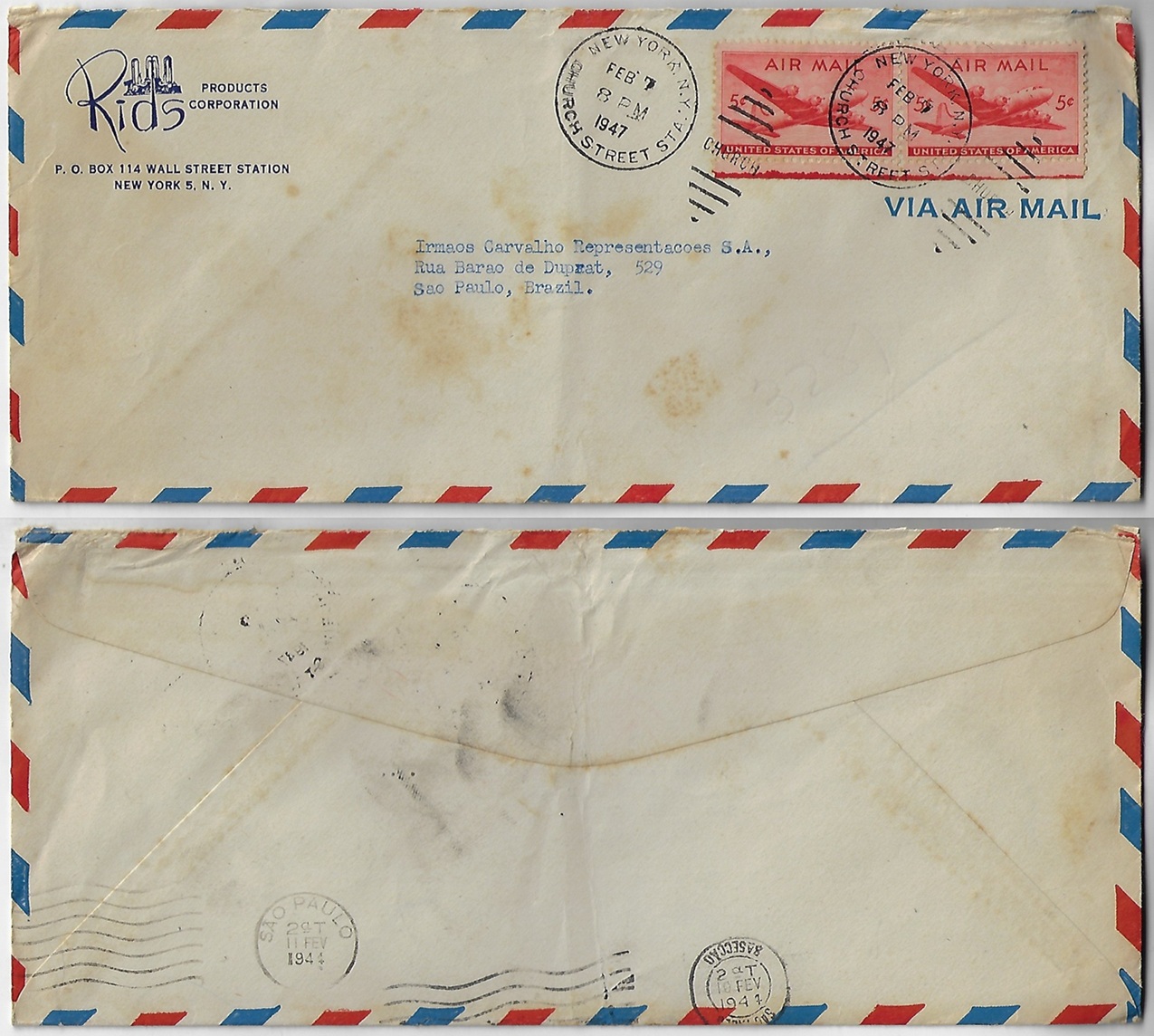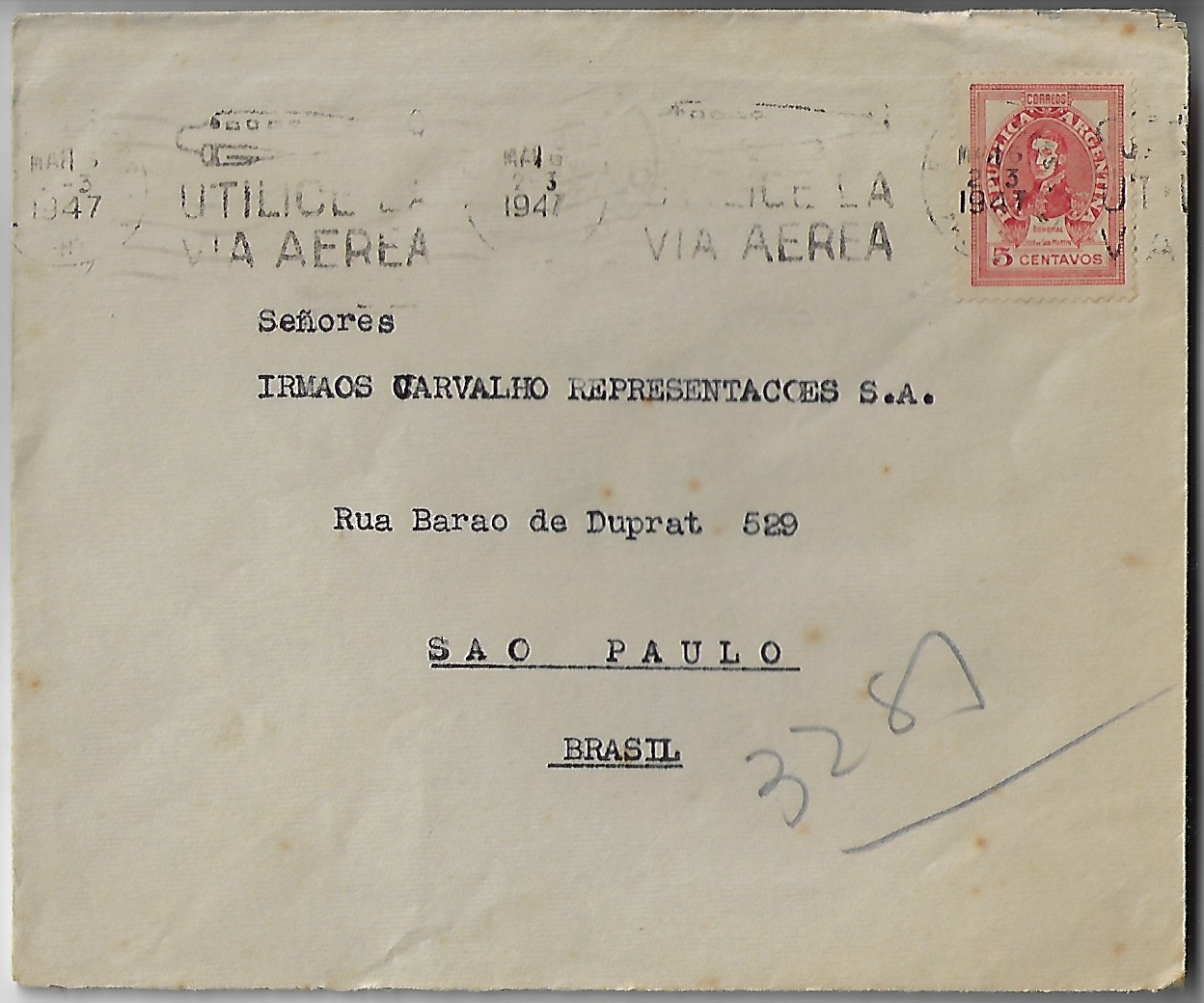 | 78757 | Argentina, 1947, envelope comercial de La Araucana enviado de Buenos Aires para São Paulo, reencaminhado para Caixa Postal, selo San Martin, carimbo com slogan "Utilize a via aérea" | 10,00 | Foto |