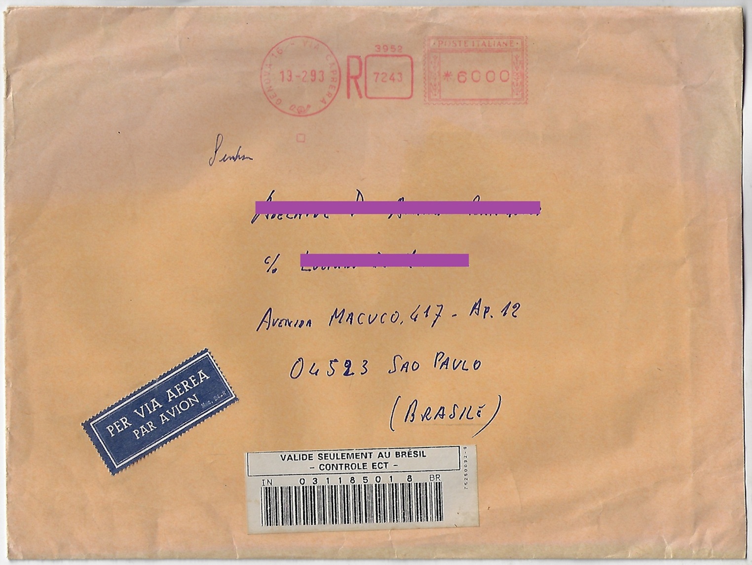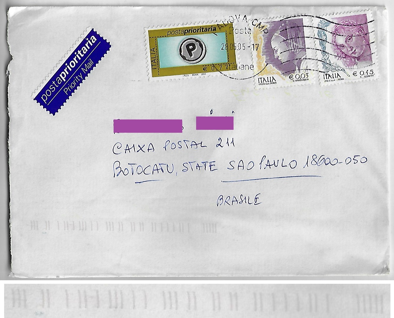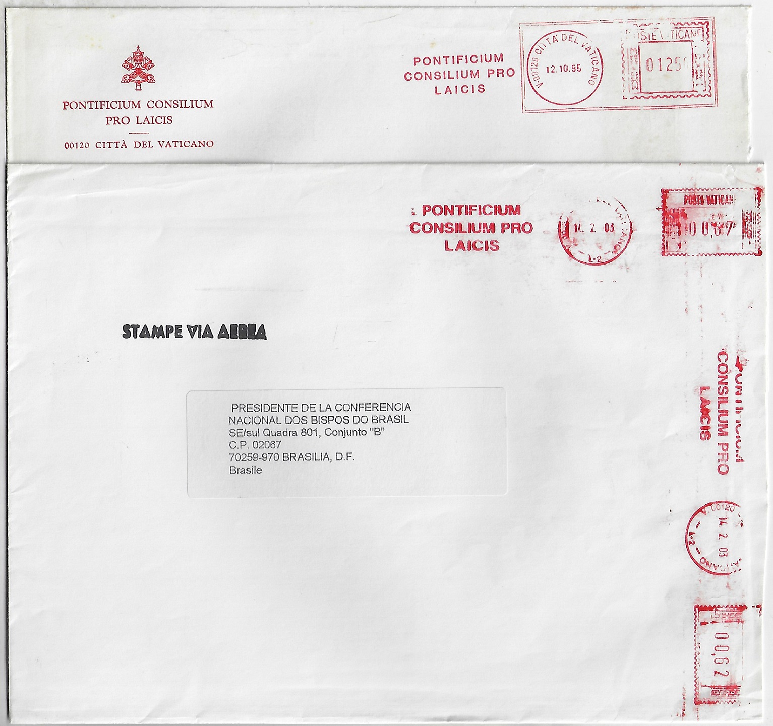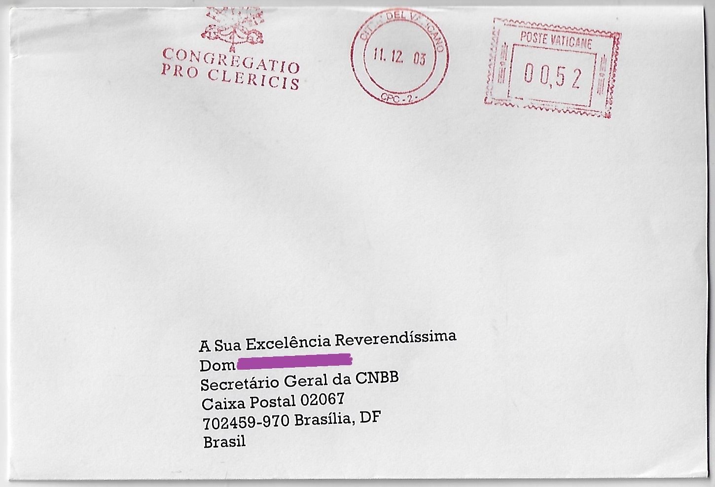 | 79069 | Vaticano, 2003, envelope enviado para Brasília, porteado com franquia mecânica Neopost “Electronic” com slogan "Congregatio Pro Clericis (Congregação para o Clero)" | 10,00 | Foto |