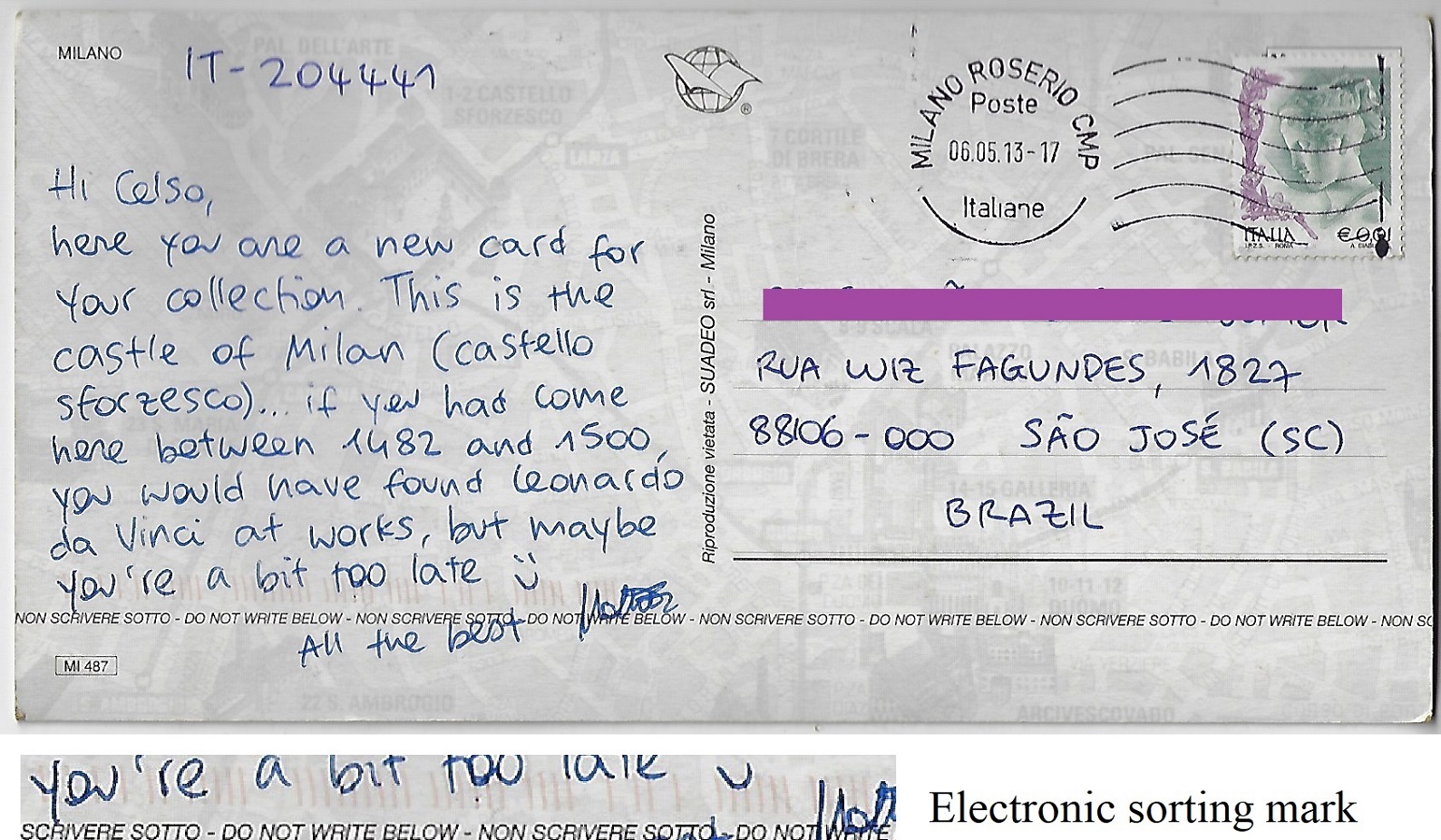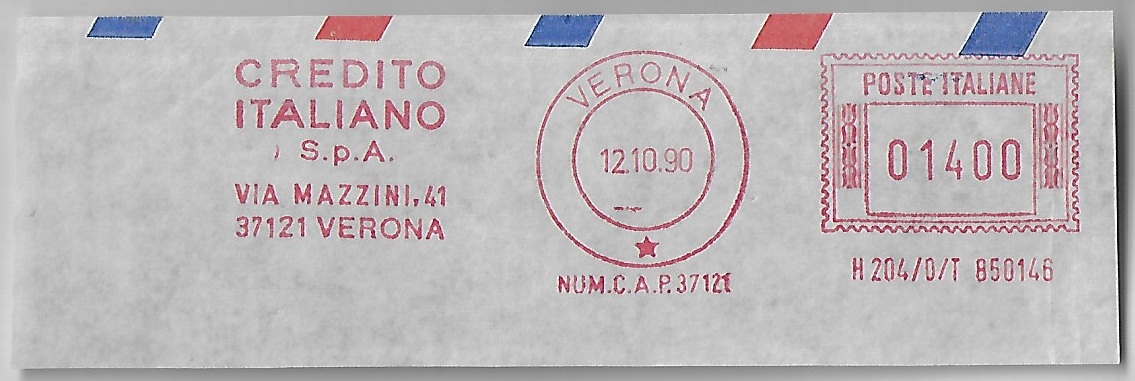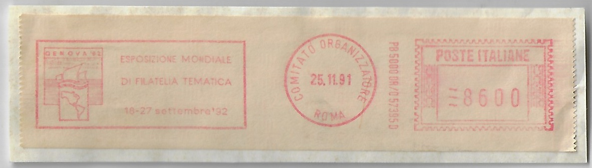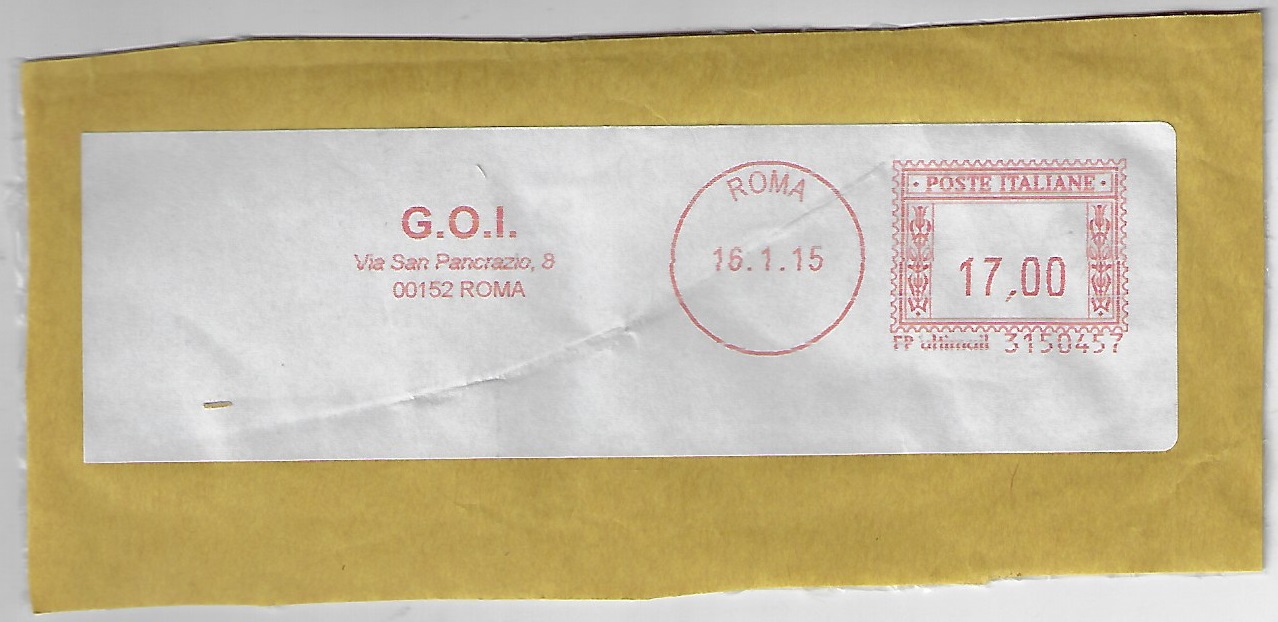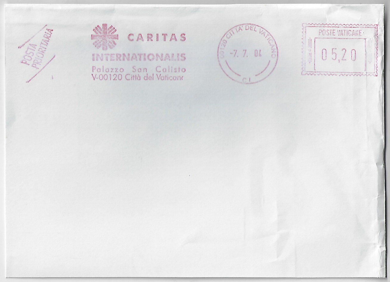 | 42637 | Vaticano, 2004, fragmento de envelope prioritário porteado com franquia mecânica Neopost “Electronic” com slogan "Caritas Internationalis (Caridade Internacional)" | 10,00 | Foto |