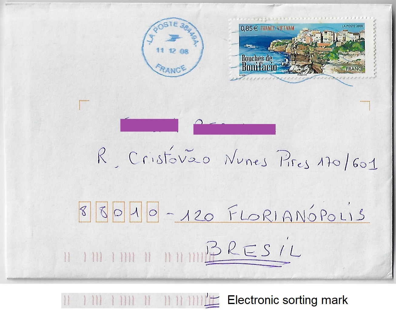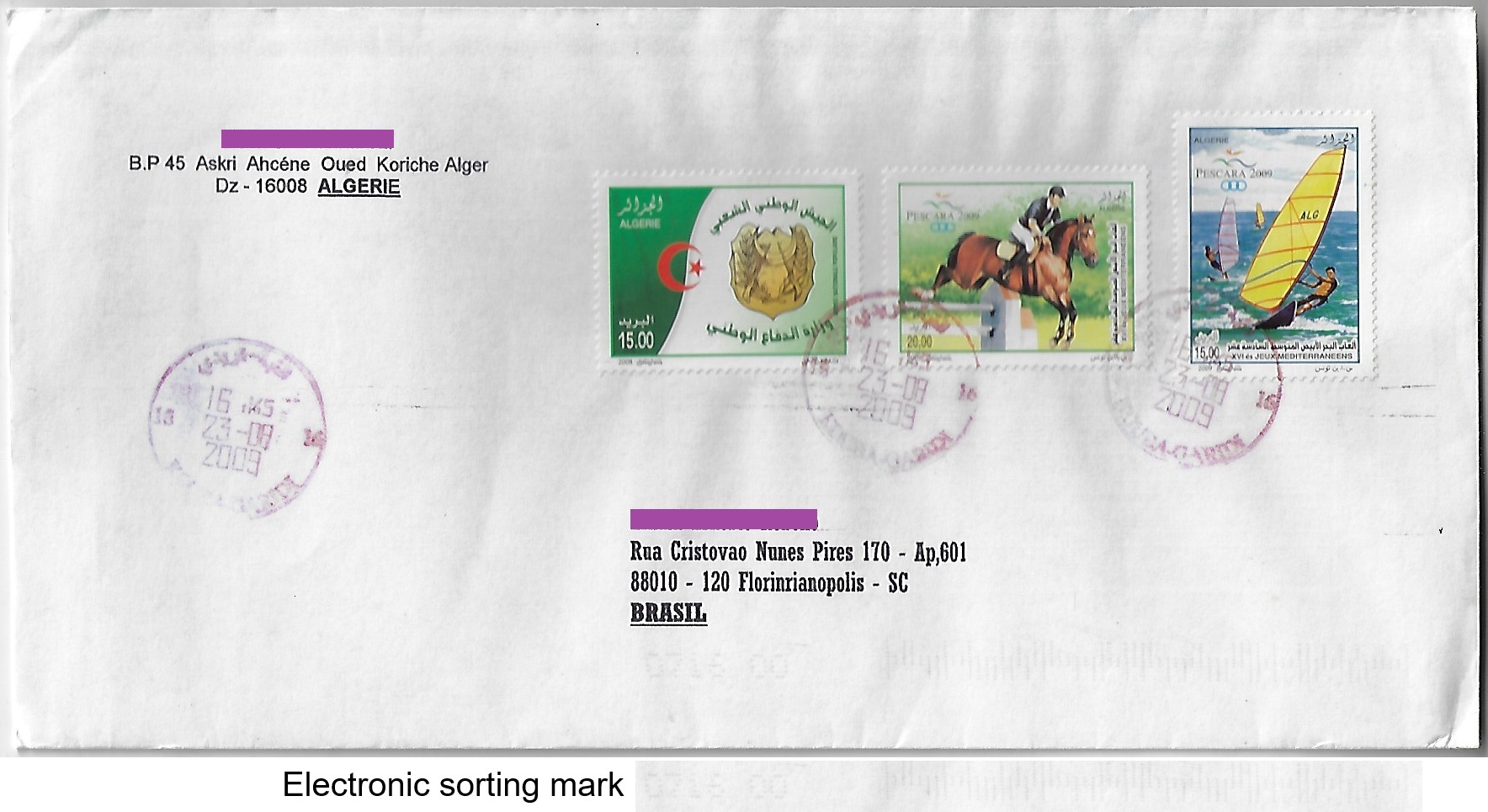 | 43101 | Argélia, 2009, envelope enviado de Oued Koriche (23/8) para Florianópolis, porteado com selos Exército Popular Nacional e série completa 16º Jogos Mediterrâneos Pescara, marca de triagem eletrônica | 10,00 | Foto |