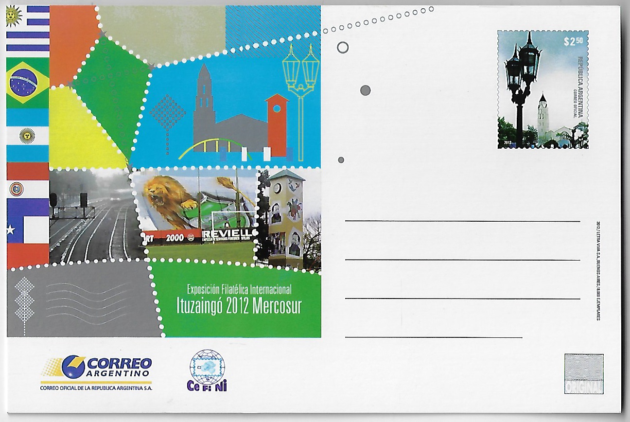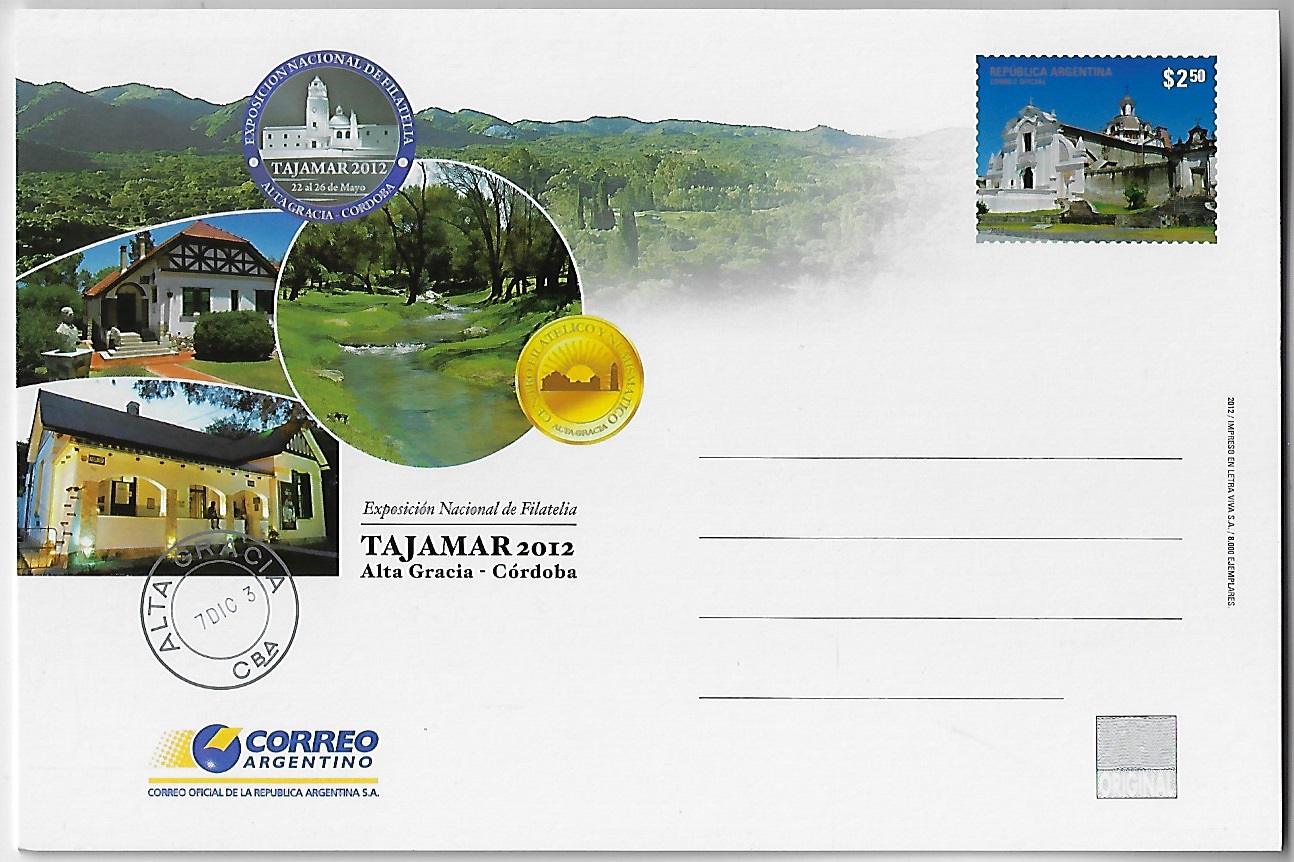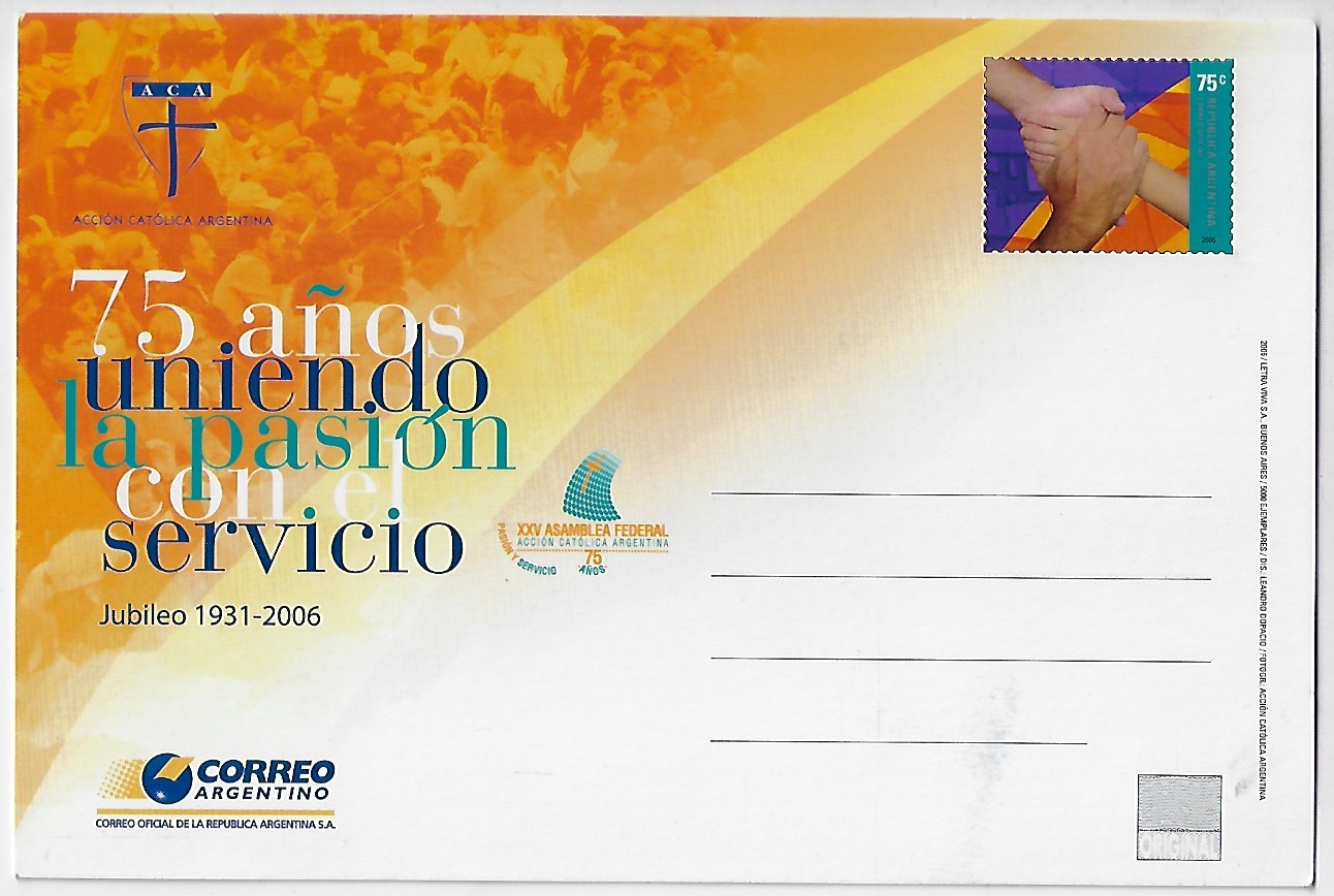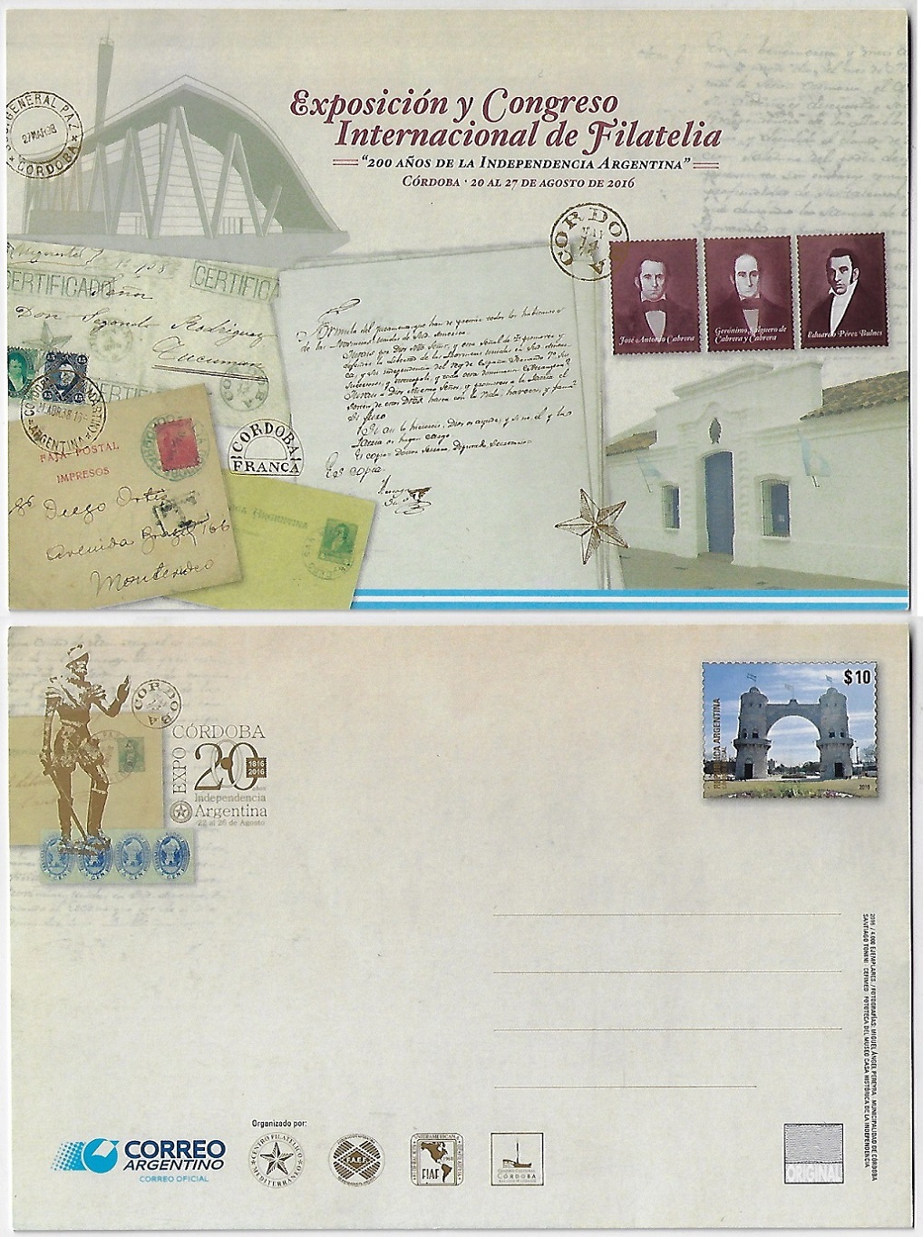 | 79654 | Argentina, 1949, inteiro postal tipo bilhete Exposição Correio e Telecomunicações no Plano Quinquenal, Vagões Postais, selo 4 Centavos, carimbo de 1º dia de circulação + etiqueta Padre Damián, santo apóstolo dos leprosos | 14,00 | Foto |
