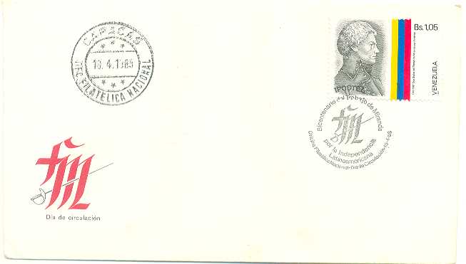 | 44154 | Venezuela, 1985, envelope com carimbo de 1º dia com 1 selo "Bicentenário dos Trabalhos de Miranda por la Independência Latinoamericana", sem uso | 3,00 | Foto |