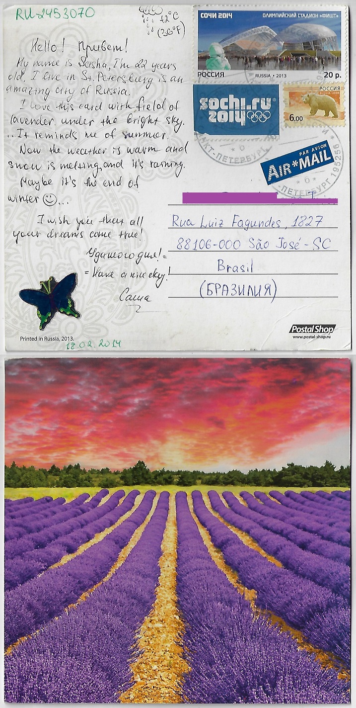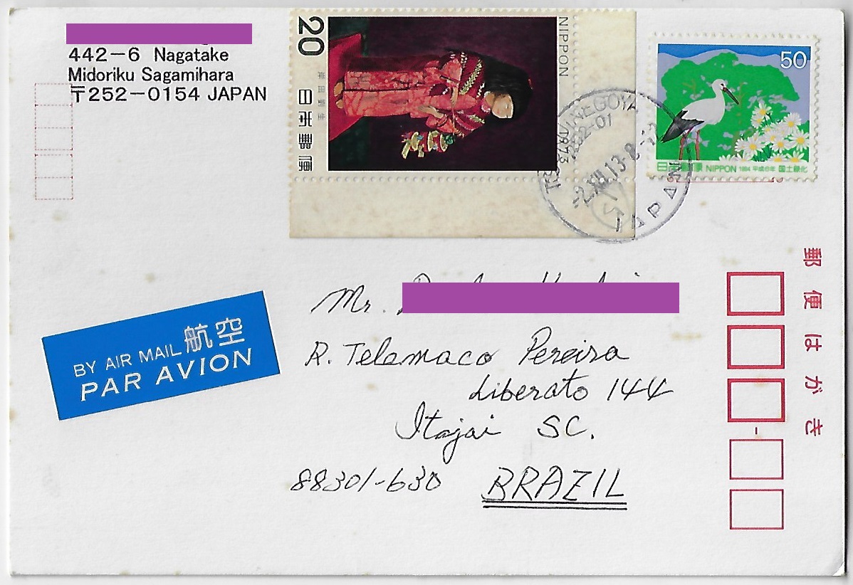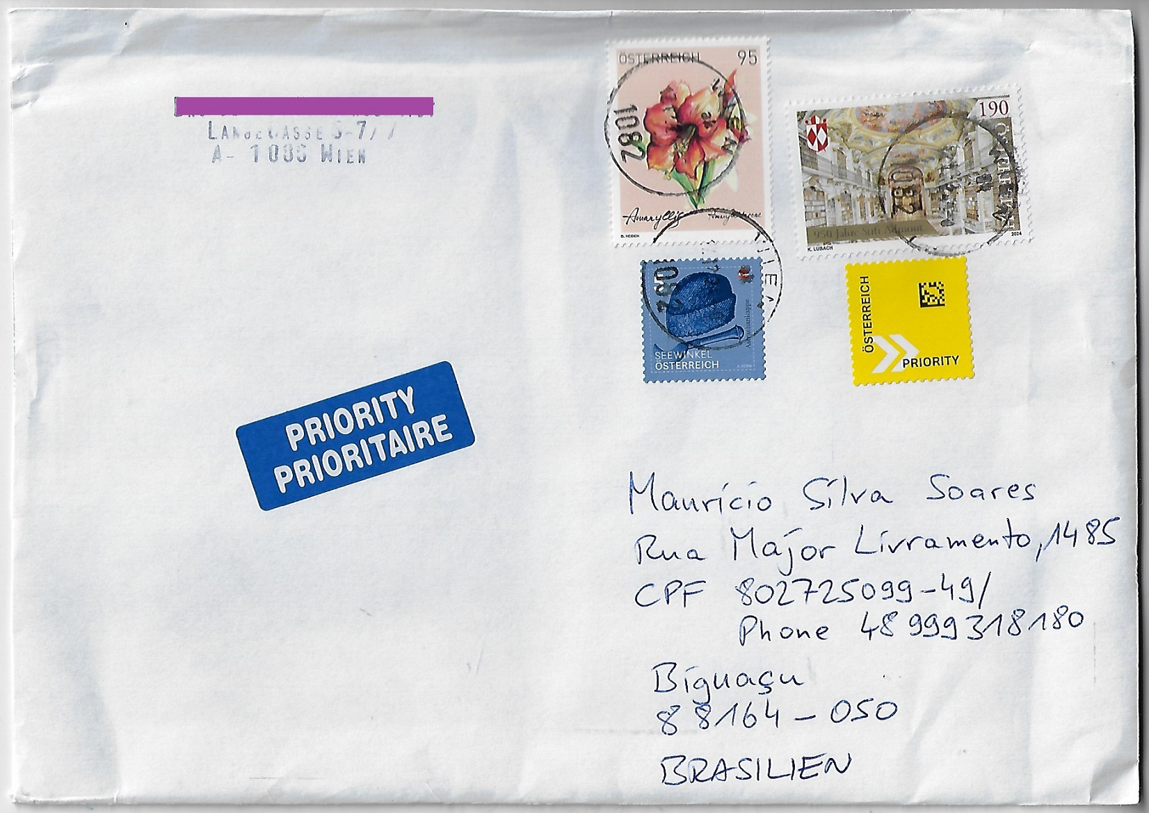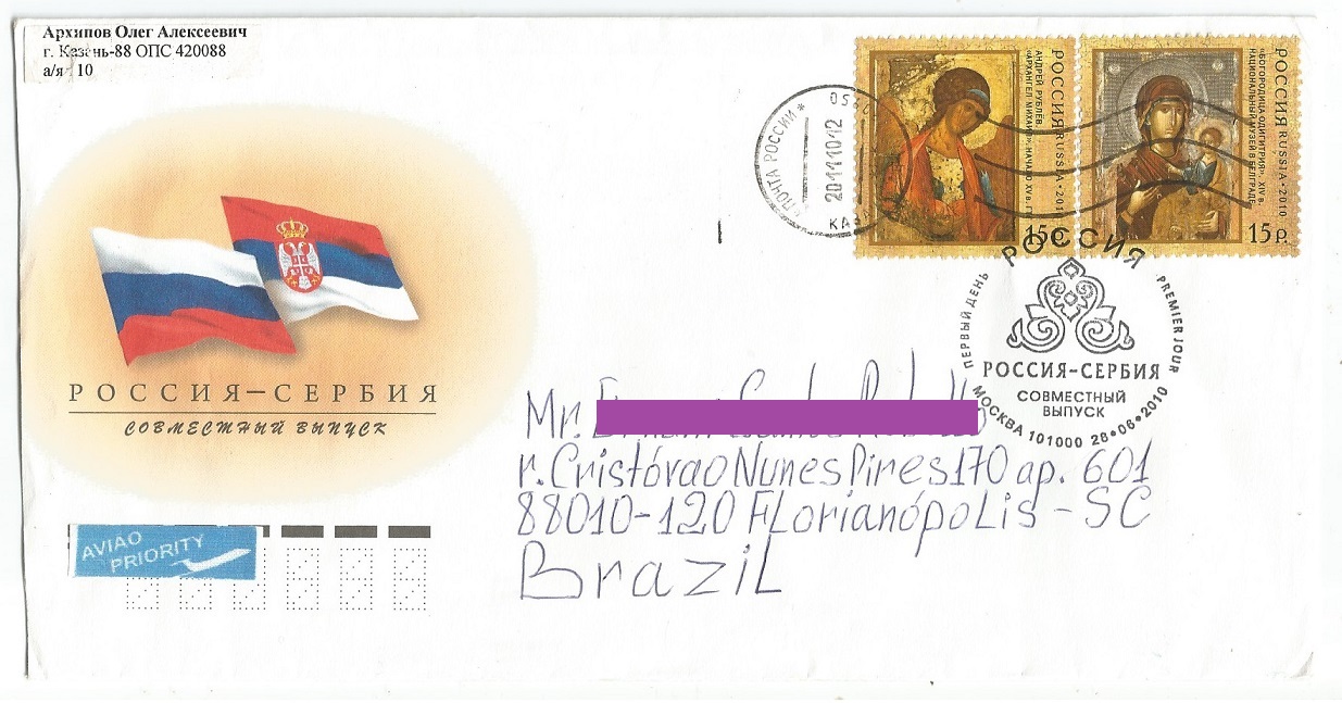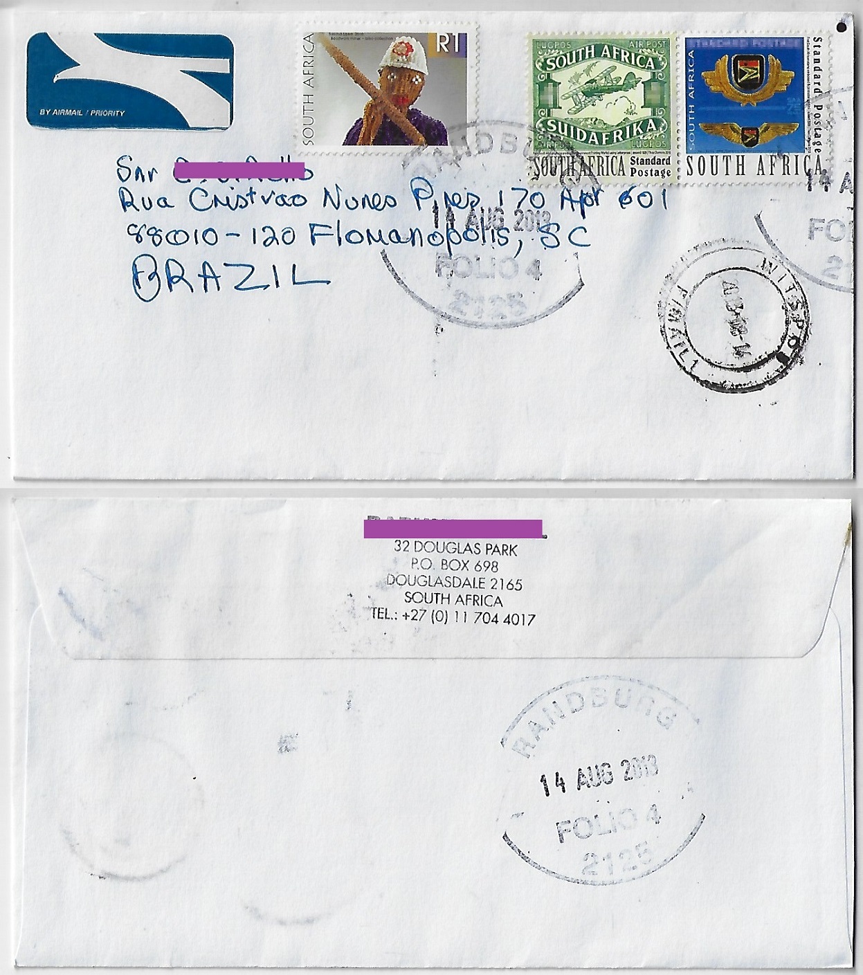 | 80626 | África do Sul, 2014, envelope prioritário de Randburg (14/8) para Florianópolis, passagem por Witspos (14/8) porteado com 3 selos | 10,00 | Foto |