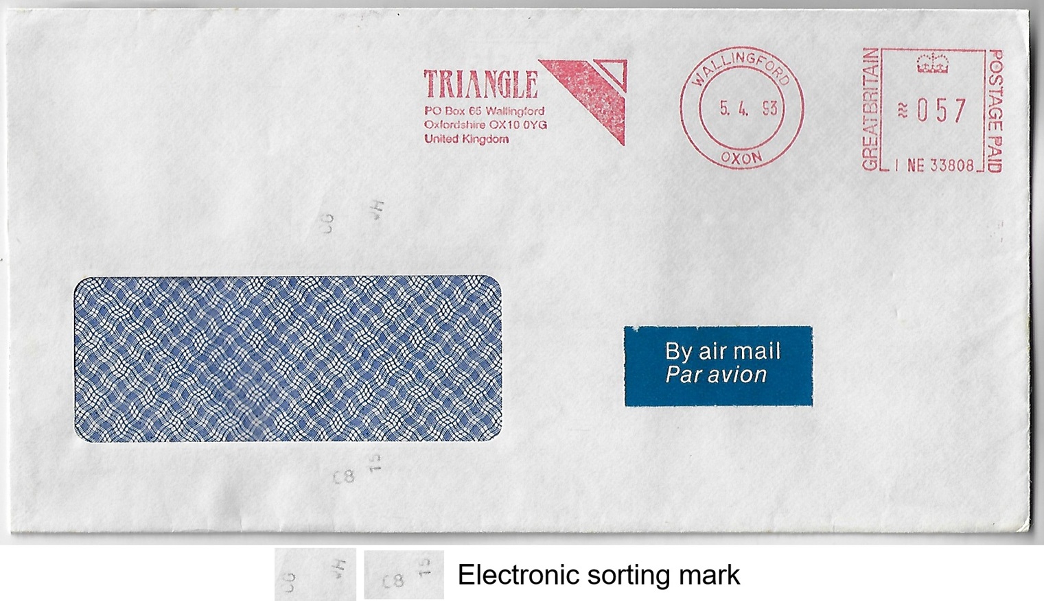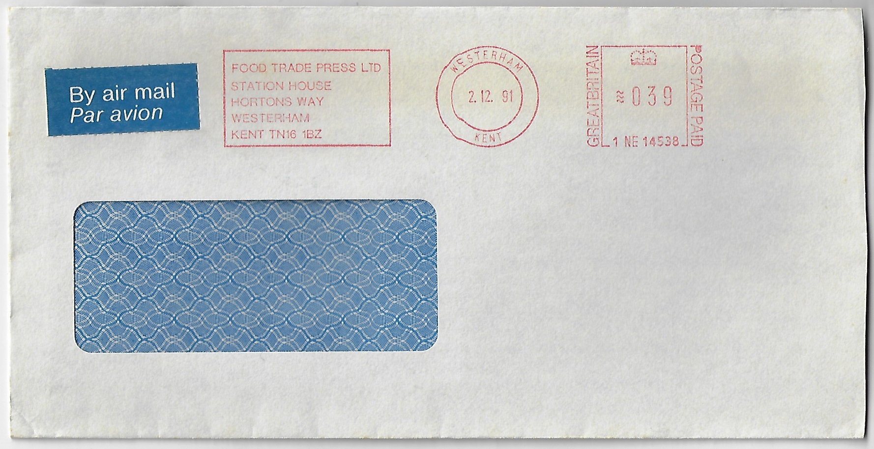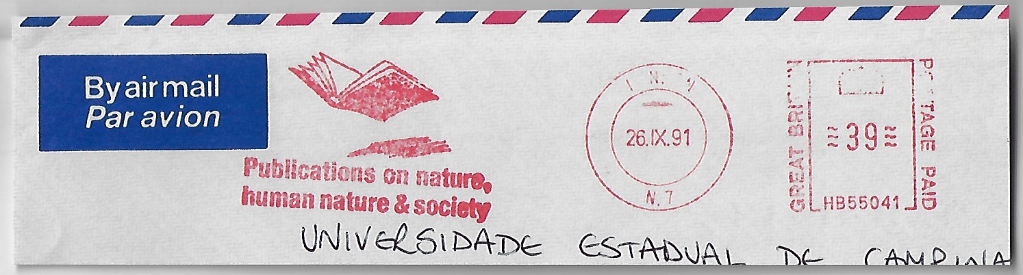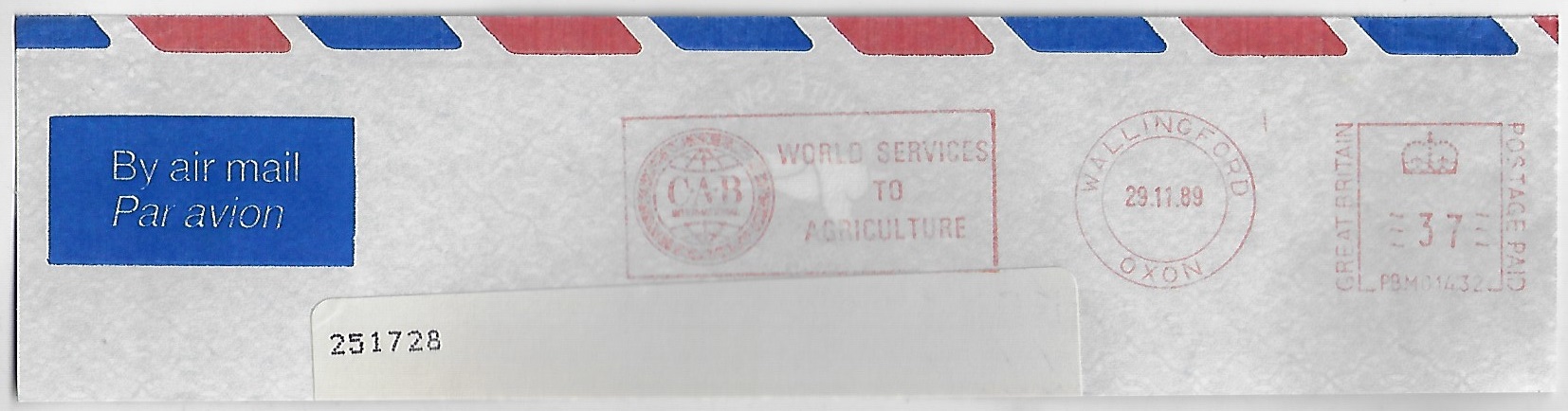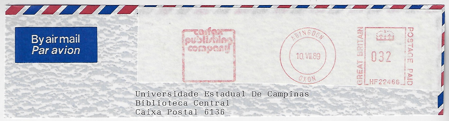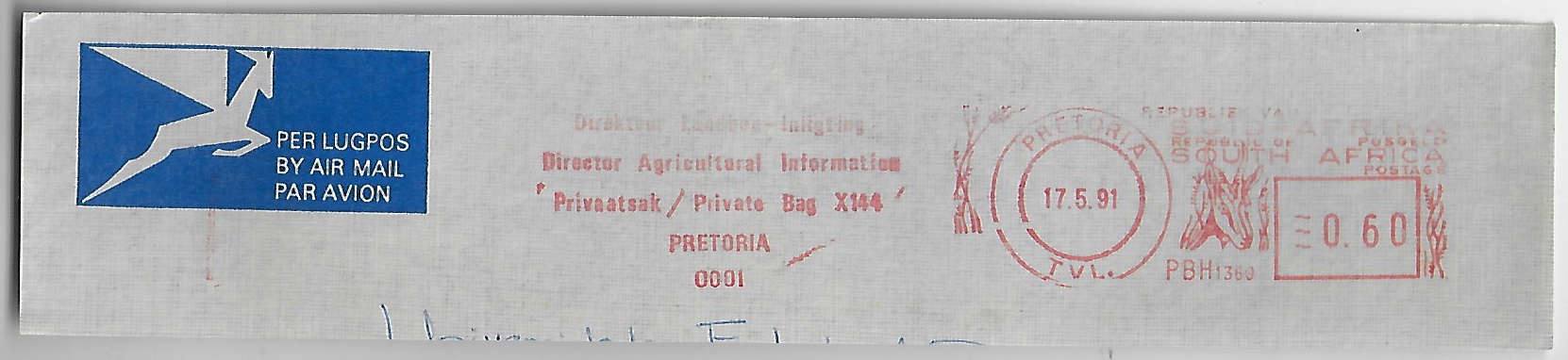 | 76309 | África do Sul, 1991, fragmento de envelope aéreo porteado com franquia mecânica Pitney Bowes-GB “5000” com slogan "Diretor de informações agrícolas", de Pretoria | 10,00 | Foto |