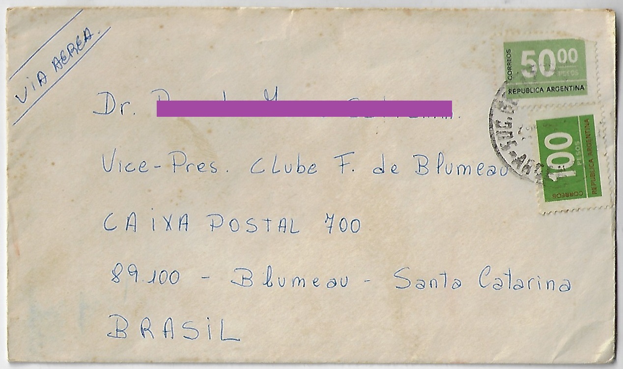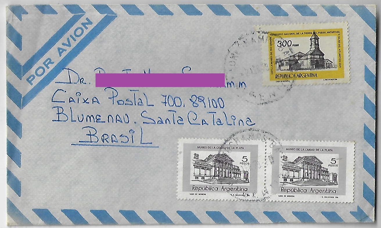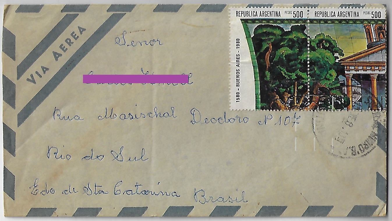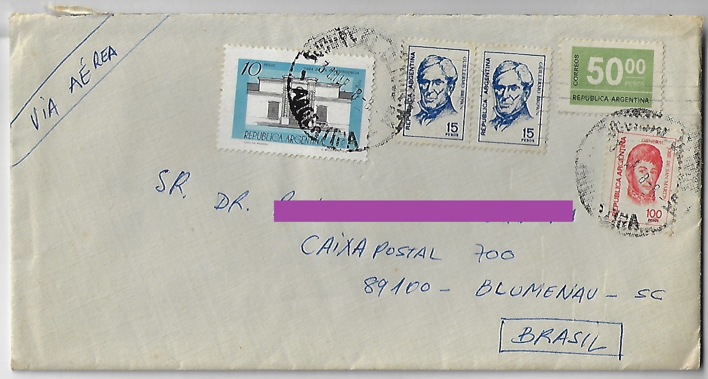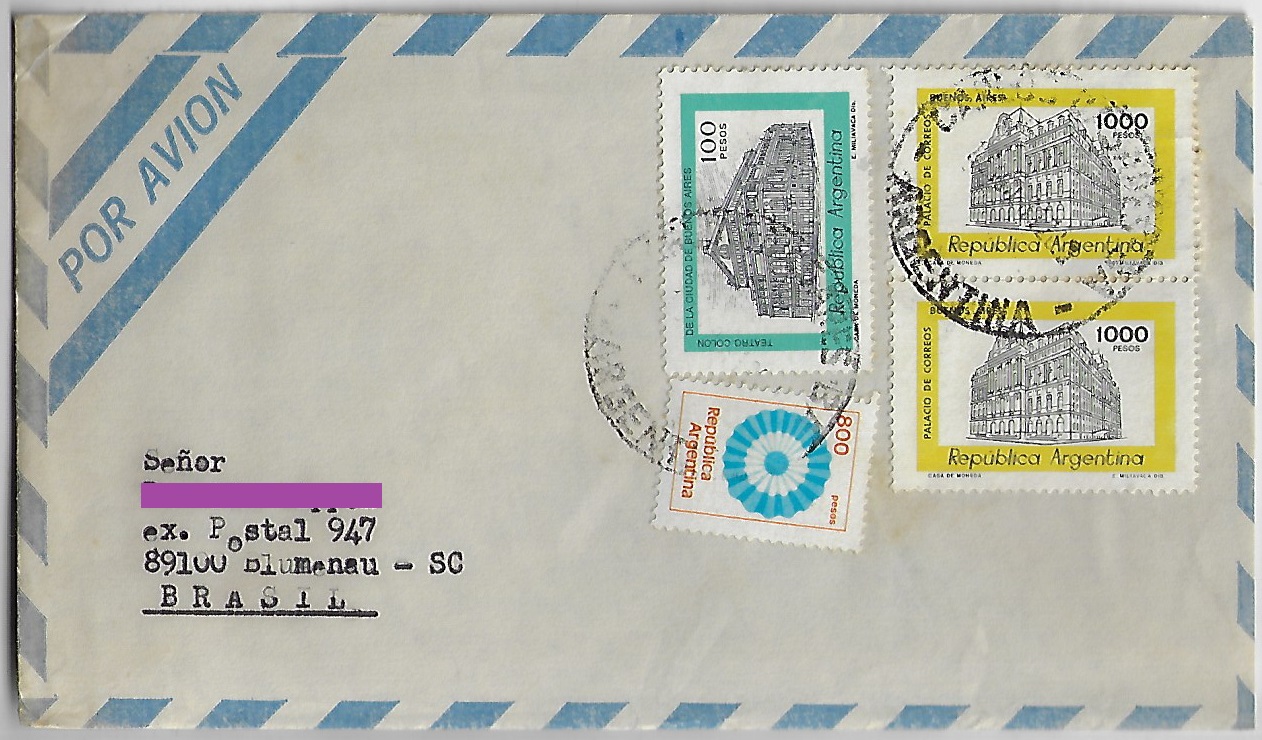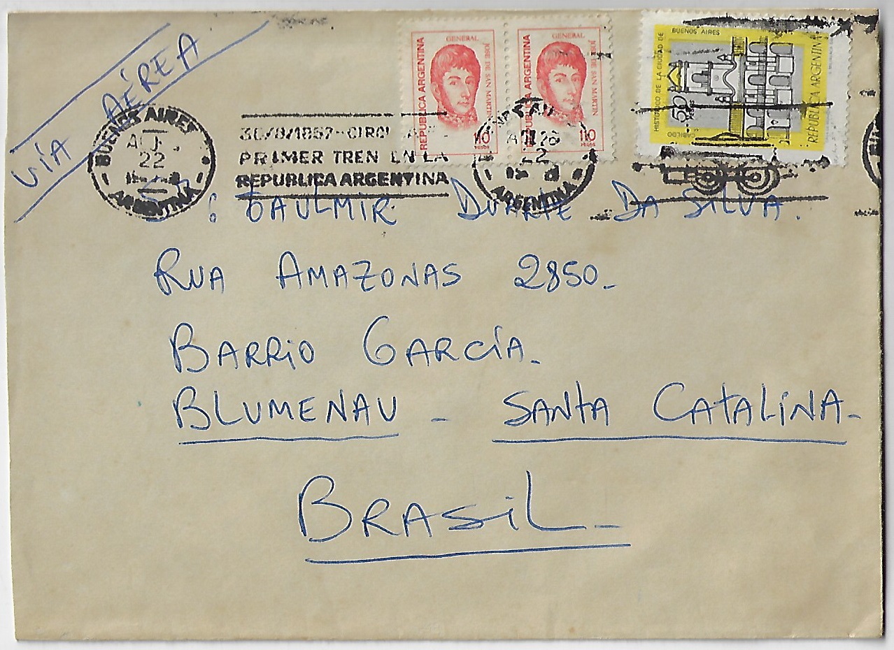 | 80645 | Argentina, 1970s, envelope aéreo de Buenos Aires para Blumenau porteado com 3 selos obliterados com carimbo rotativo "Primeiro Trem da República Argentina" | 10,00 | Foto |