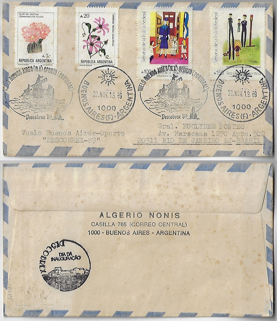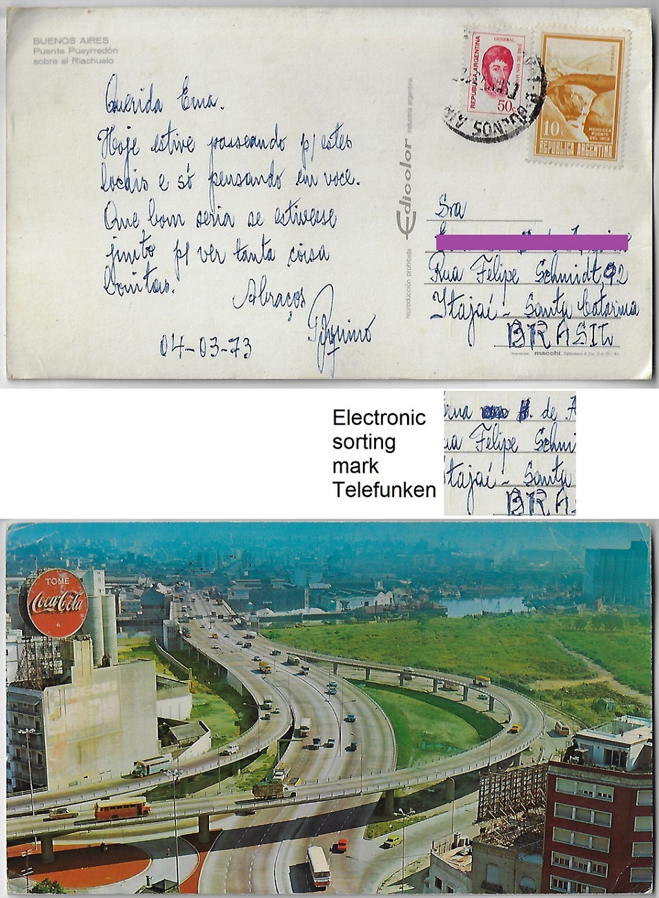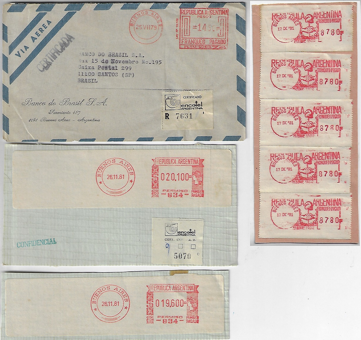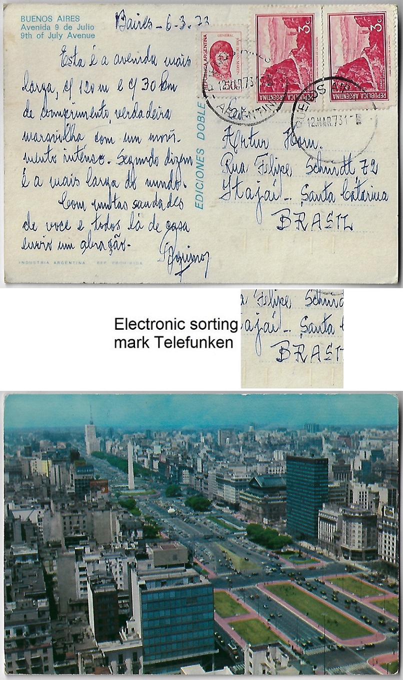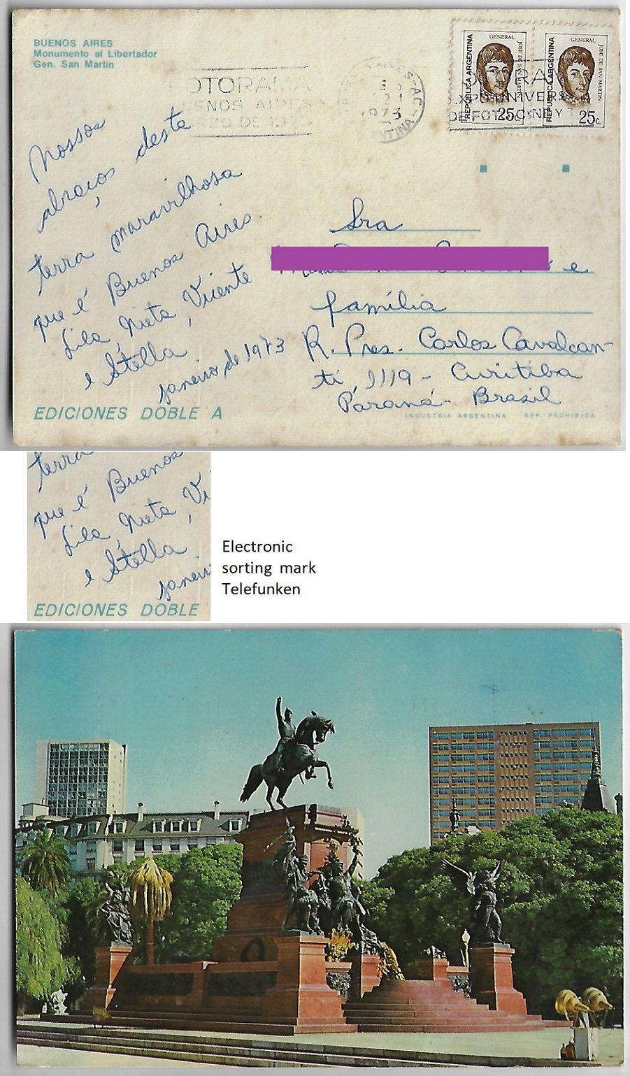 | 80645 | Argentina, 1970s, envelope aéreo de Buenos Aires para Blumenau porteado com 3 selos obliterados com carimbo rotativo "Primeiro Trem da República Argentina" | 10,00 | Foto |