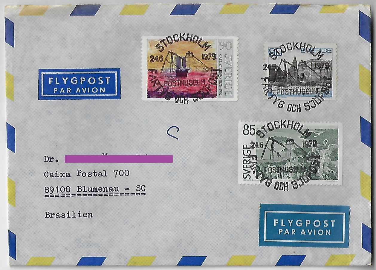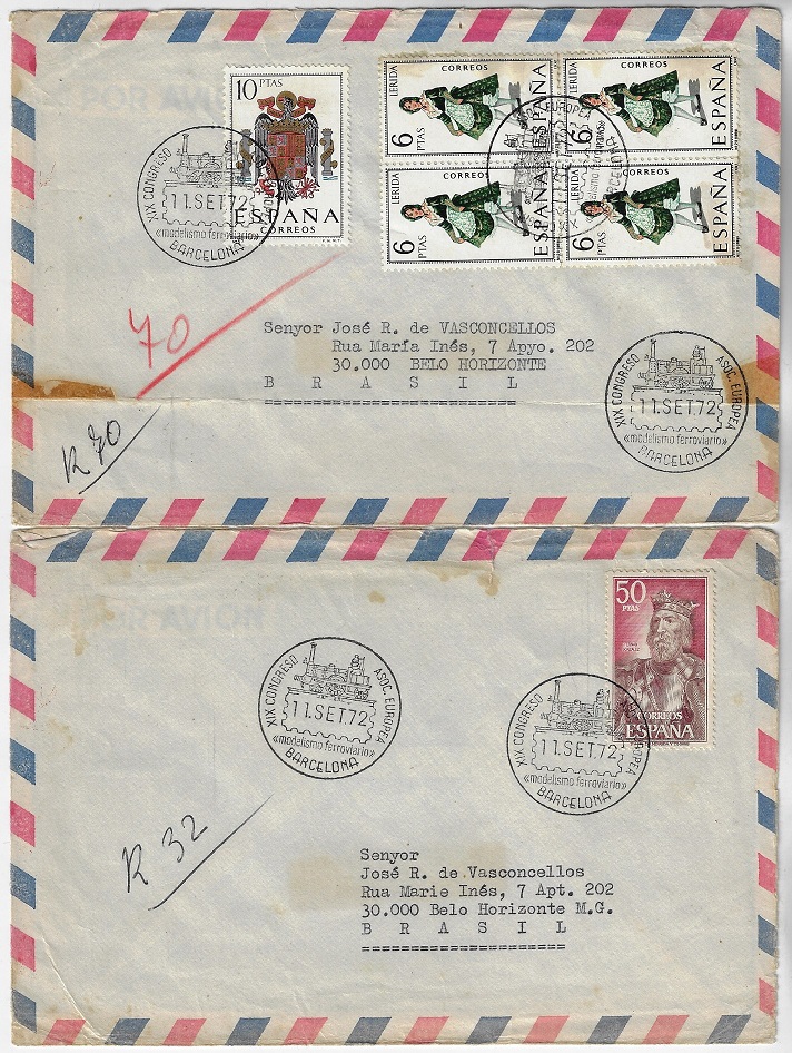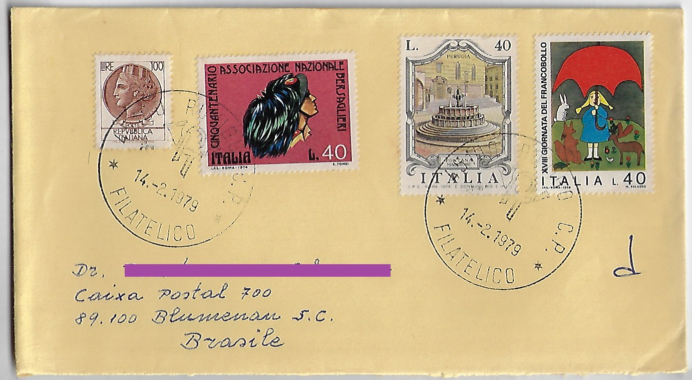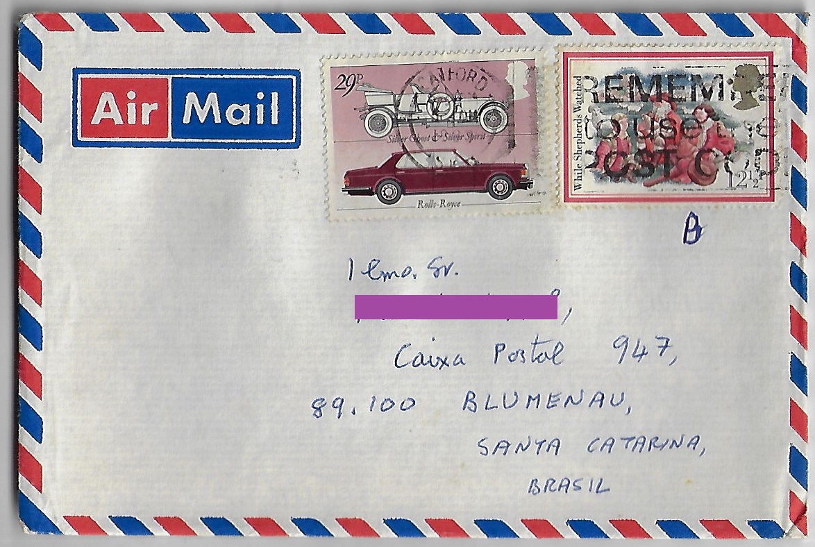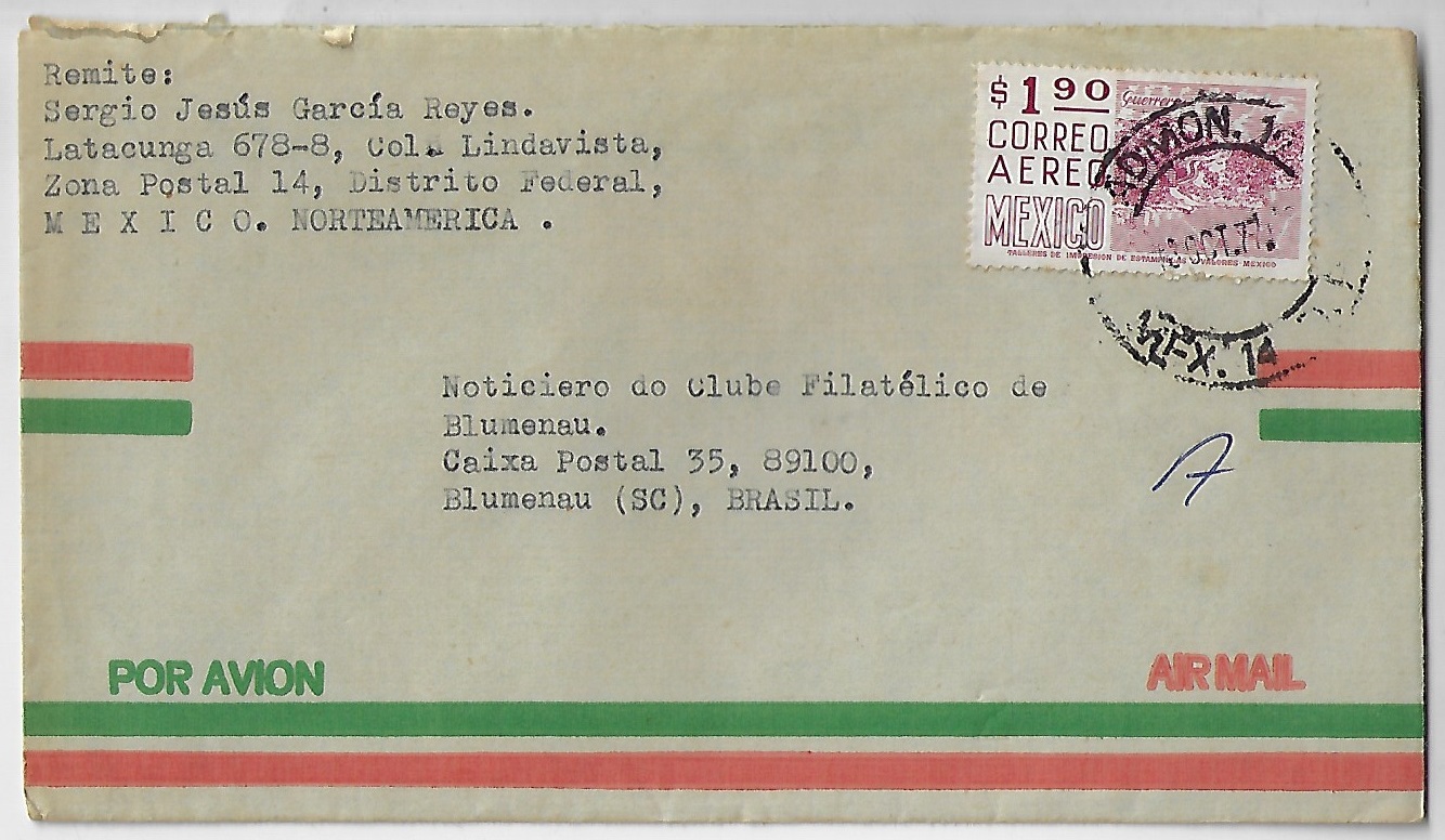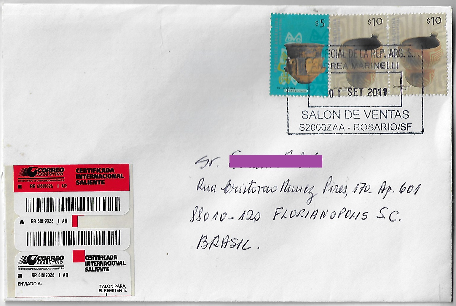 | 80645 | Argentina, 1970s, envelope aéreo de Buenos Aires para Blumenau porteado com 3 selos obliterados com carimbo rotativo "Primeiro Trem da República Argentina" | 10,00 | Foto |