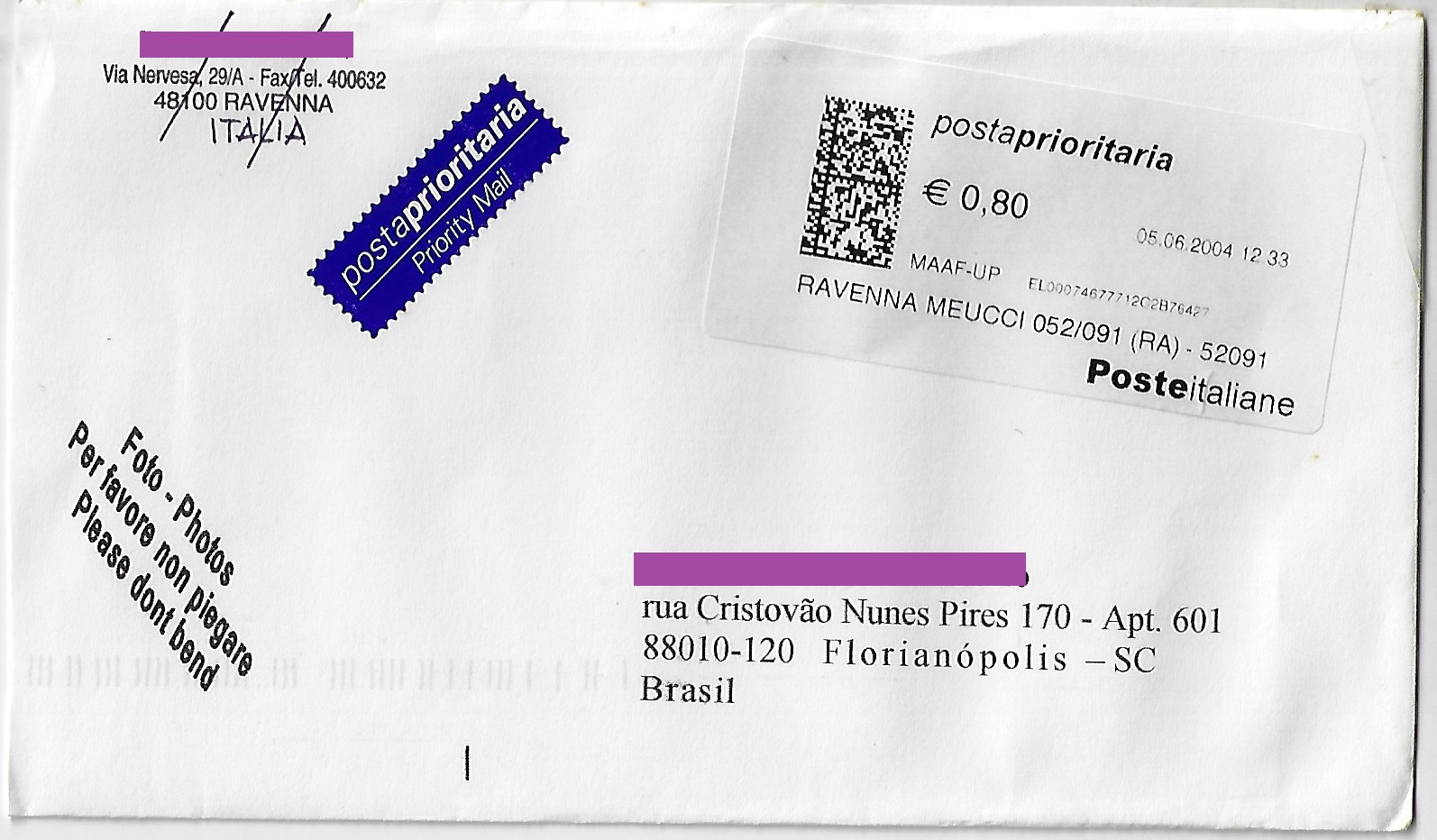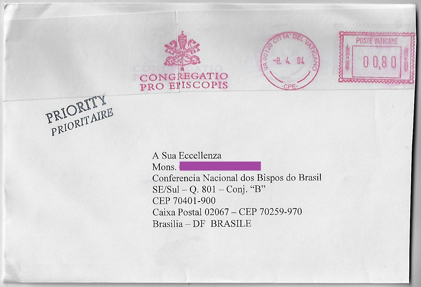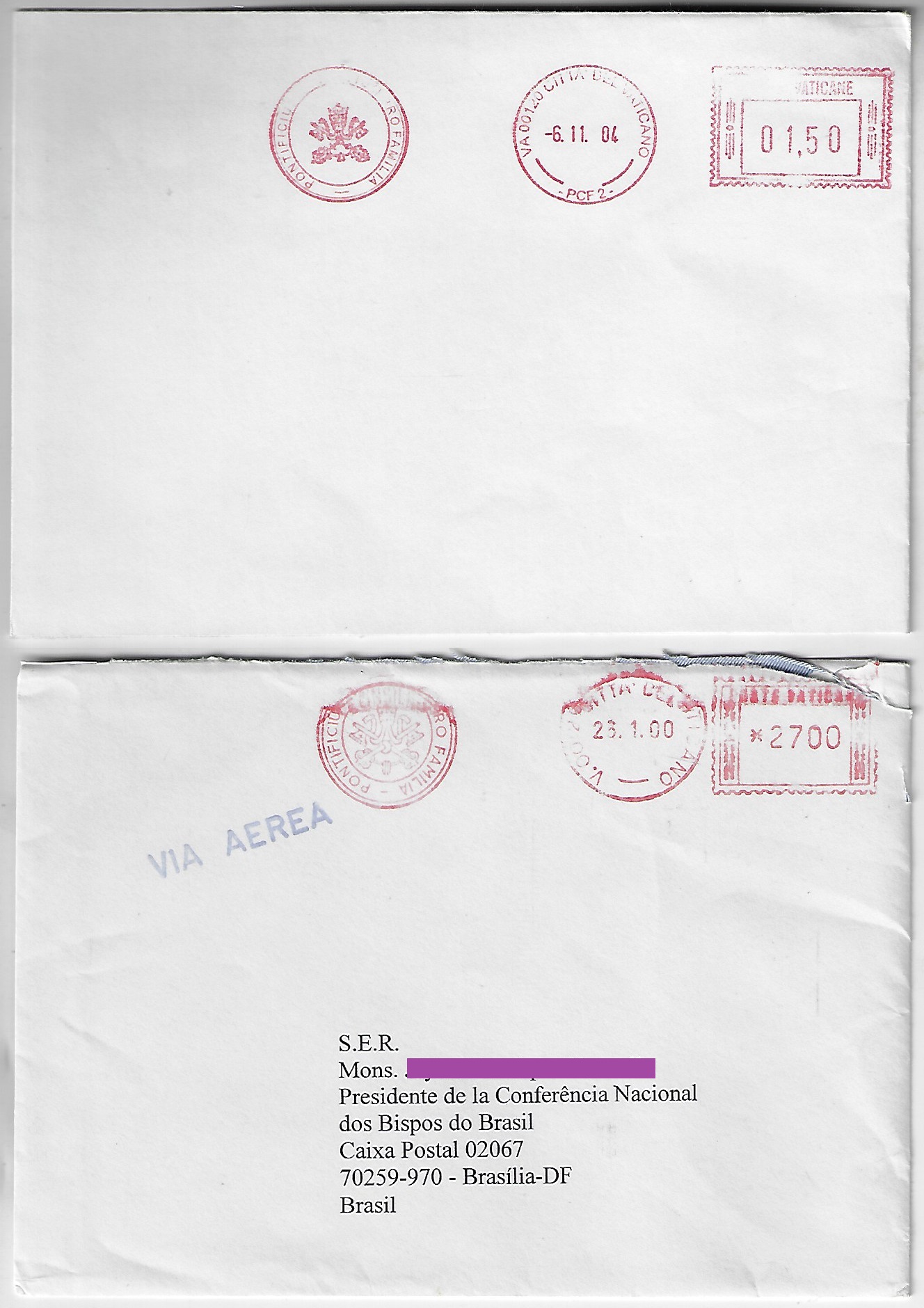 | 65994 | Vaticano, 2004, envelope prioritário enviado para Brasília, porteado com franquia mecânica Neopost “Electronic” com slogan "Congregatio Pro Episcopis" (Congregação para os Bispos) | 10,00 | Foto |