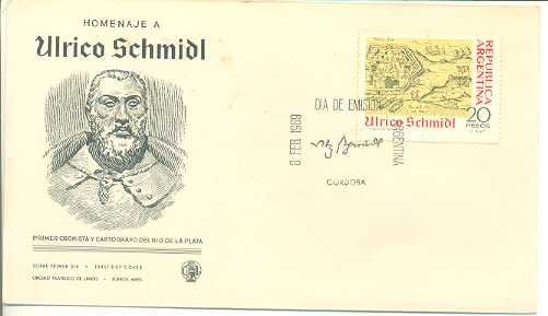| 46959 | Argentina, 1969, envelope com carimbo de 1º dia alusivo a Ulrico Schmidt | 3,00 | Foto |