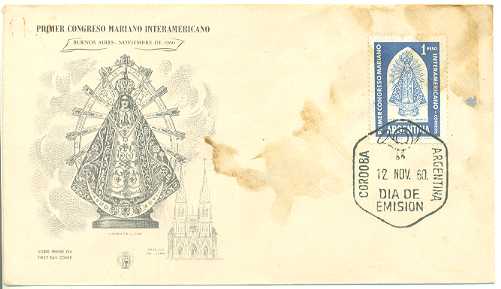 | 46965 | Argentina, 1960, envelope com carimbo de 1º dia alusivo ao 1º Congresso Mariano Interamericano, mancha | 3,00 | Foto |