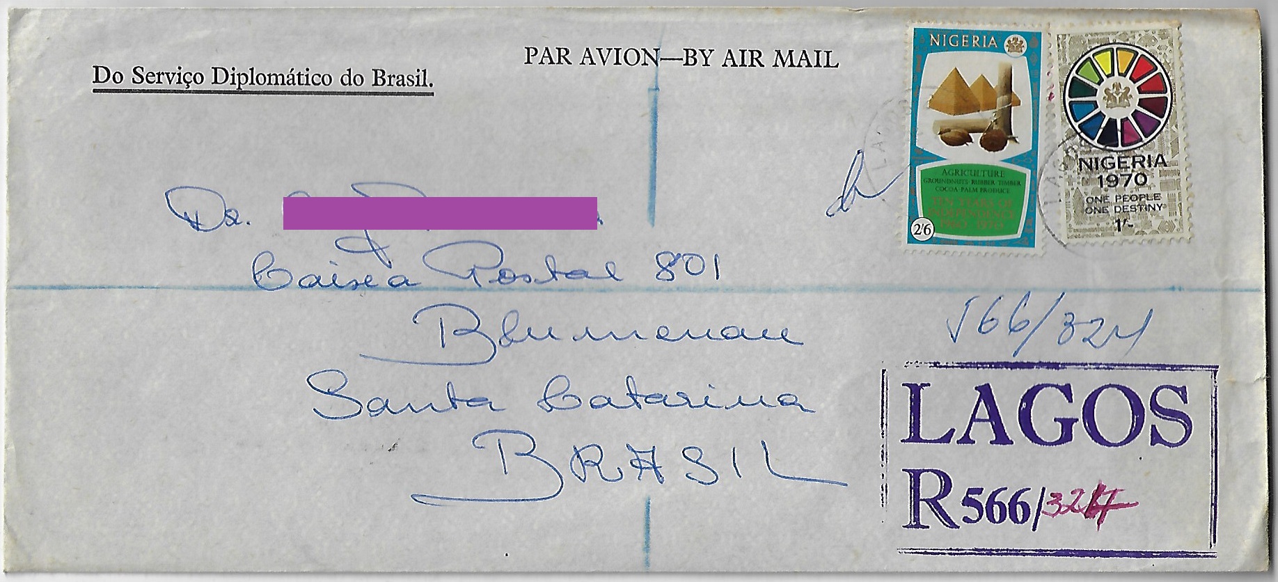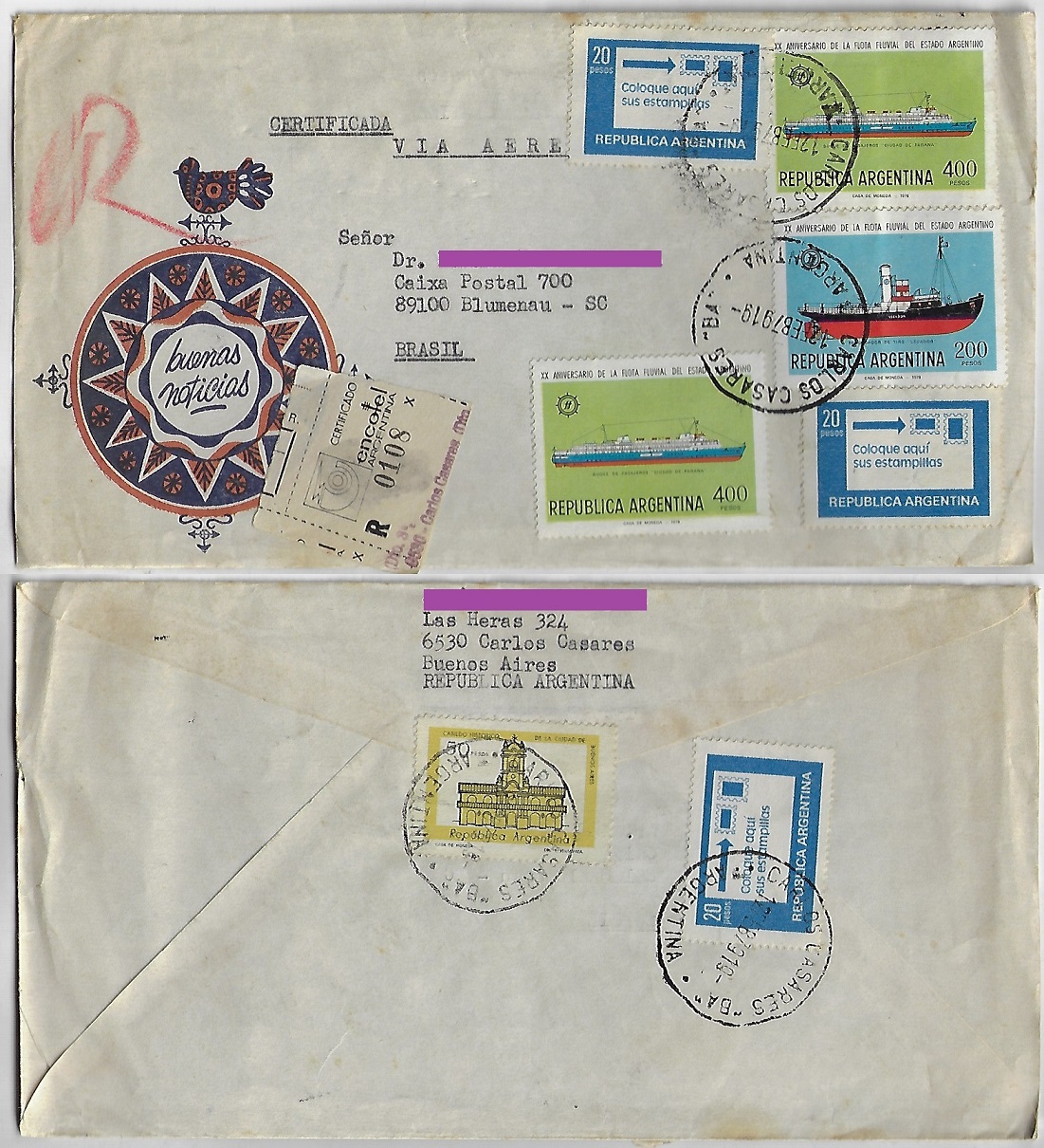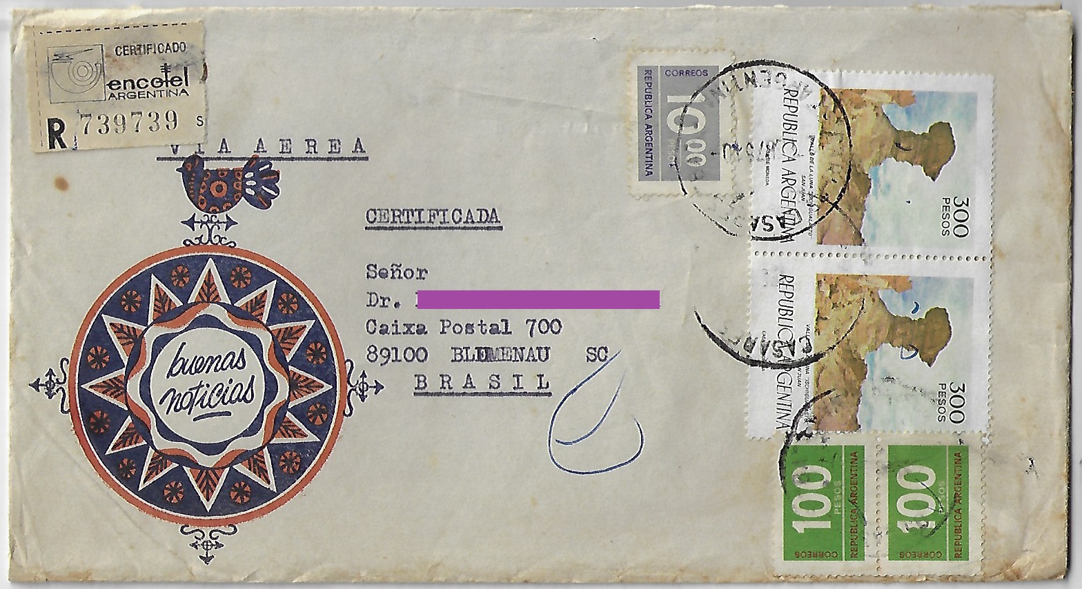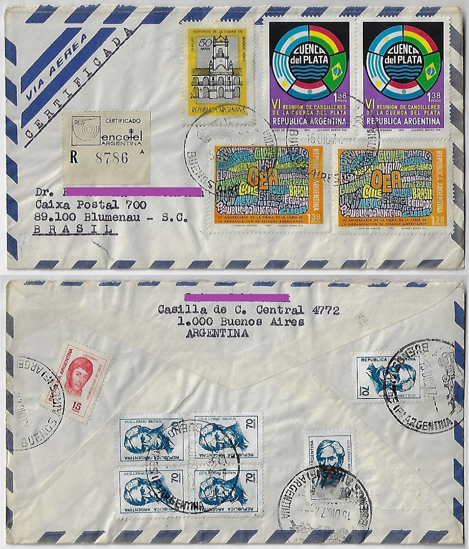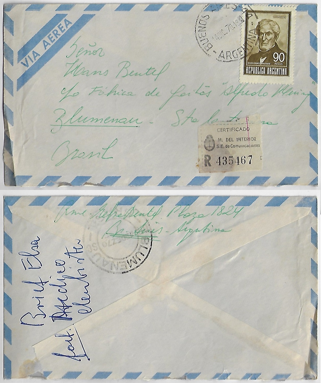 | 80773 | Argentina, 1970, envelope aéreo registrado enviado de Buenos Aires (4/12) para Blumenau (19/12), porteado com selo Guillermo Brown | 10,00 | Foto |