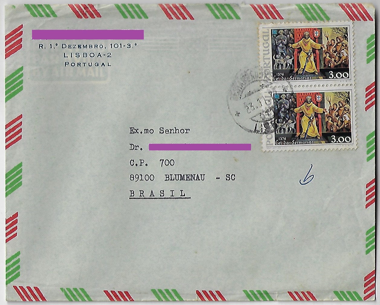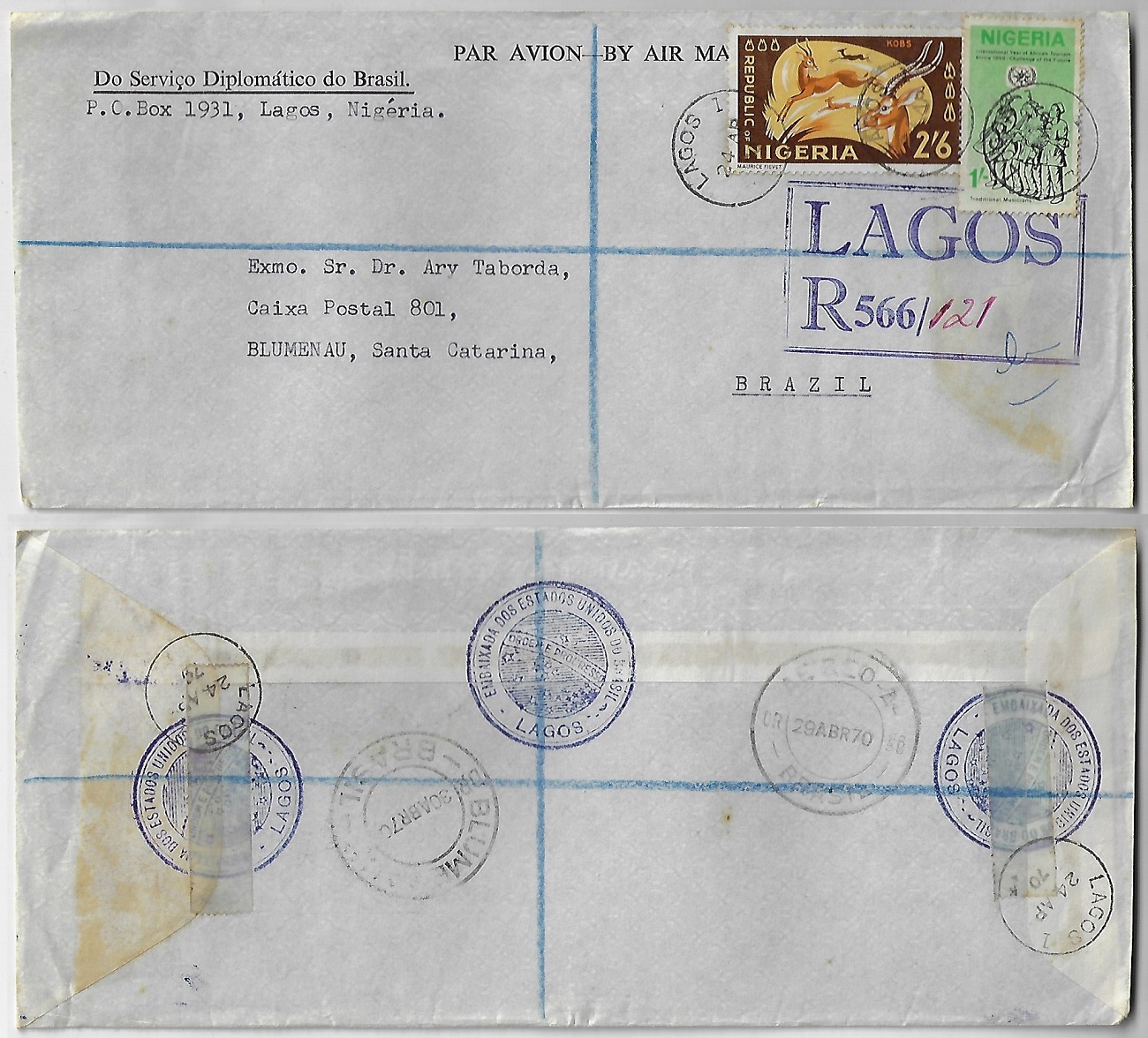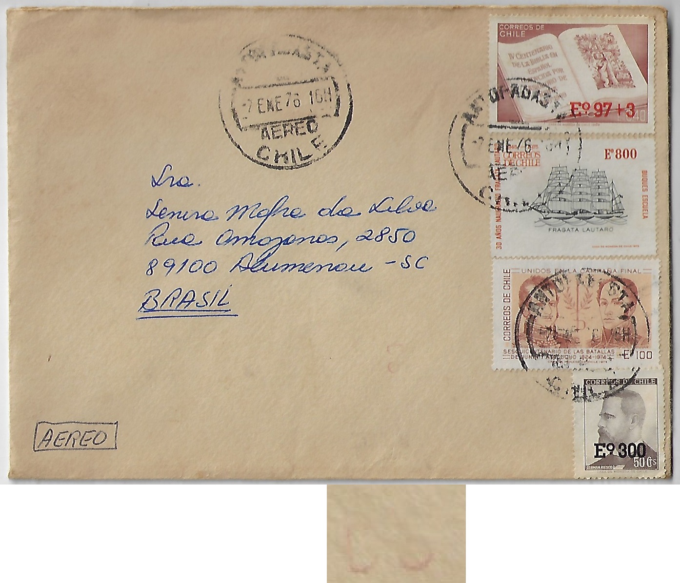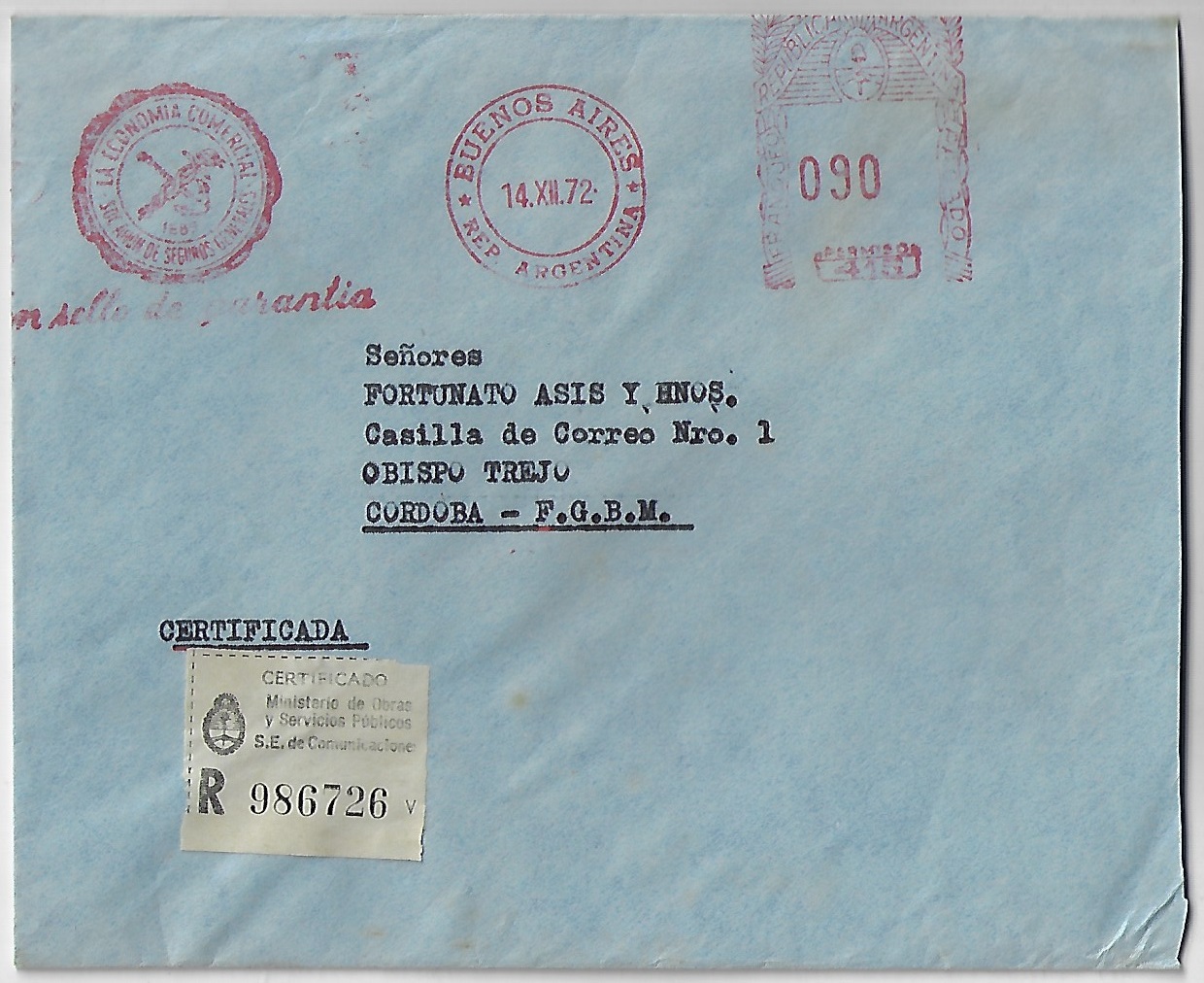| 80773 | Argentina, 1970, envelope aéreo registrado enviado de Buenos Aires (4/12) para Blumenau (19/12), porteado com selo Guillermo Brown | 10,00 | Foto |