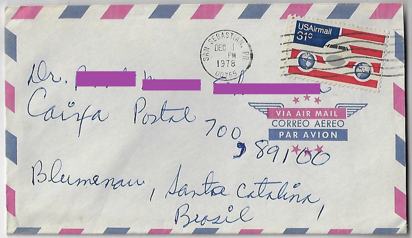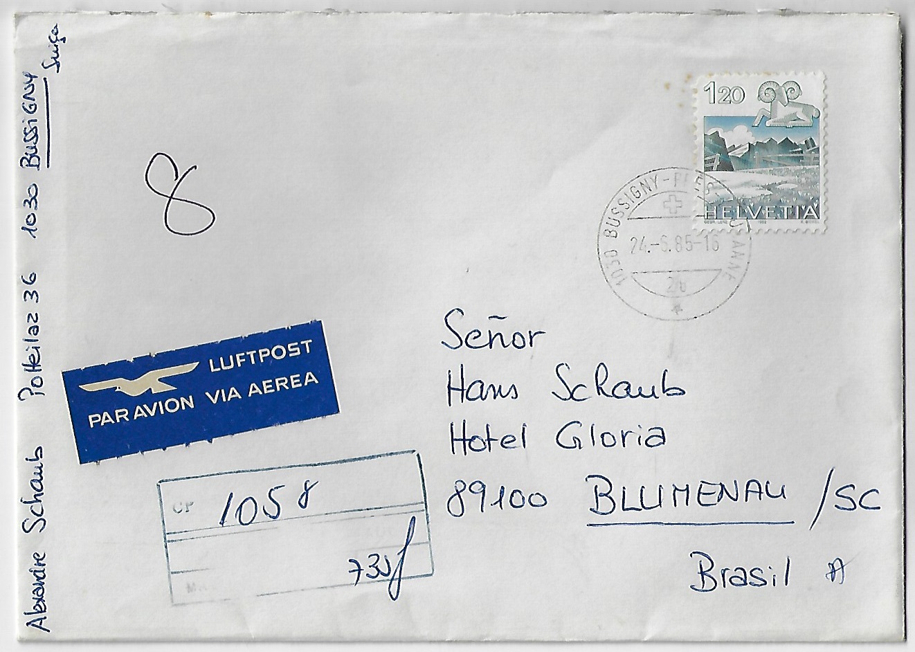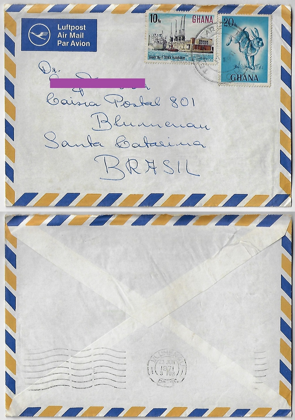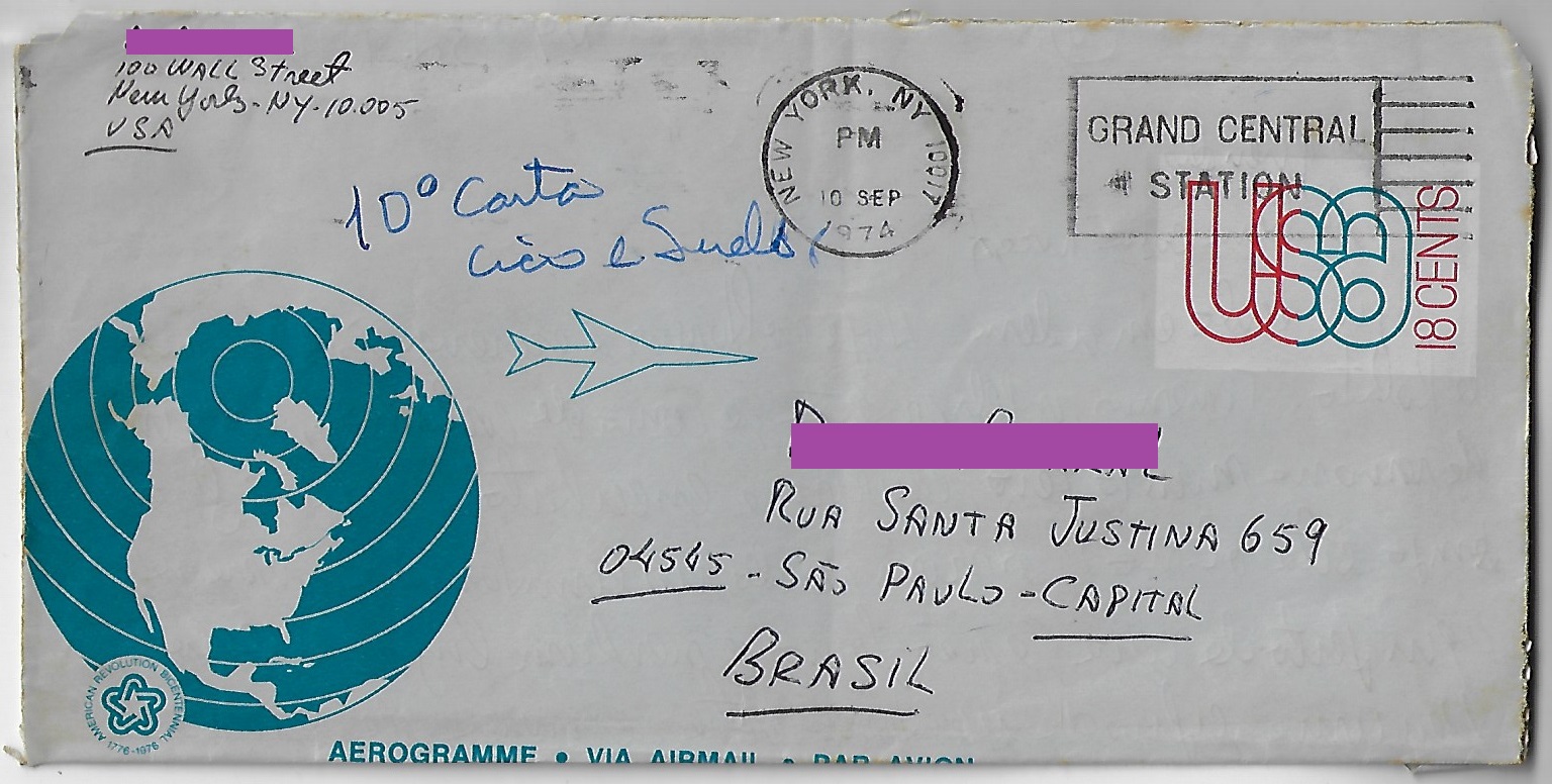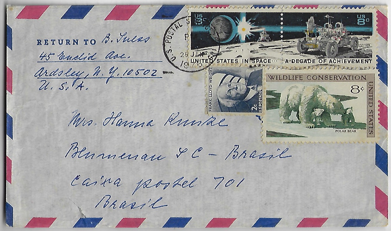 | 80773 | Argentina, 1970, envelope aéreo registrado enviado de Buenos Aires (4/12) para Blumenau (19/12), porteado com selo Guillermo Brown | 10,00 | Foto |