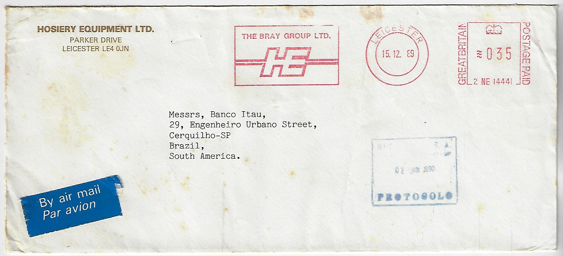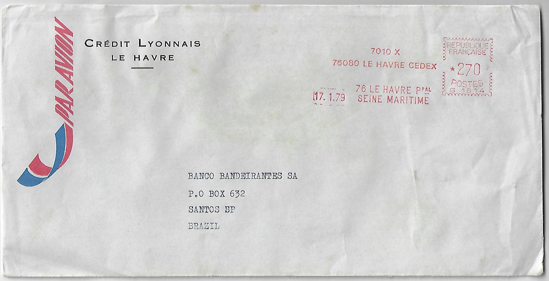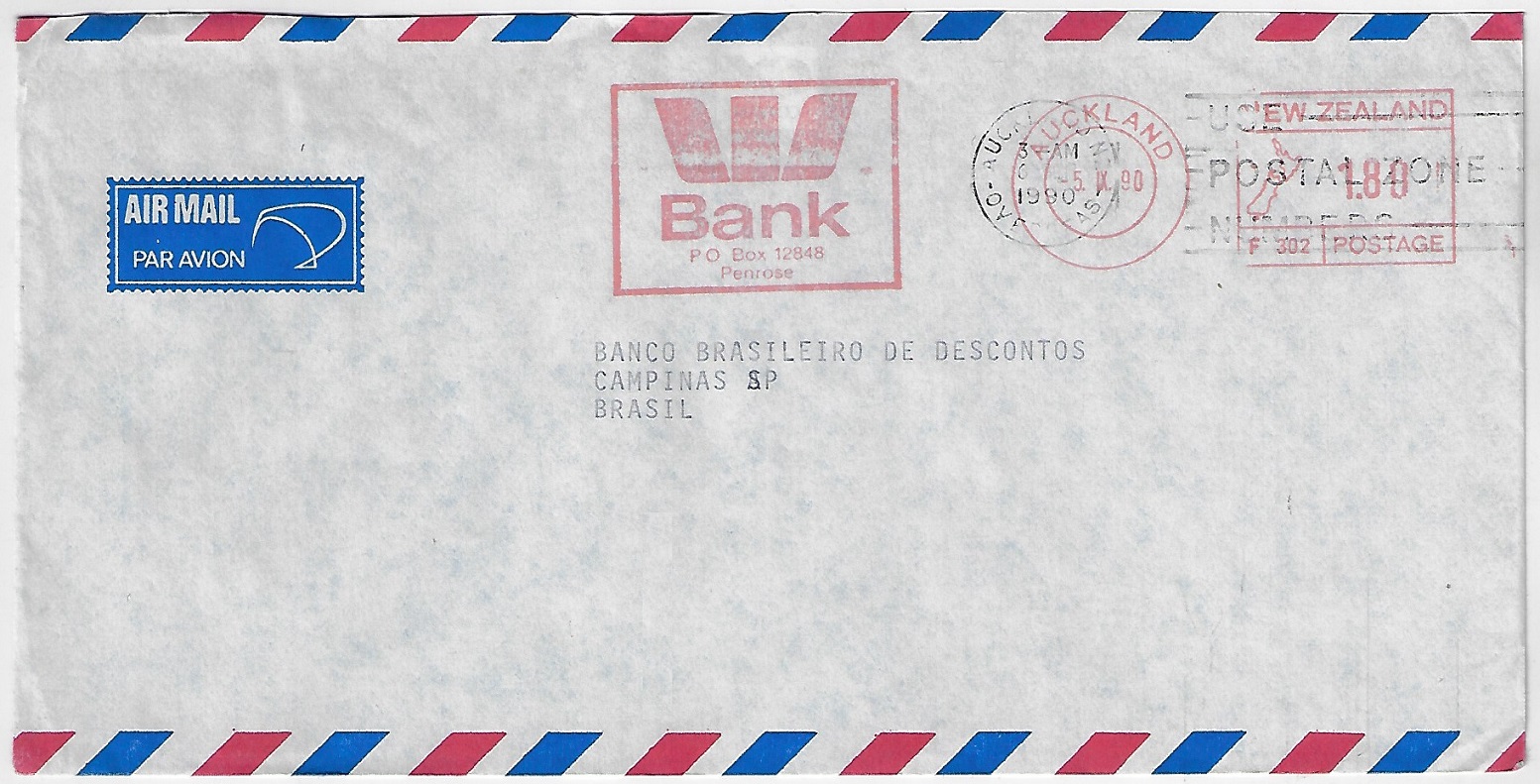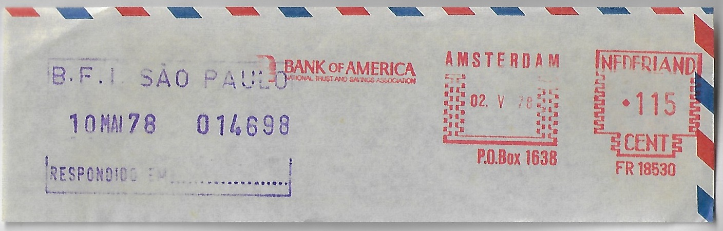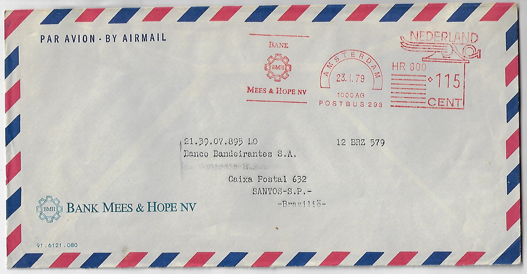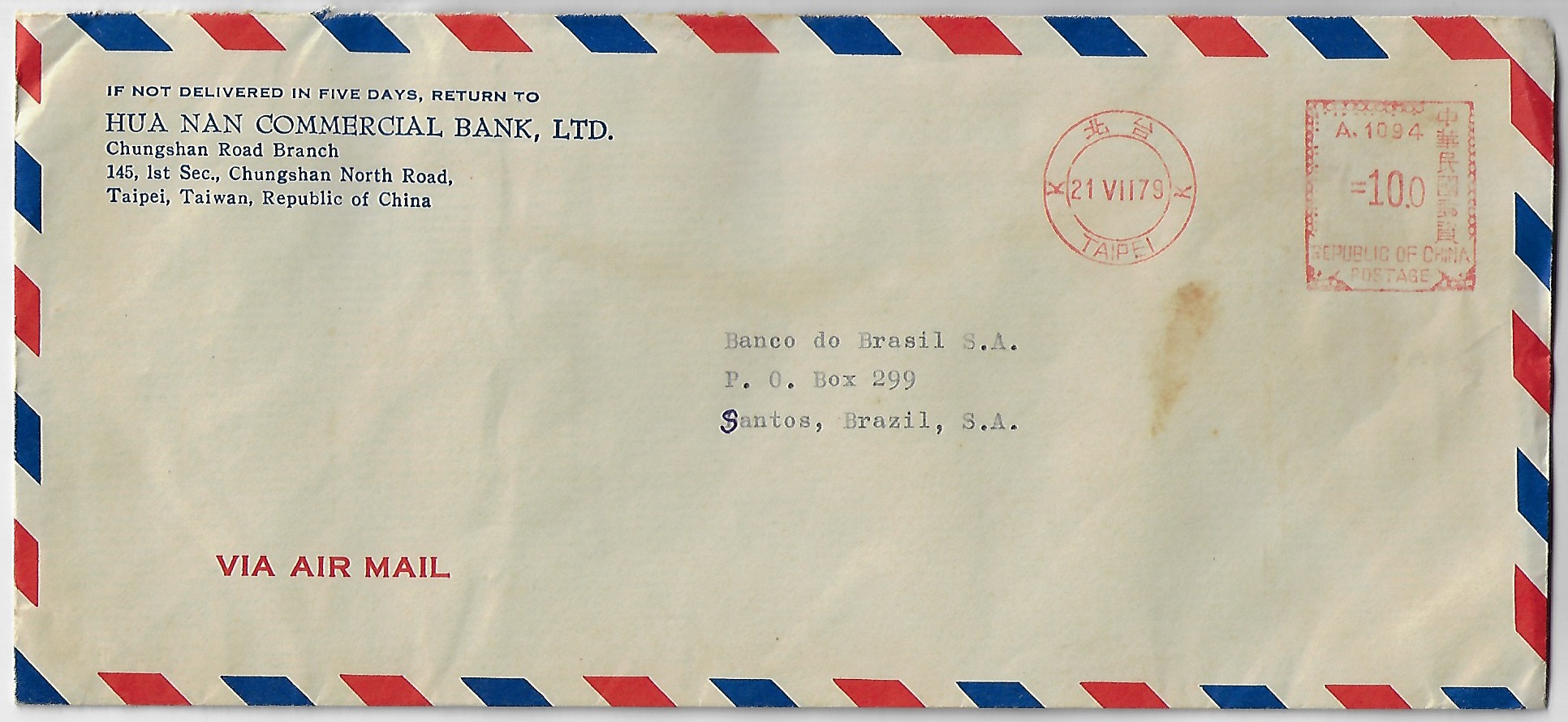 | 79678 | África do Sul, 1979, envelope aéreo enviado de Eppingust (13/7) para São Paulo, porteado com franquia mecânica Roneo Neopost "205/2205" com slogan Barclays National Bank Ltd | 10,00 | Foto |