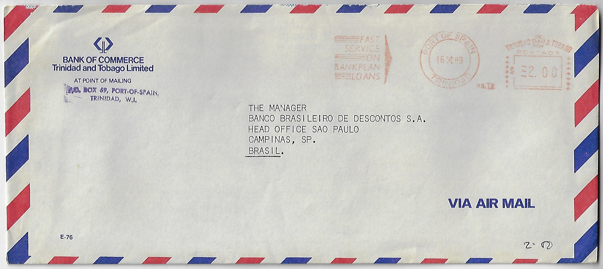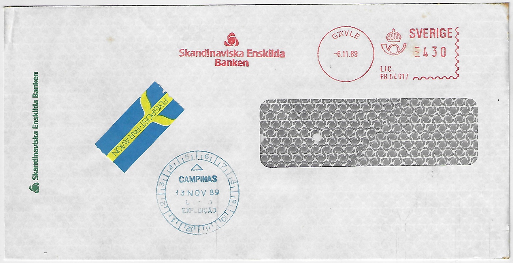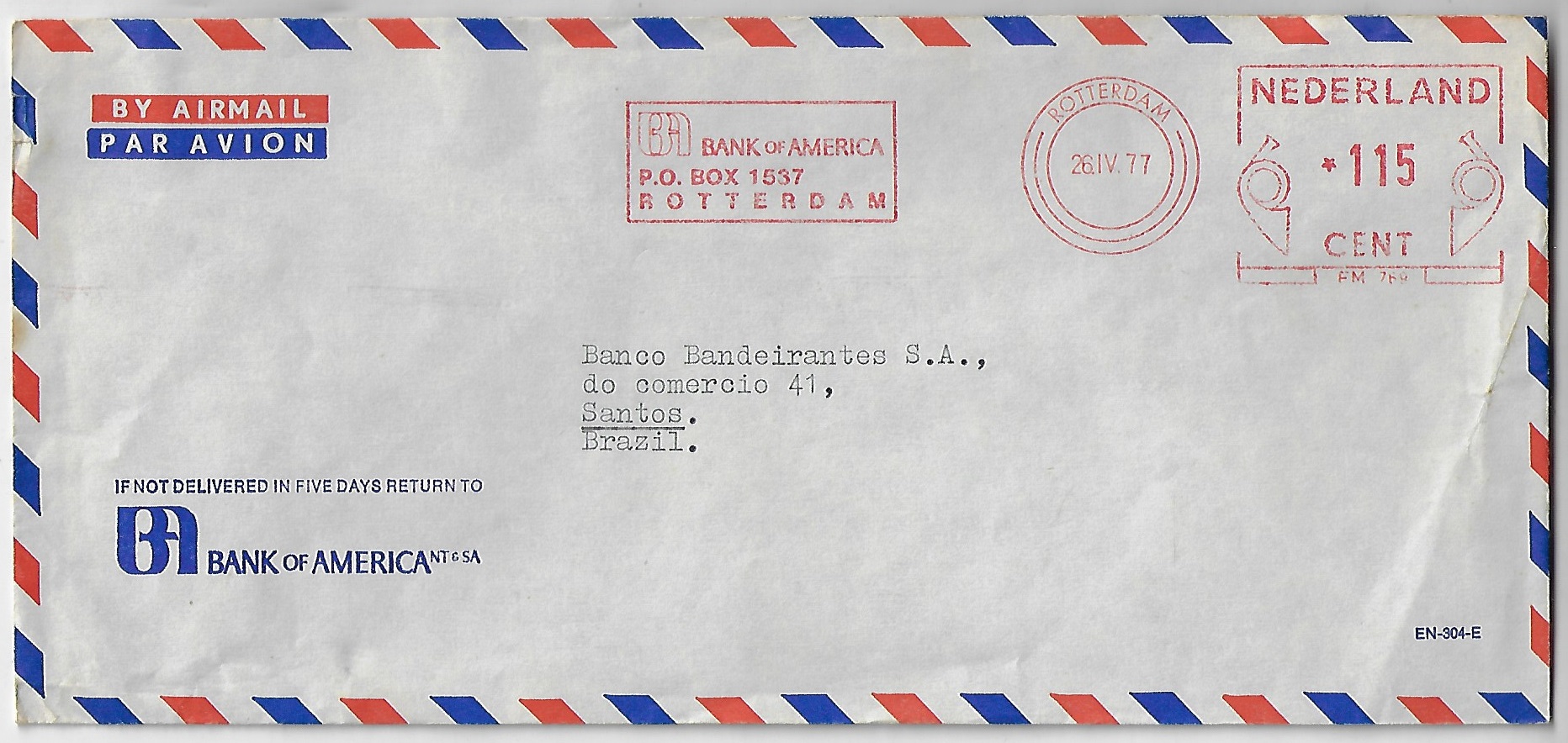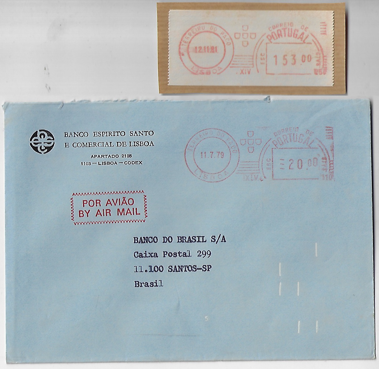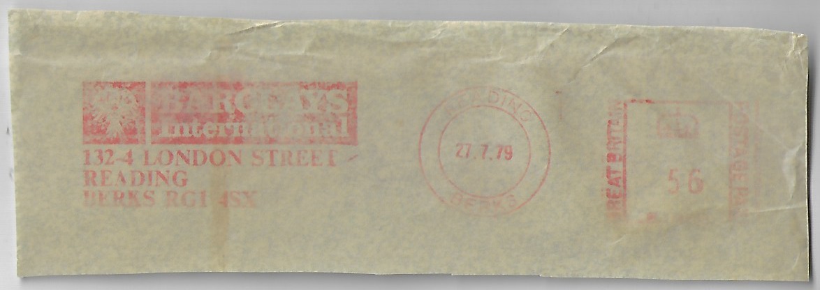 | 79678 | África do Sul, 1979, envelope aéreo enviado de Eppingust (13/7) para São Paulo, porteado com franquia mecânica Roneo Neopost "205/2205" com slogan Barclays National Bank Ltd | 10,00 | Foto |