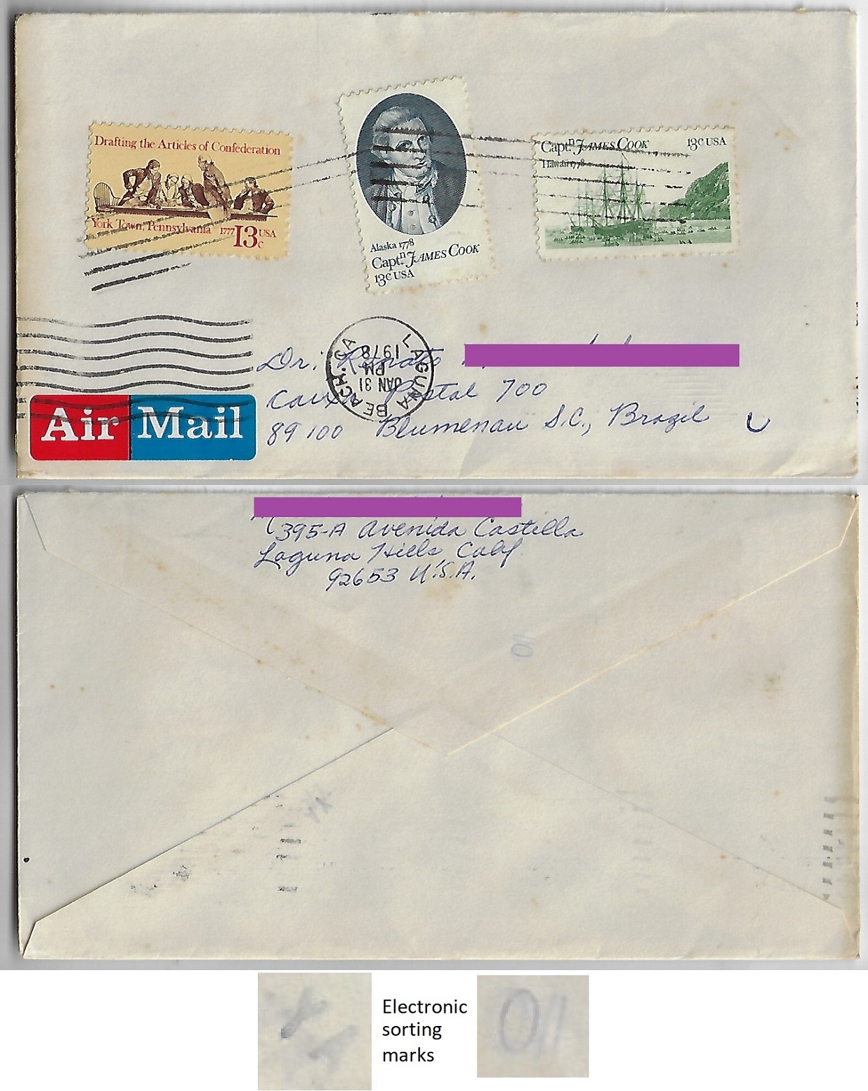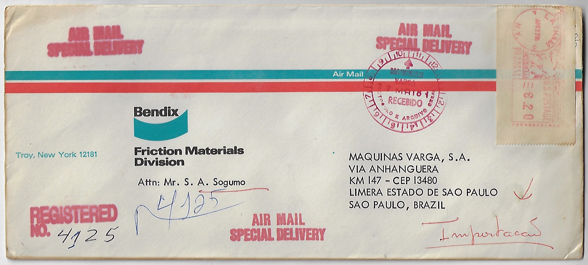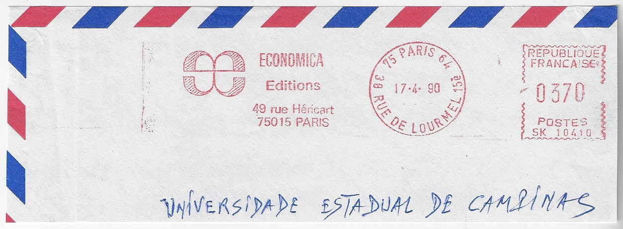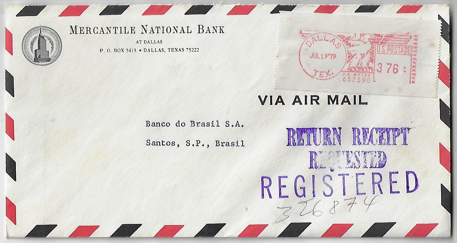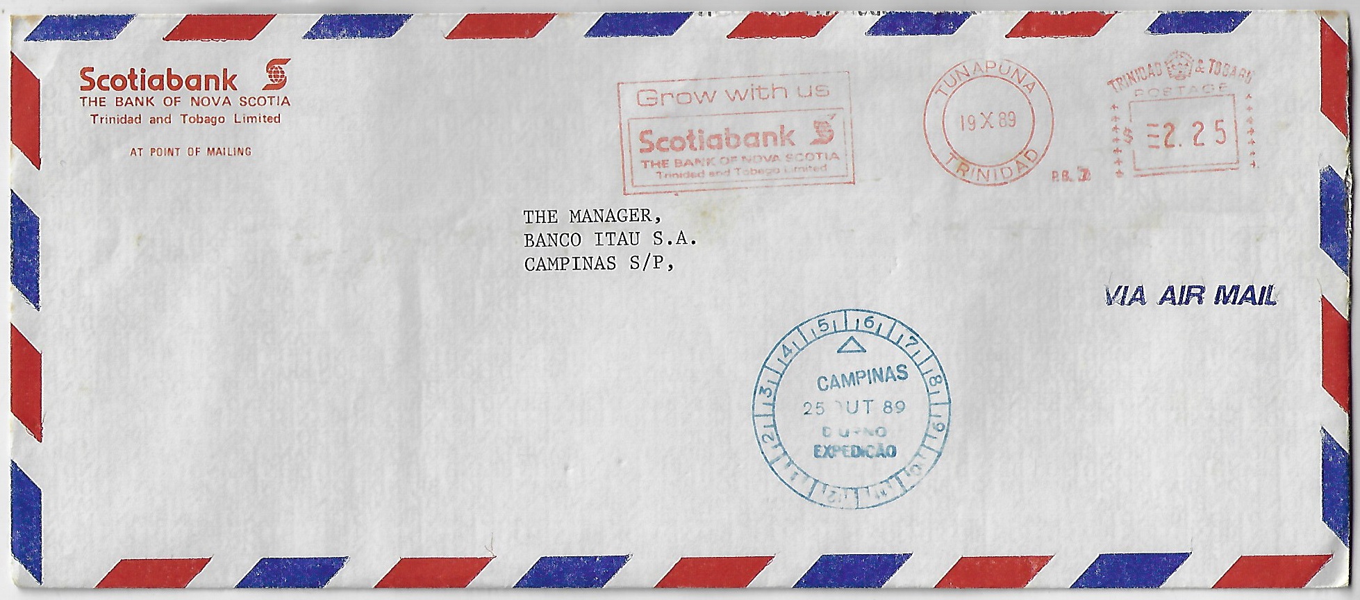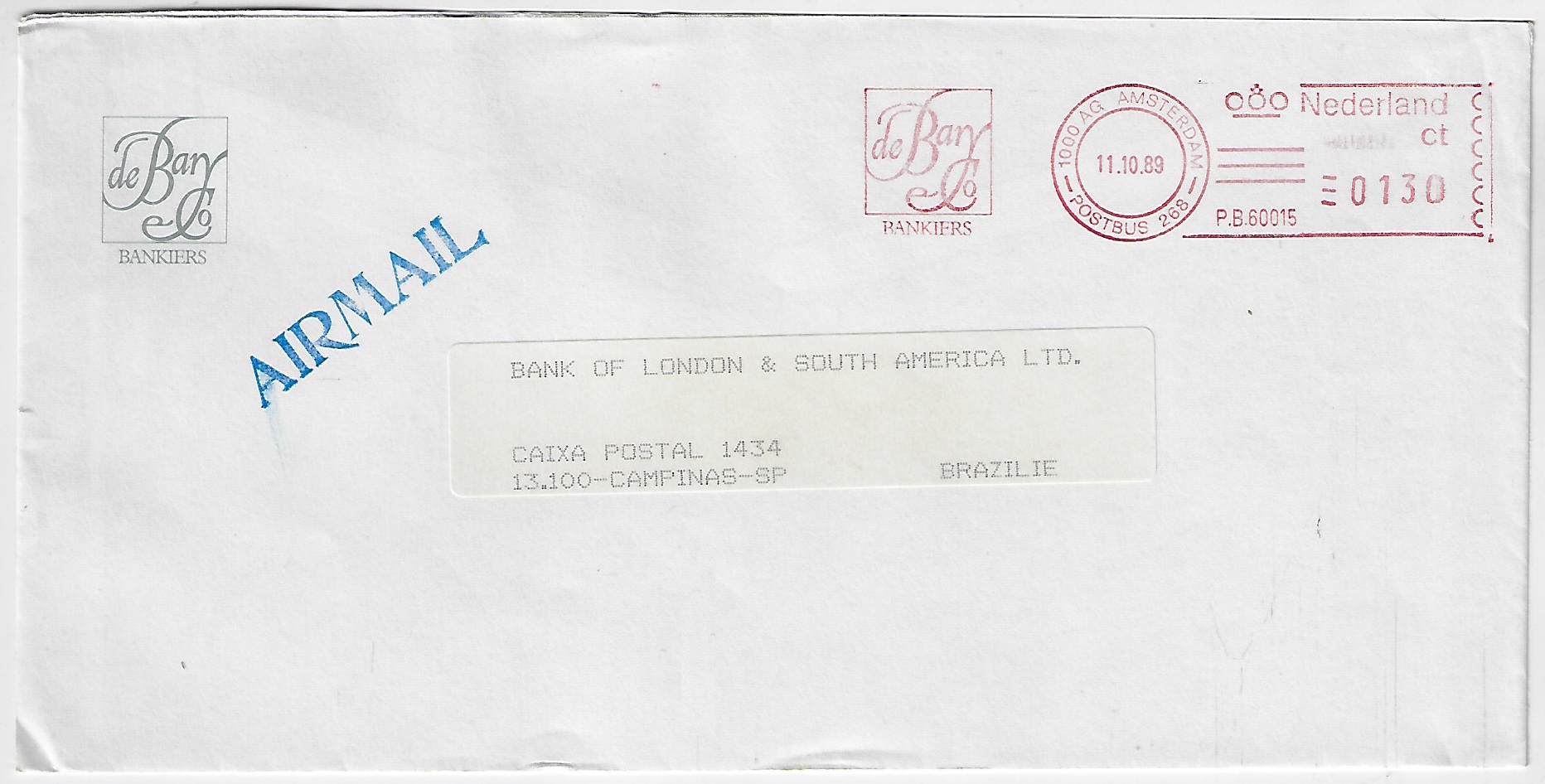 | 79678 | África do Sul, 1979, envelope aéreo enviado de Eppingust (13/7) para São Paulo, porteado com franquia mecânica Roneo Neopost "205/2205" com slogan Barclays National Bank Ltd | 10,00 | Foto |