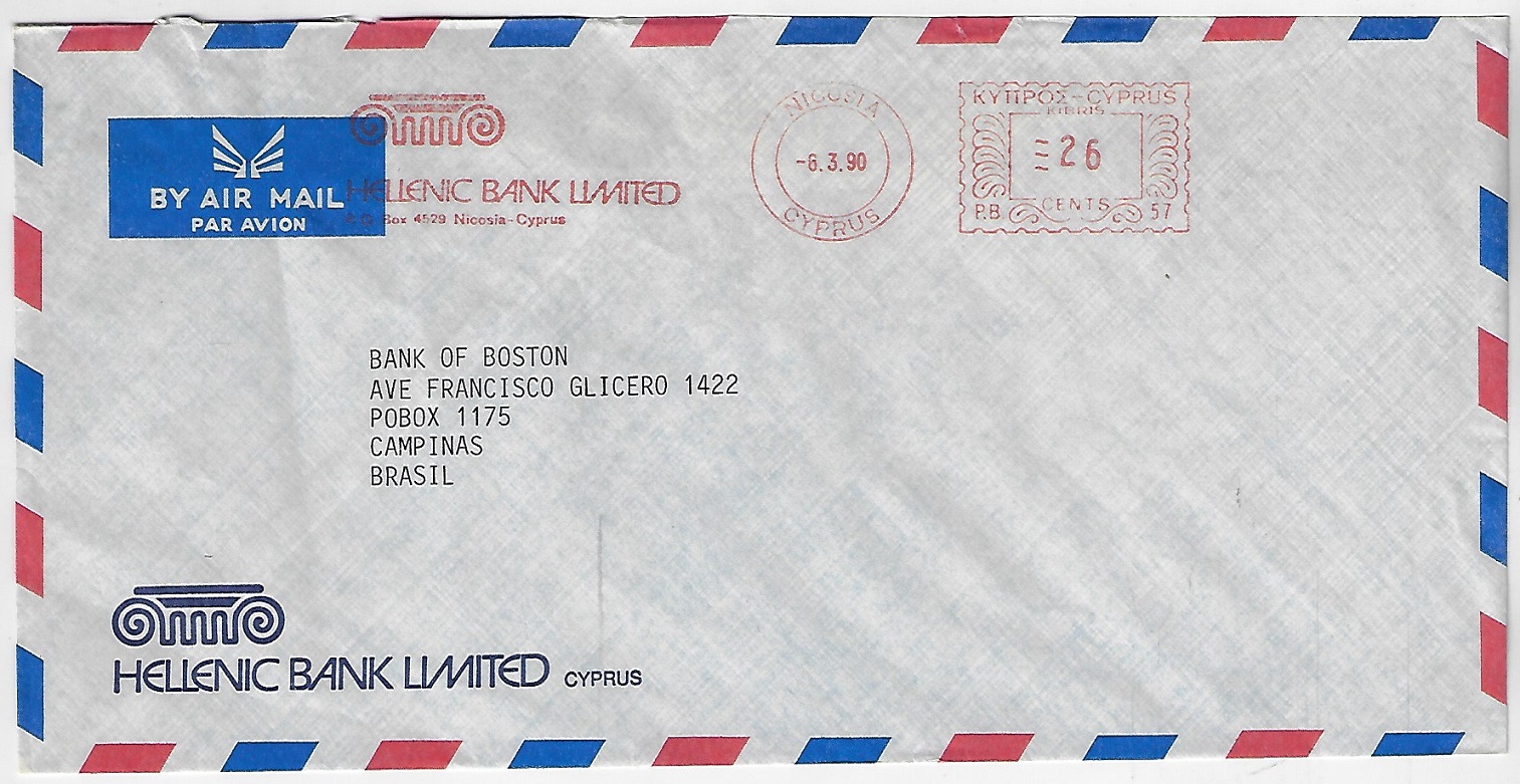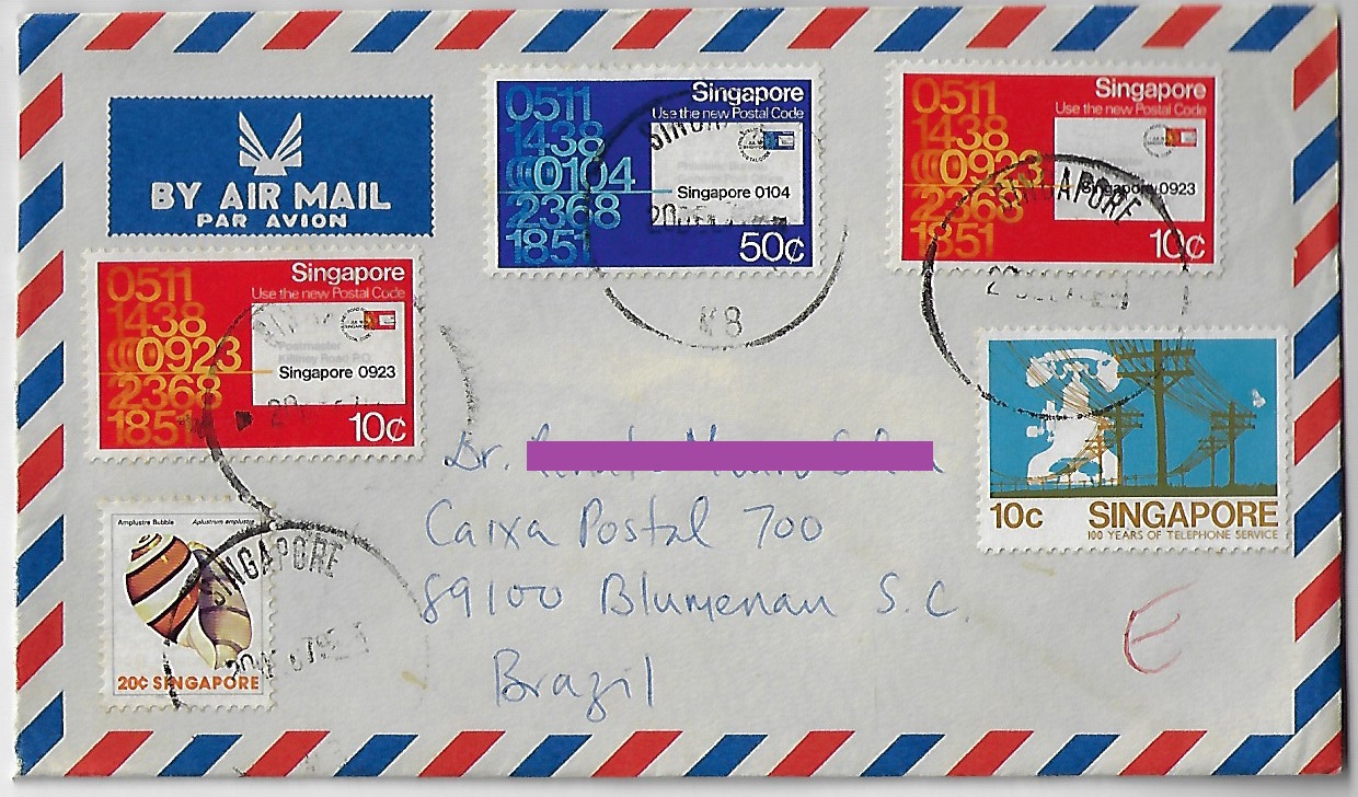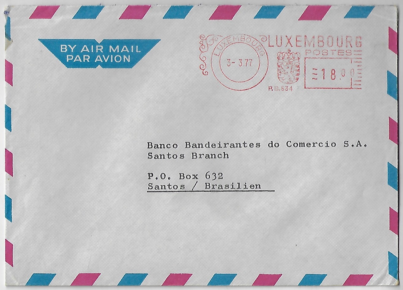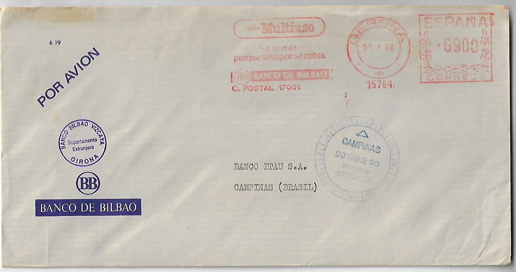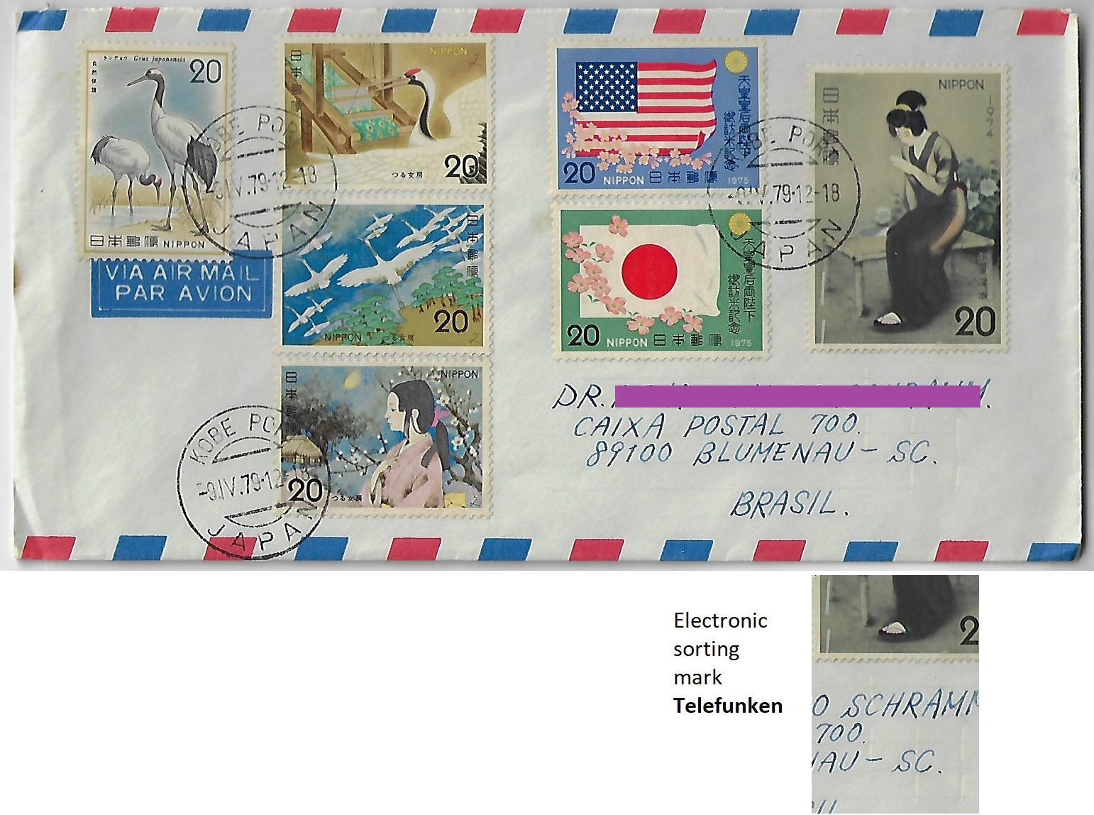 | 79678 | África do Sul, 1979, envelope aéreo enviado de Eppingust (13/7) para São Paulo, porteado com franquia mecânica Roneo Neopost "205/2205" com slogan Barclays National Bank Ltd | 10,00 | Foto |
