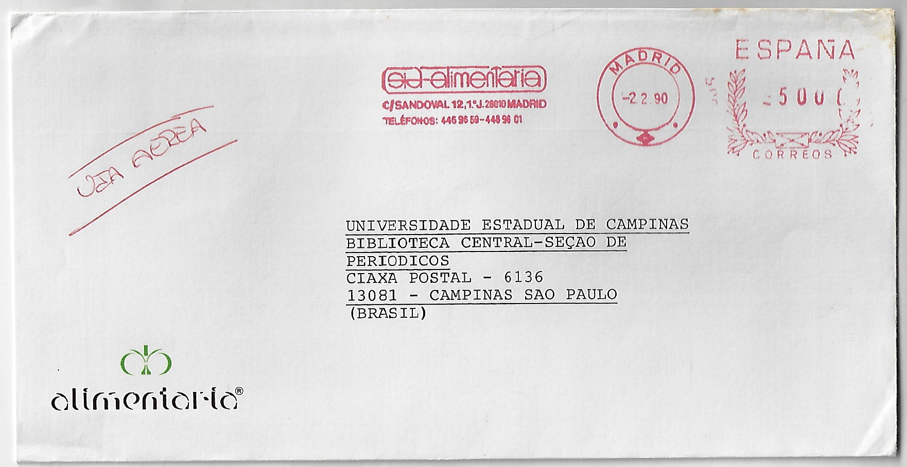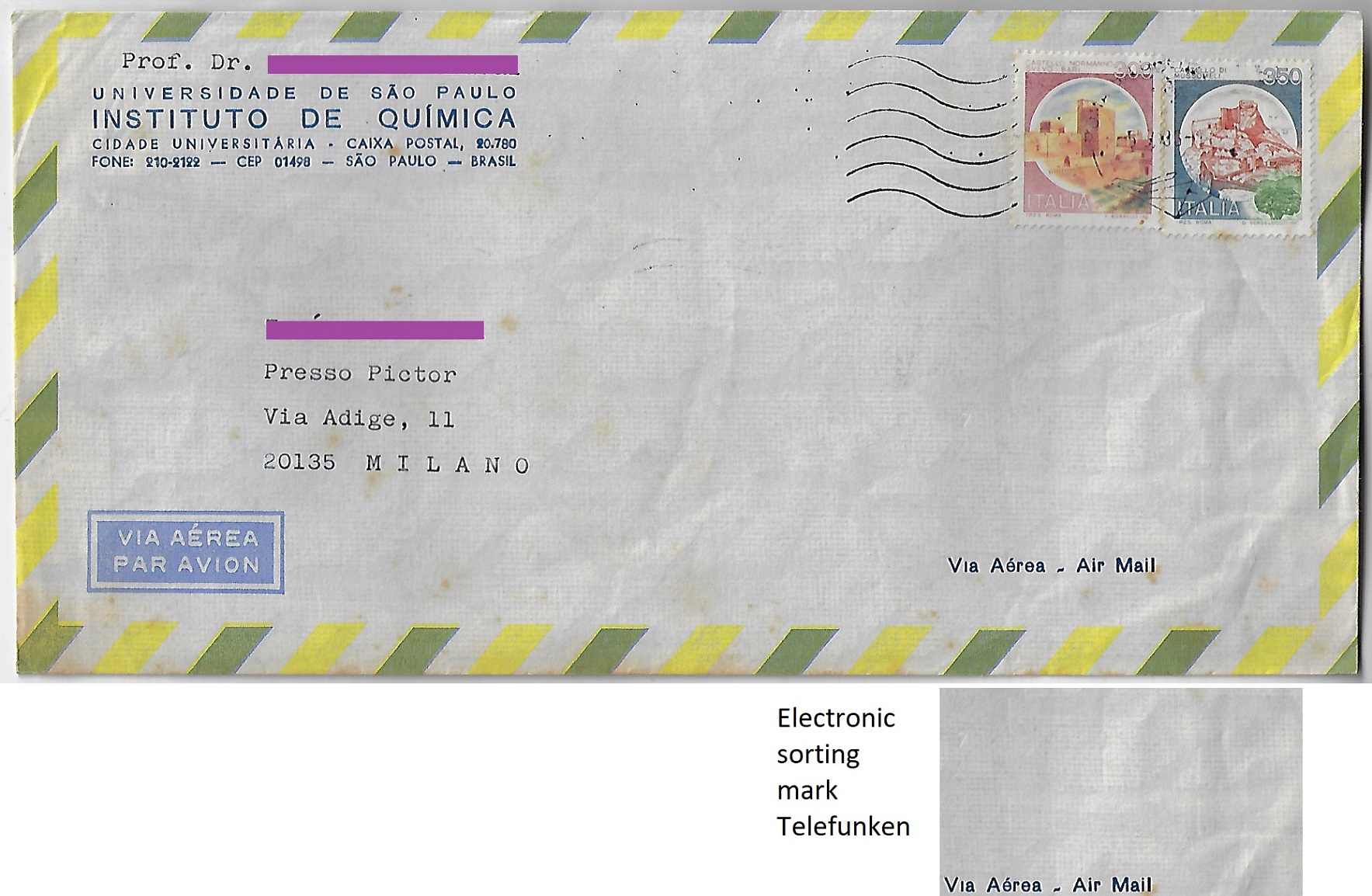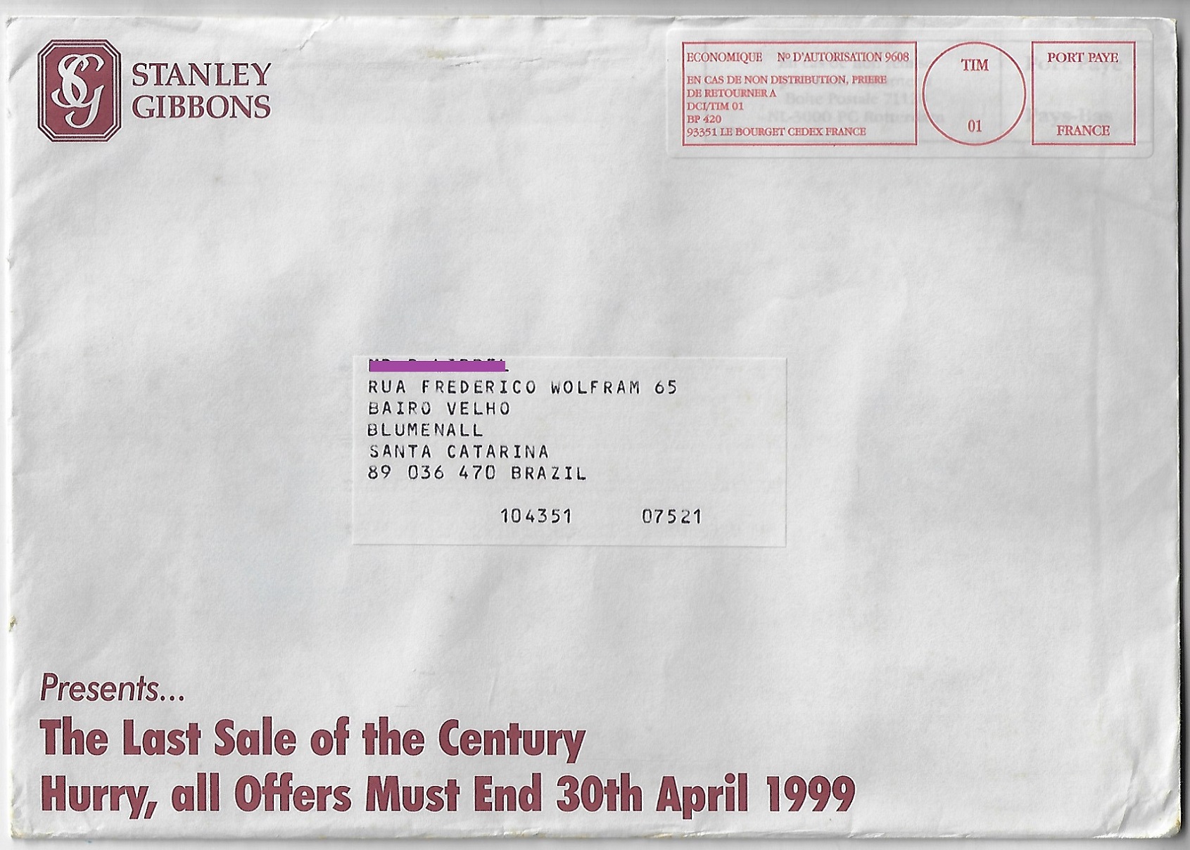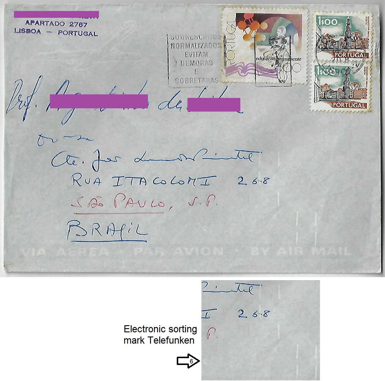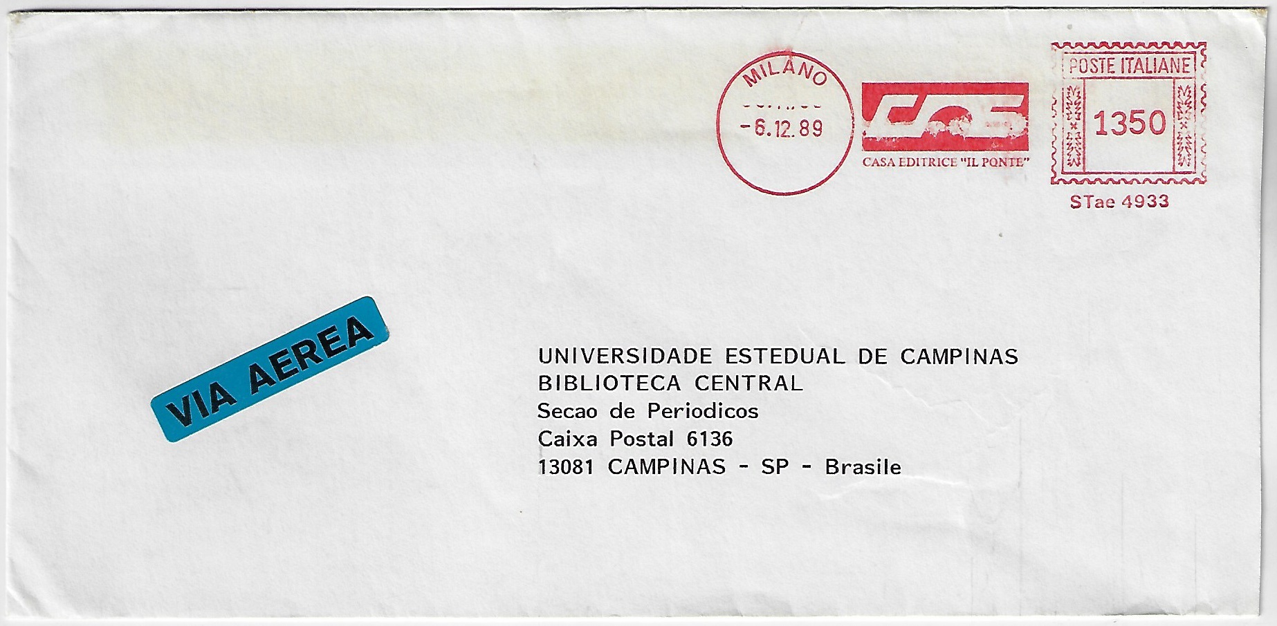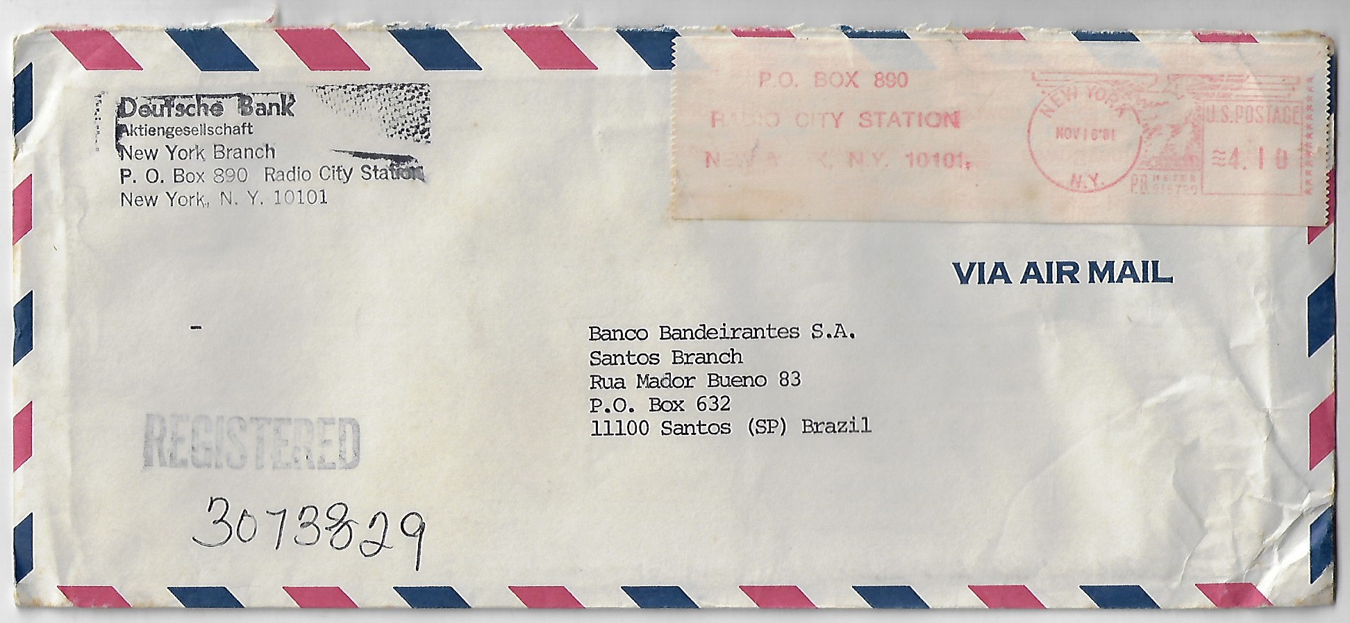| 79678 | África do Sul, 1979, envelope aéreo enviado de Eppingust (13/7) para São Paulo, porteado com franquia mecânica Roneo Neopost "205/2205" com slogan Barclays National Bank Ltd | 10,00 | Foto |