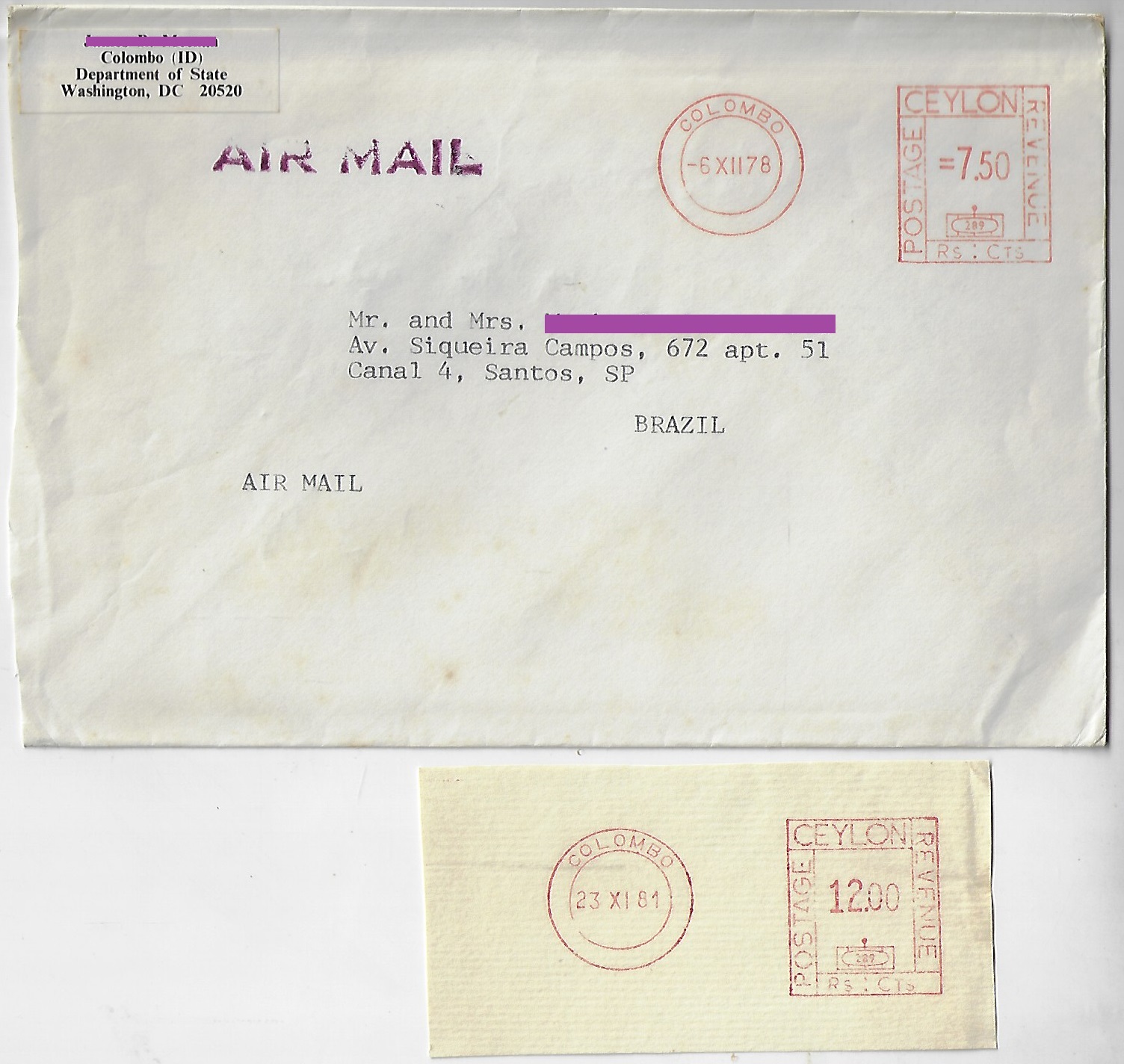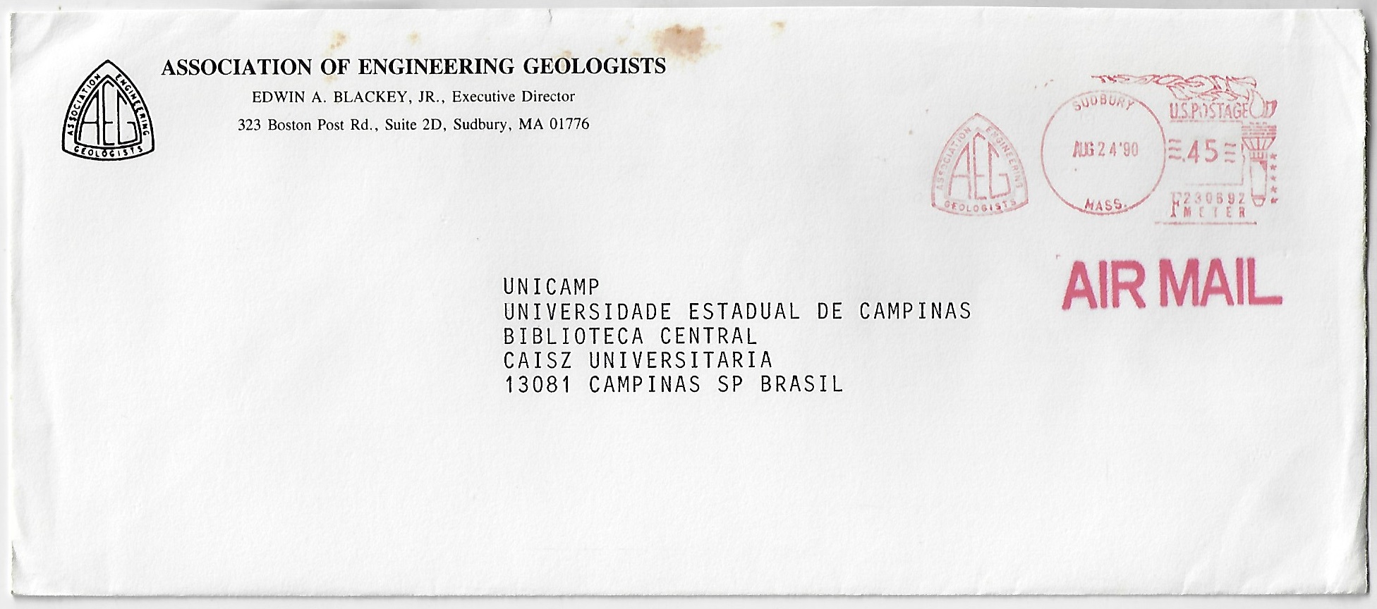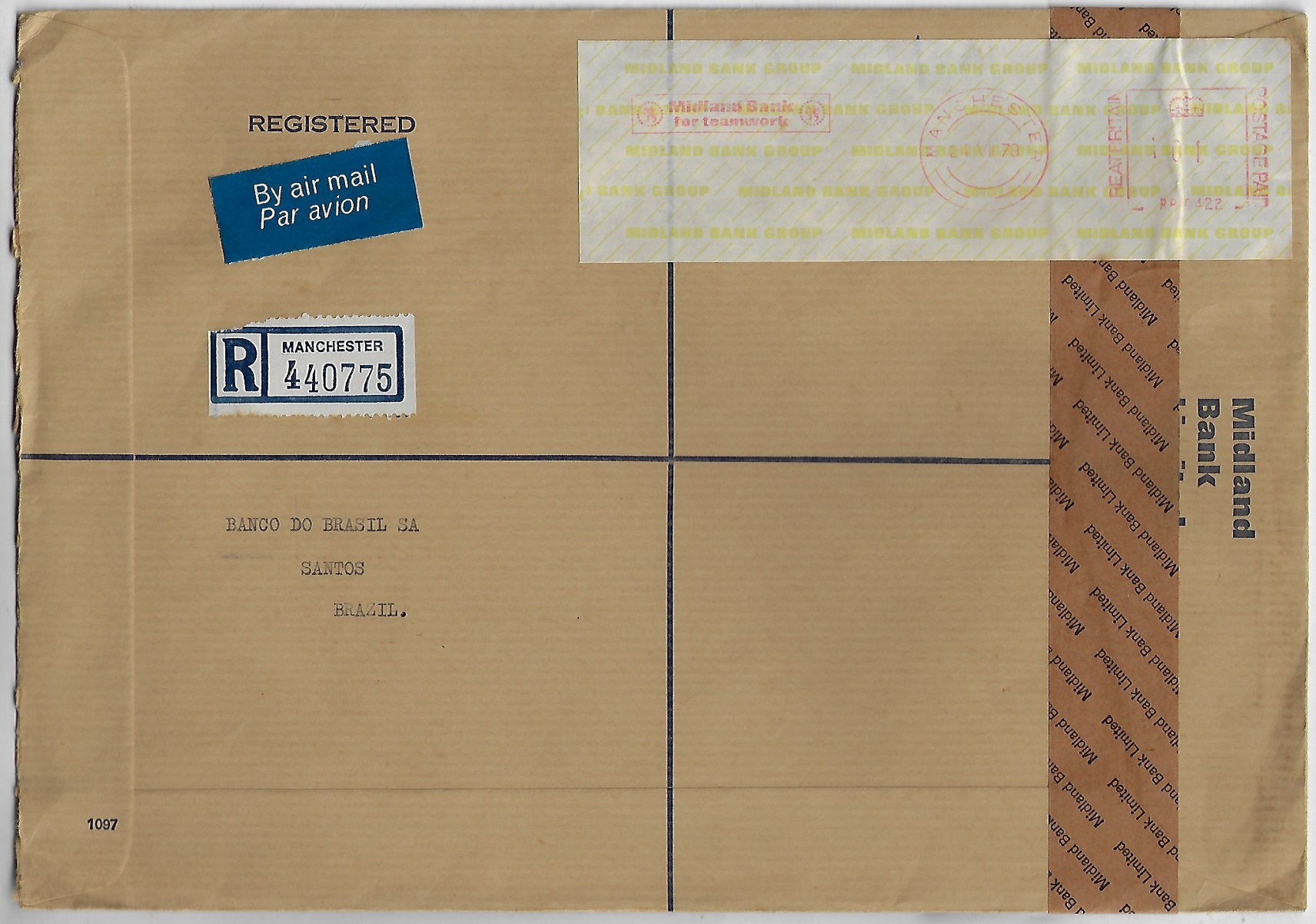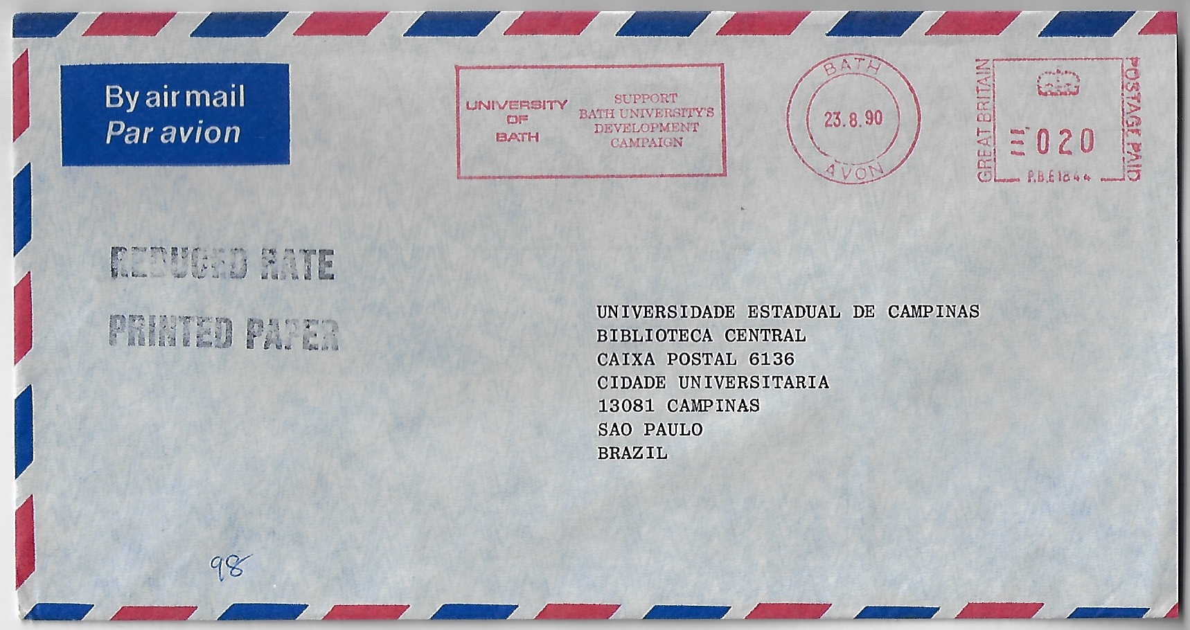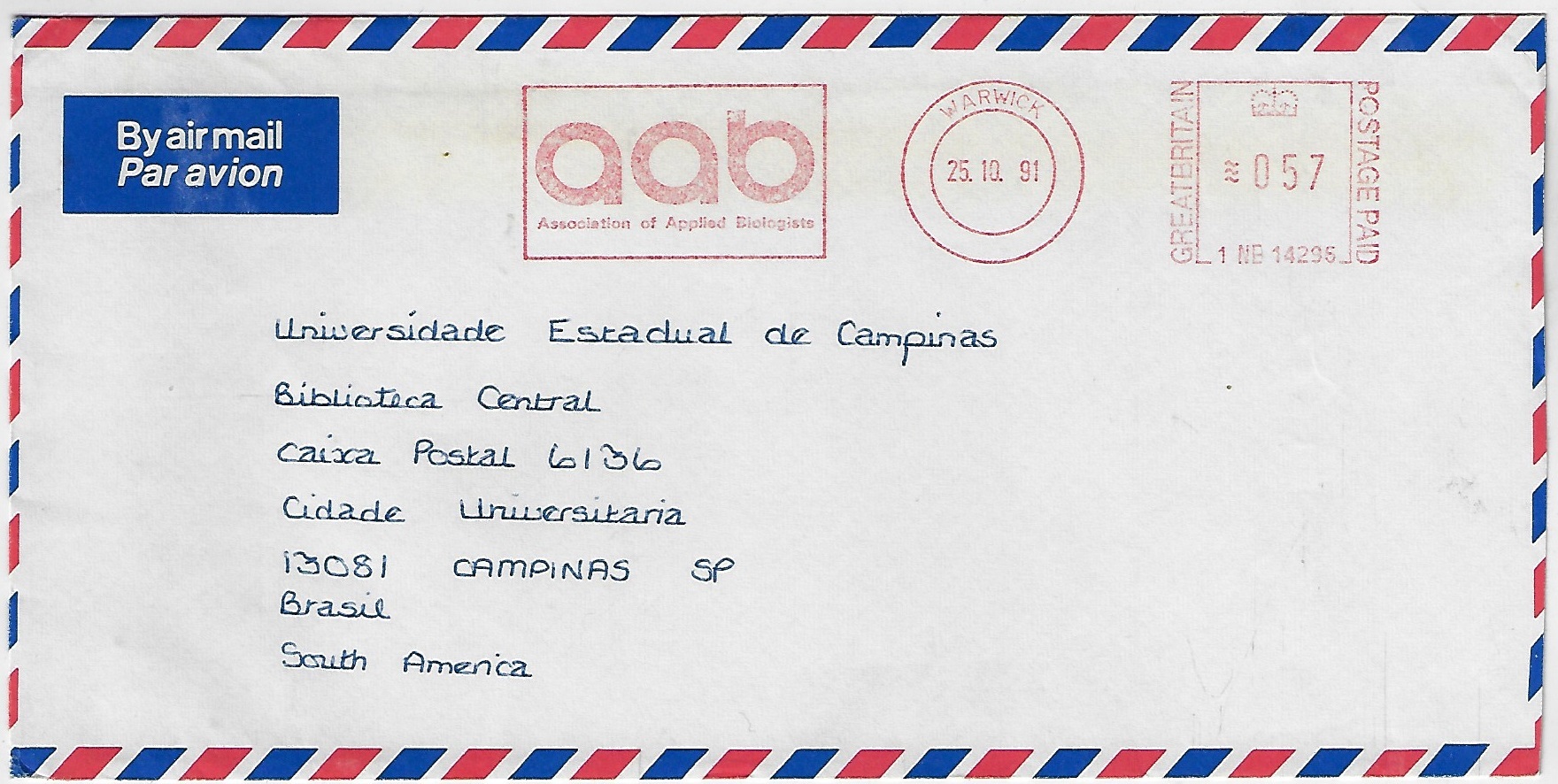 | 79678 | África do Sul, 1979, envelope aéreo enviado de Eppingust (13/7) para São Paulo, porteado com franquia mecânica Roneo Neopost "205/2205" com slogan Barclays National Bank Ltd | 10,00 | Foto |